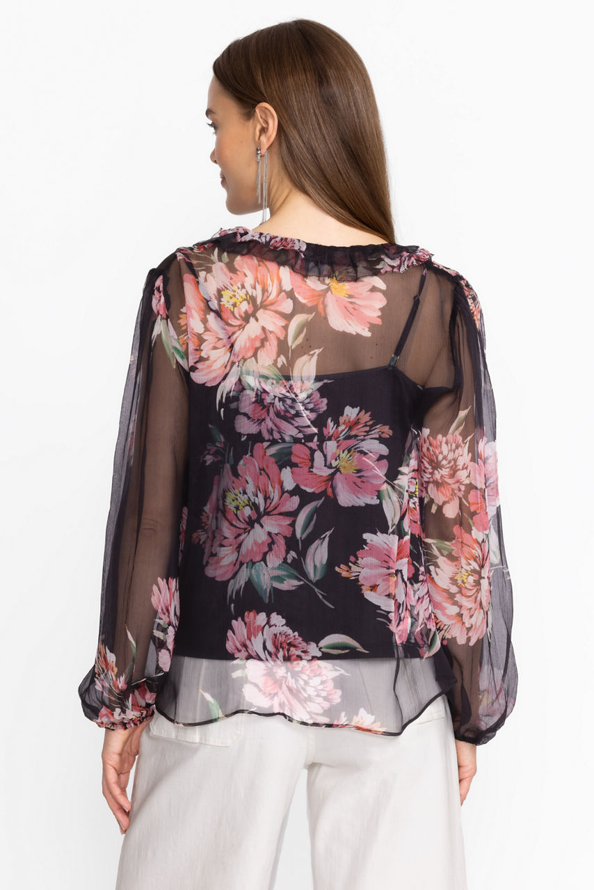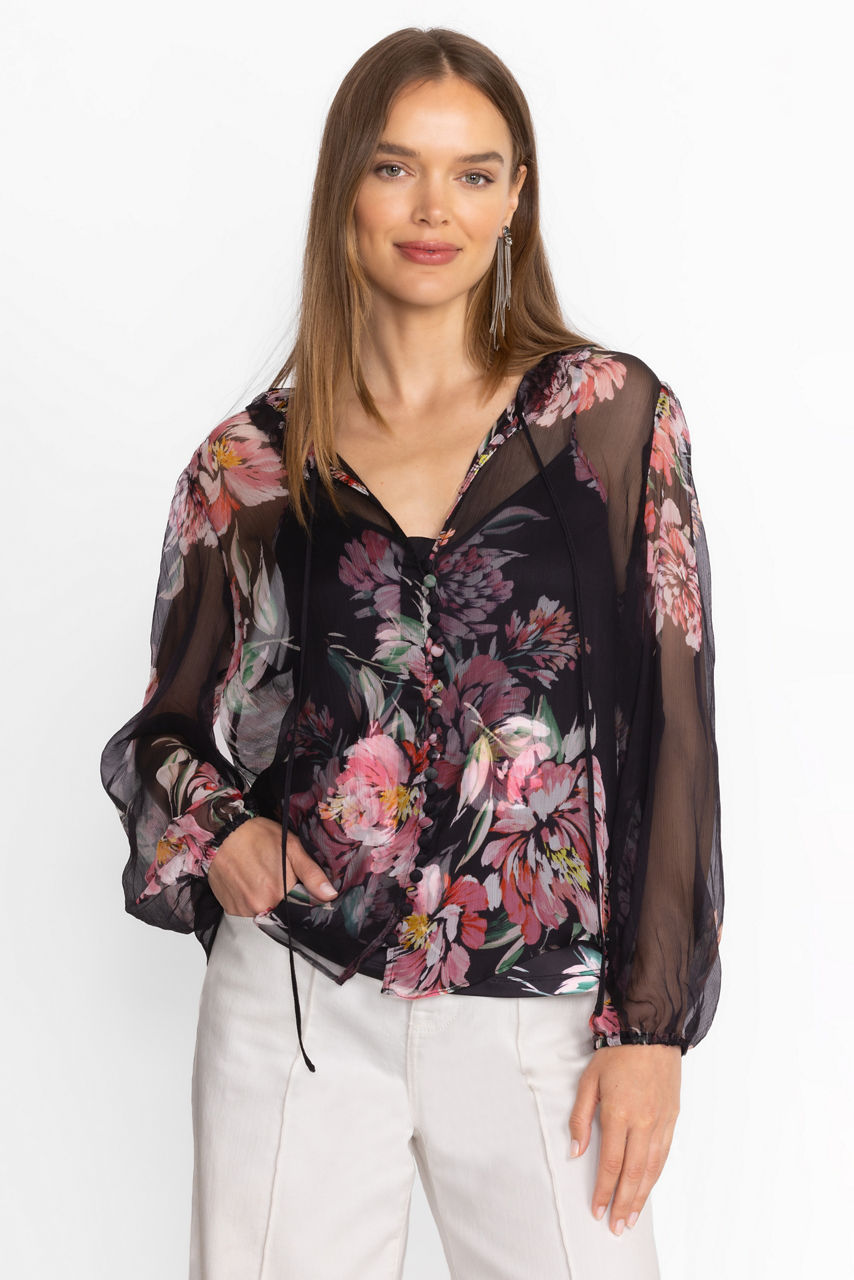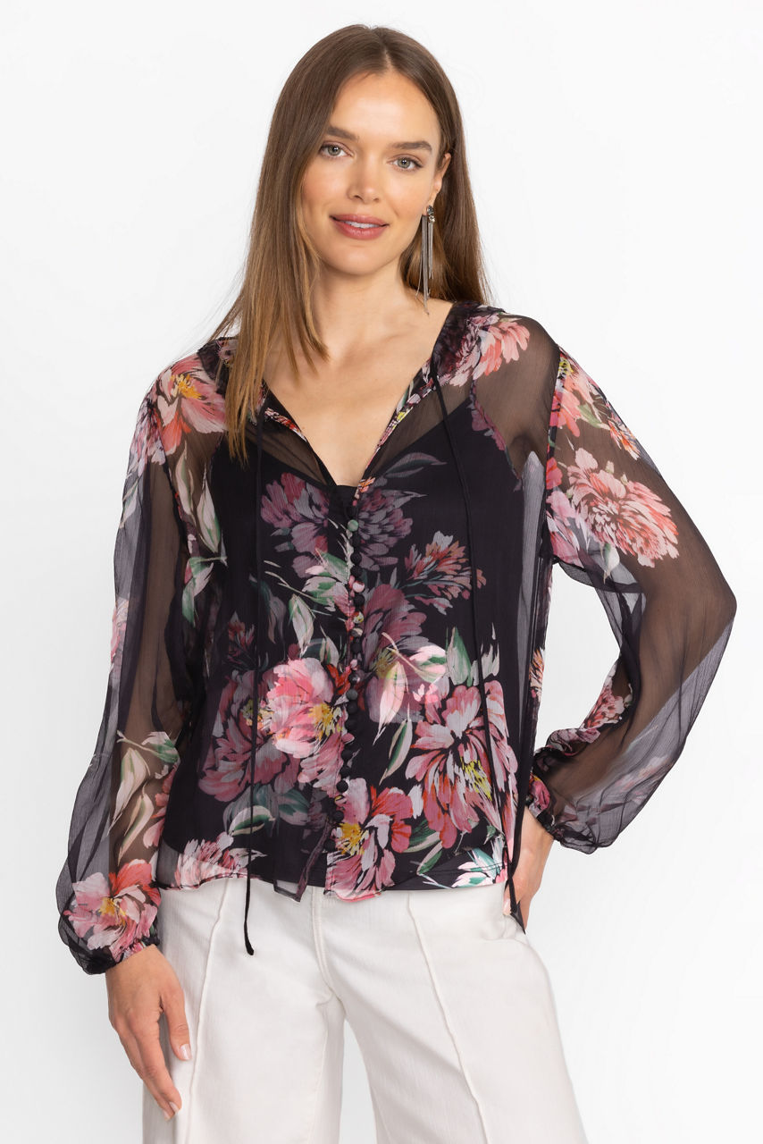Crafted from 100% sumptuous silk, the Jaycee Peasant Blouse is adorned with delicate pink floral blooms. Featuring intricate ruffles at the neck and gathered sleeves, this slip-lined blouse is finished with fabric covered buttons and loops. Pair with a classic pencil skirt and black pumps for a polished workday ensemble.