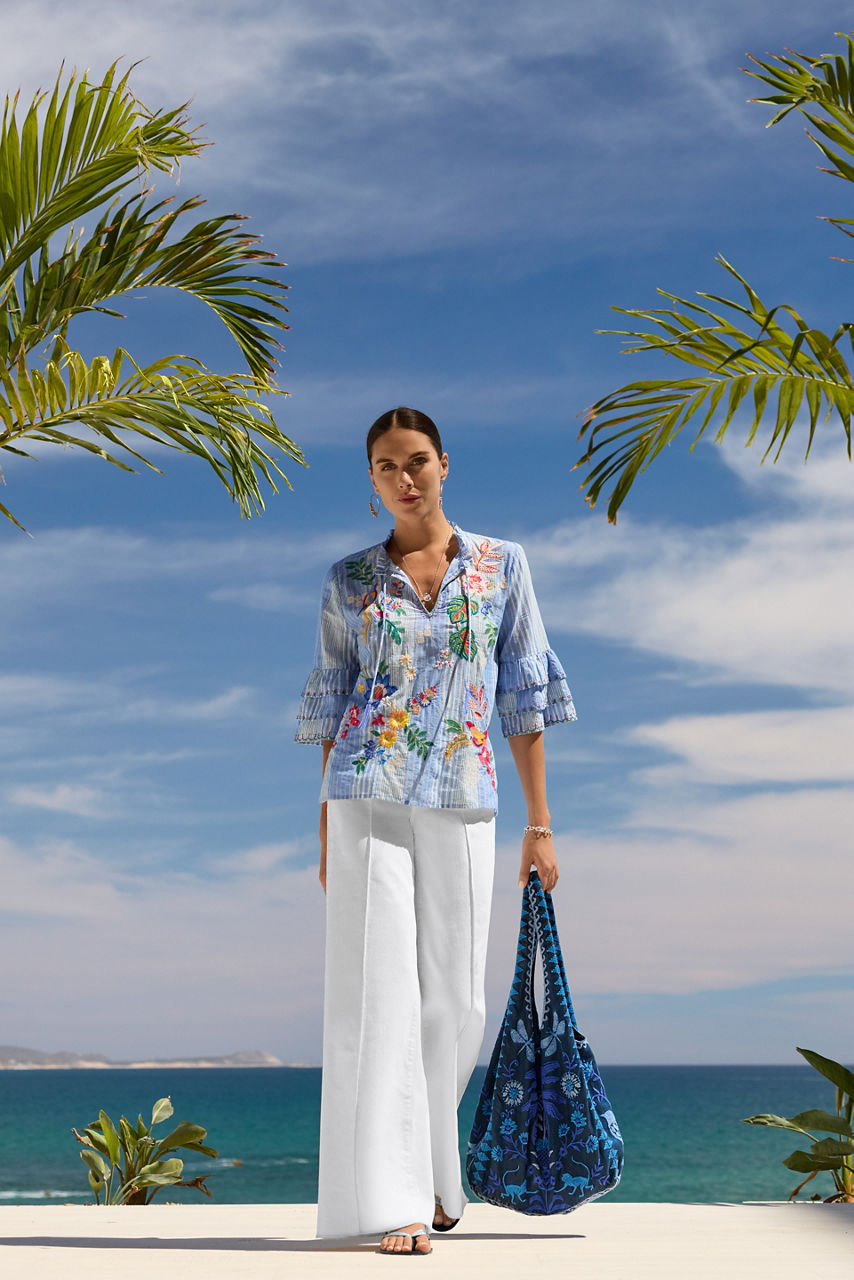 Offering understated sophistication, the Jeanette Ruffle Sleeve Blouse is crafted from a soft cotton blend. Featuring a split V-neck and ruffle sleeves, this embroidered top is adorned with floral bursts atop a subtly striped backdrop. Pair with tailored trousers or shorts for an elevated ensemble.