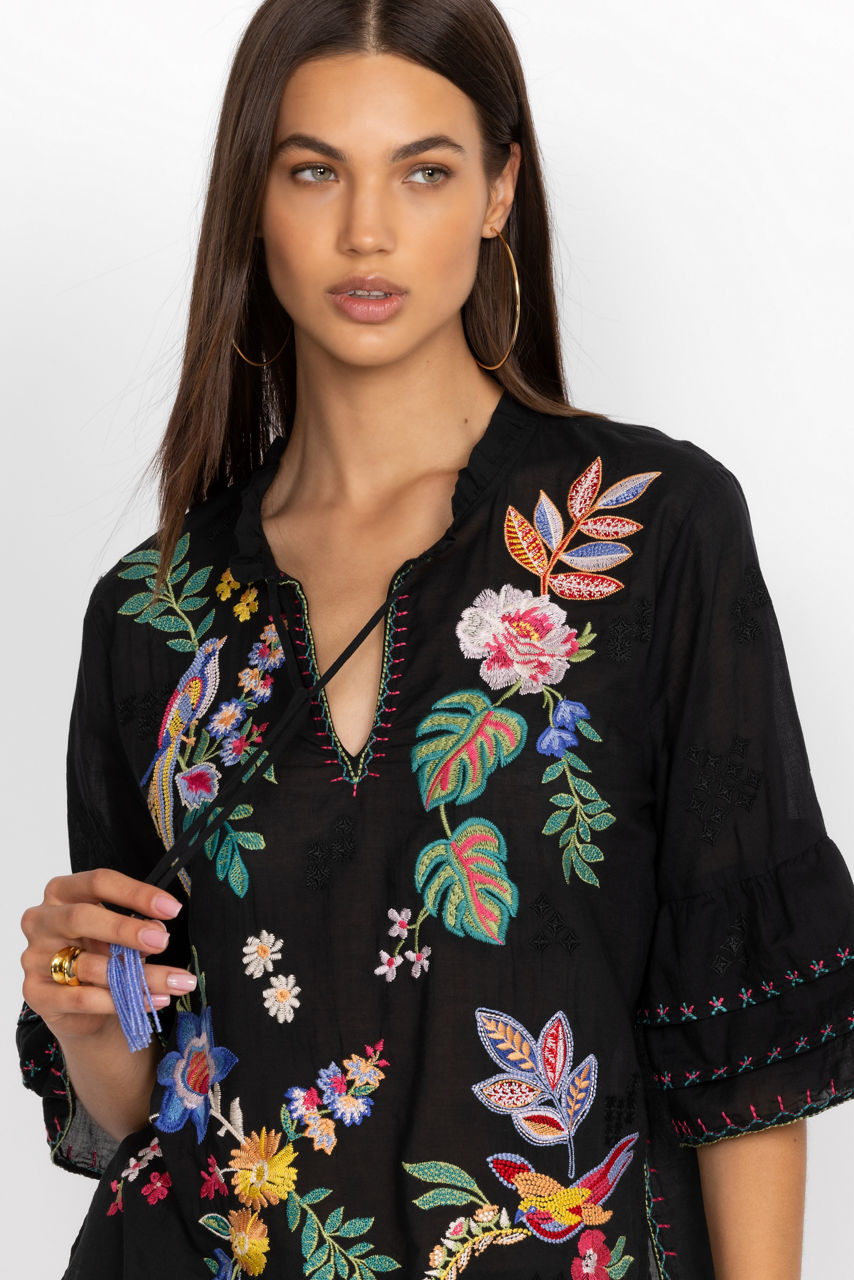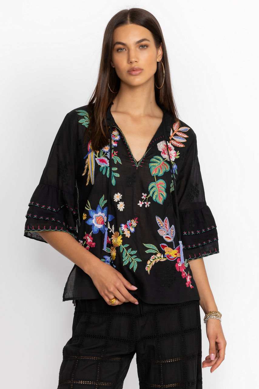 Crafted from 100% cotton, the Jeanette Ruffle Sleeve Blouse offers a twist on a classic silhouette. This embroidered split V-neck with tassels and ruffle sleeves features bright floral patterns against a dark backdrop. Pair with light trousers for a contrasting look.