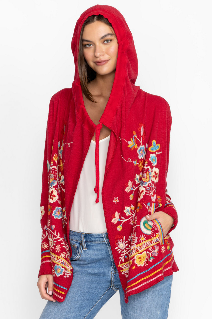 Designed from pure cotton, the Jemima Hoodie puts a joyful spin on a timeless off-duty favorite. This hoodie adopts a deep crimson colorway and features a hood, long sleeves, and an intricate placement embroidery consisting of colorful motifs. Style with a tee and joggers for a stylish downtime look or layer under a coat on cooler days.