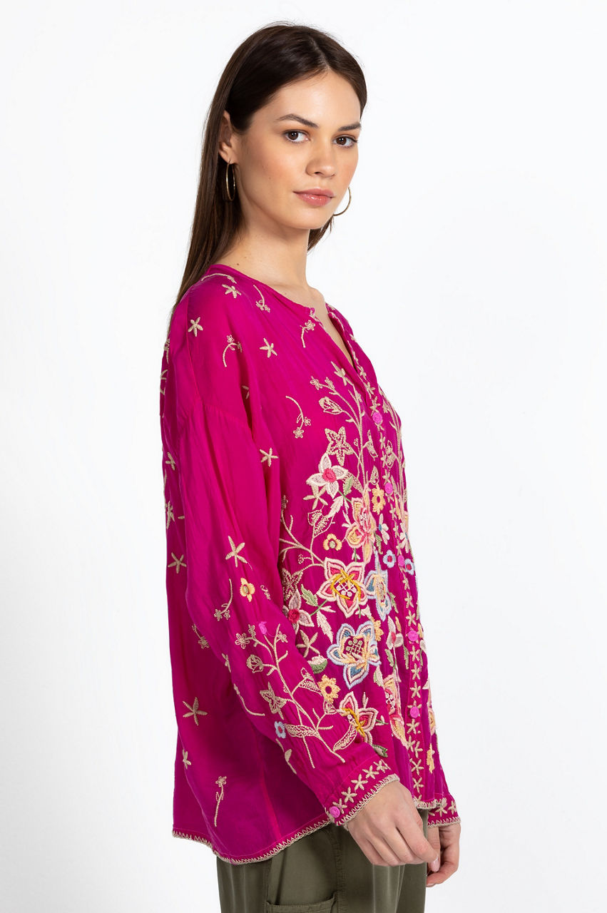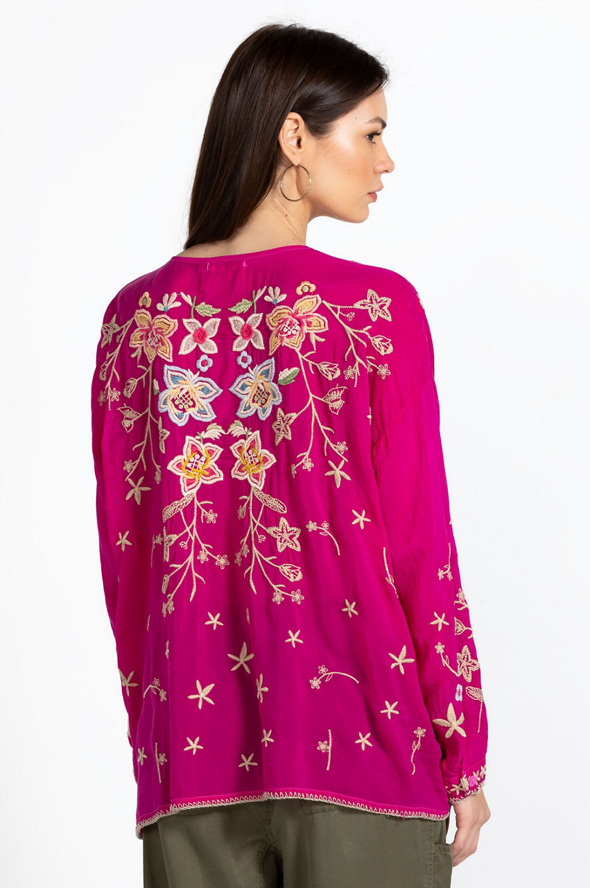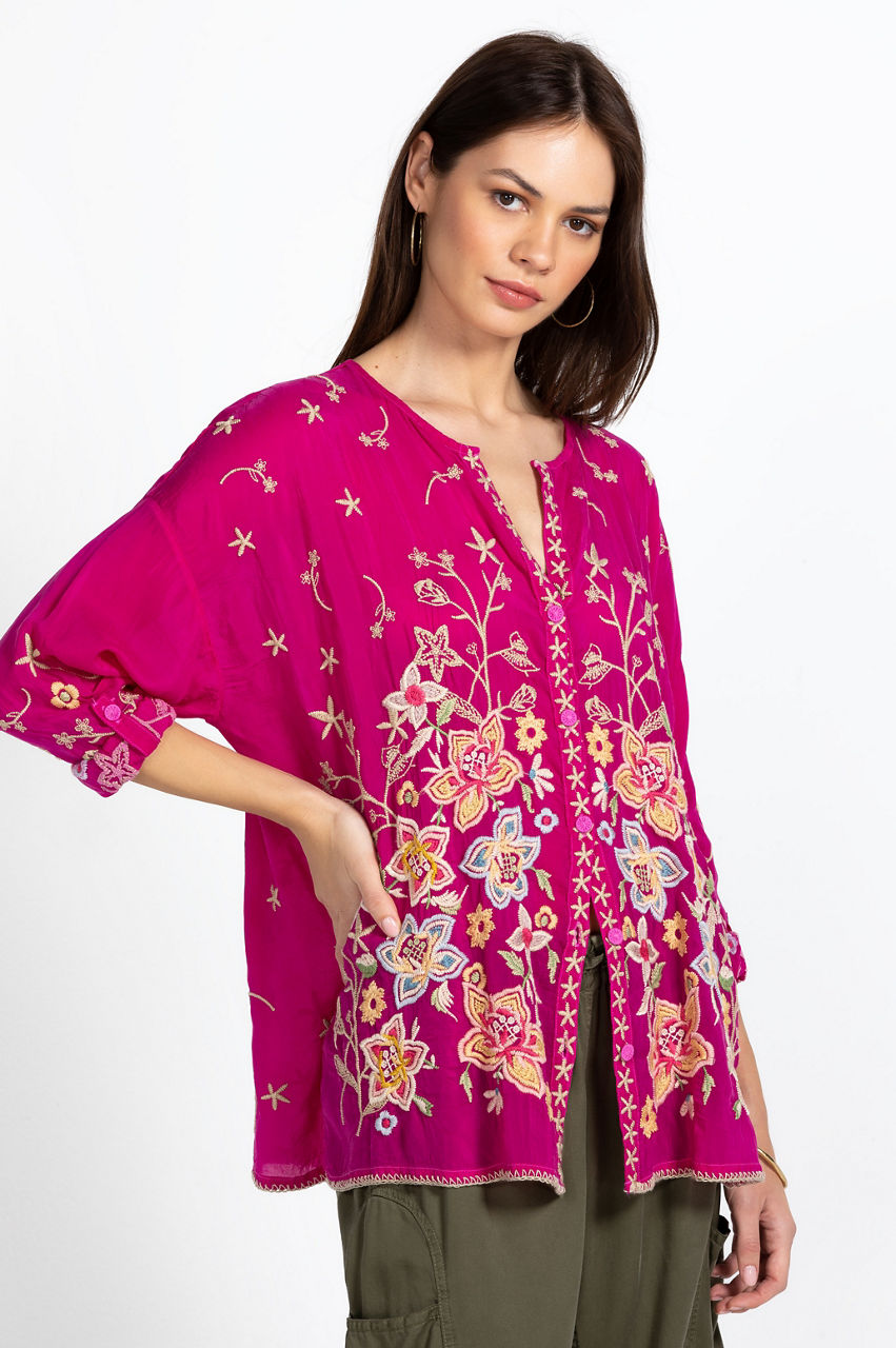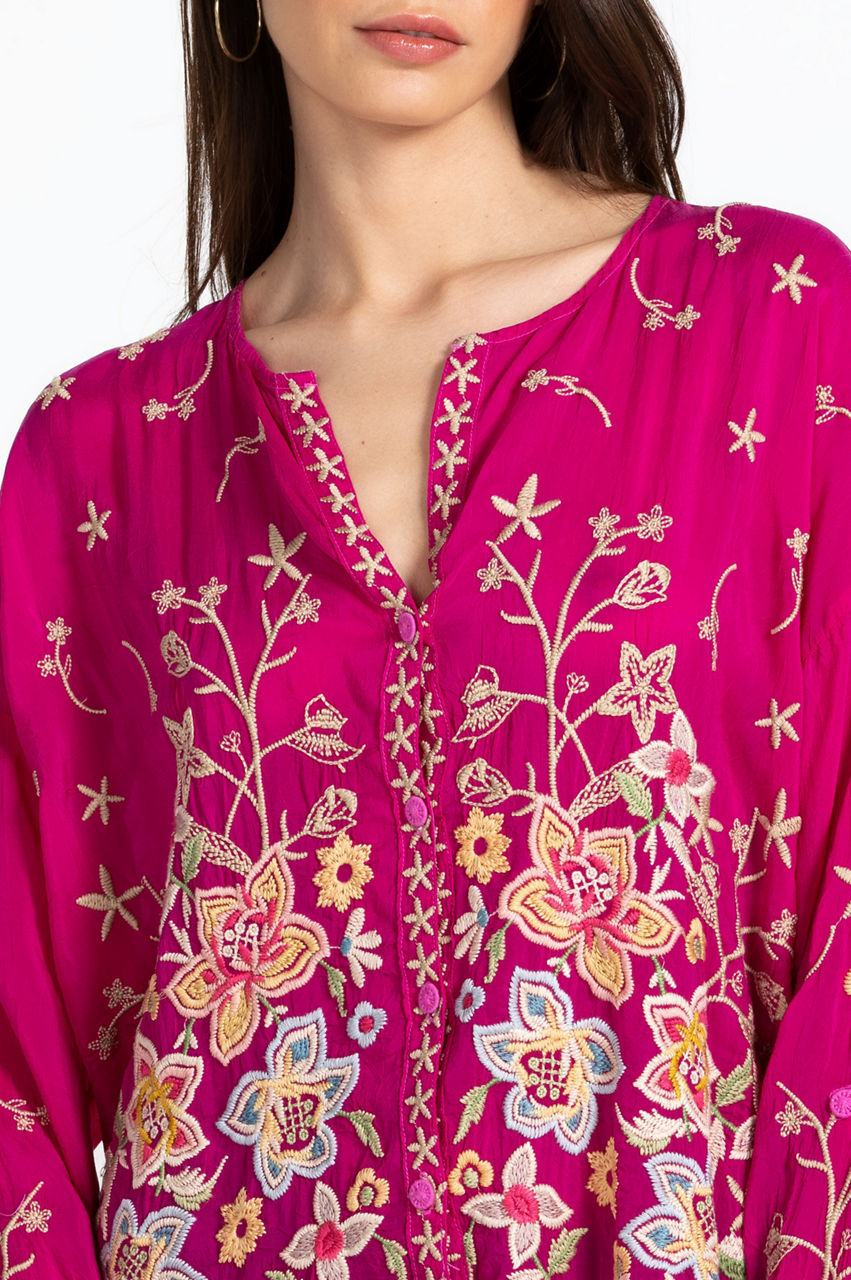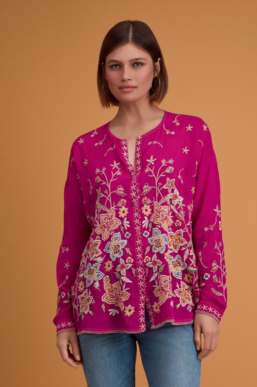 Relaxed in its construction and bold in color, the Jenai Blouse is emphasized by antique florals in rich hues. Equal parts casual and elegant, this blouse is made from flowy rayon with an open V-shaped collar, a front button fastening, long sleeves, and an intricate placement embroidery. Throw on with jeans for a nonchalant daytime look or pair with shorts on your next warm weather escape.