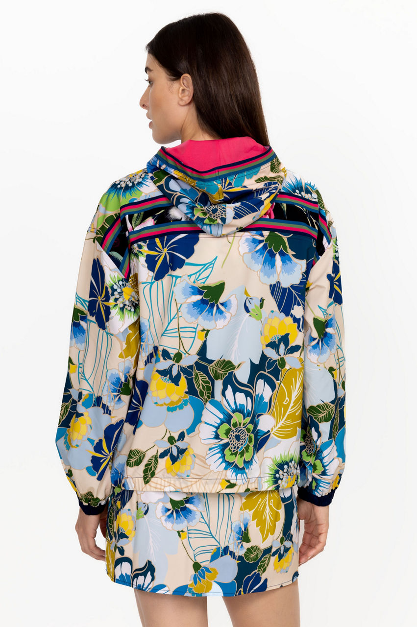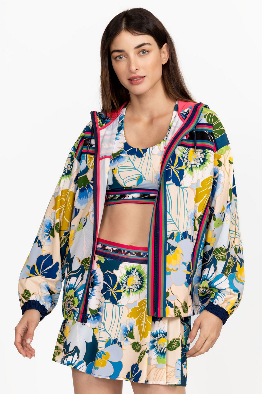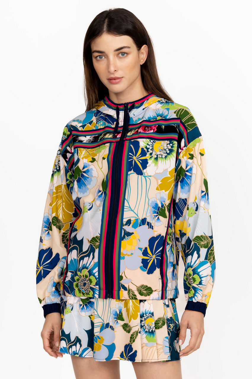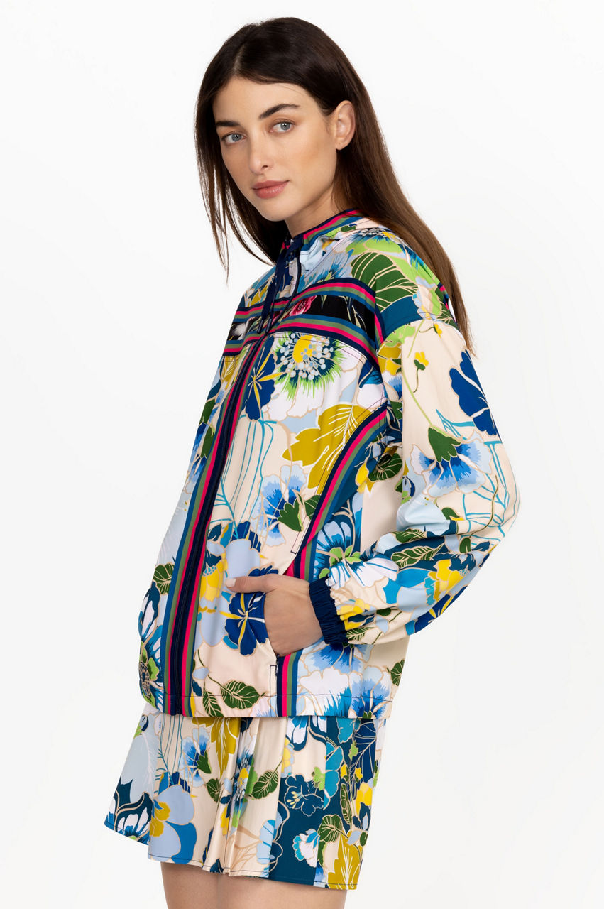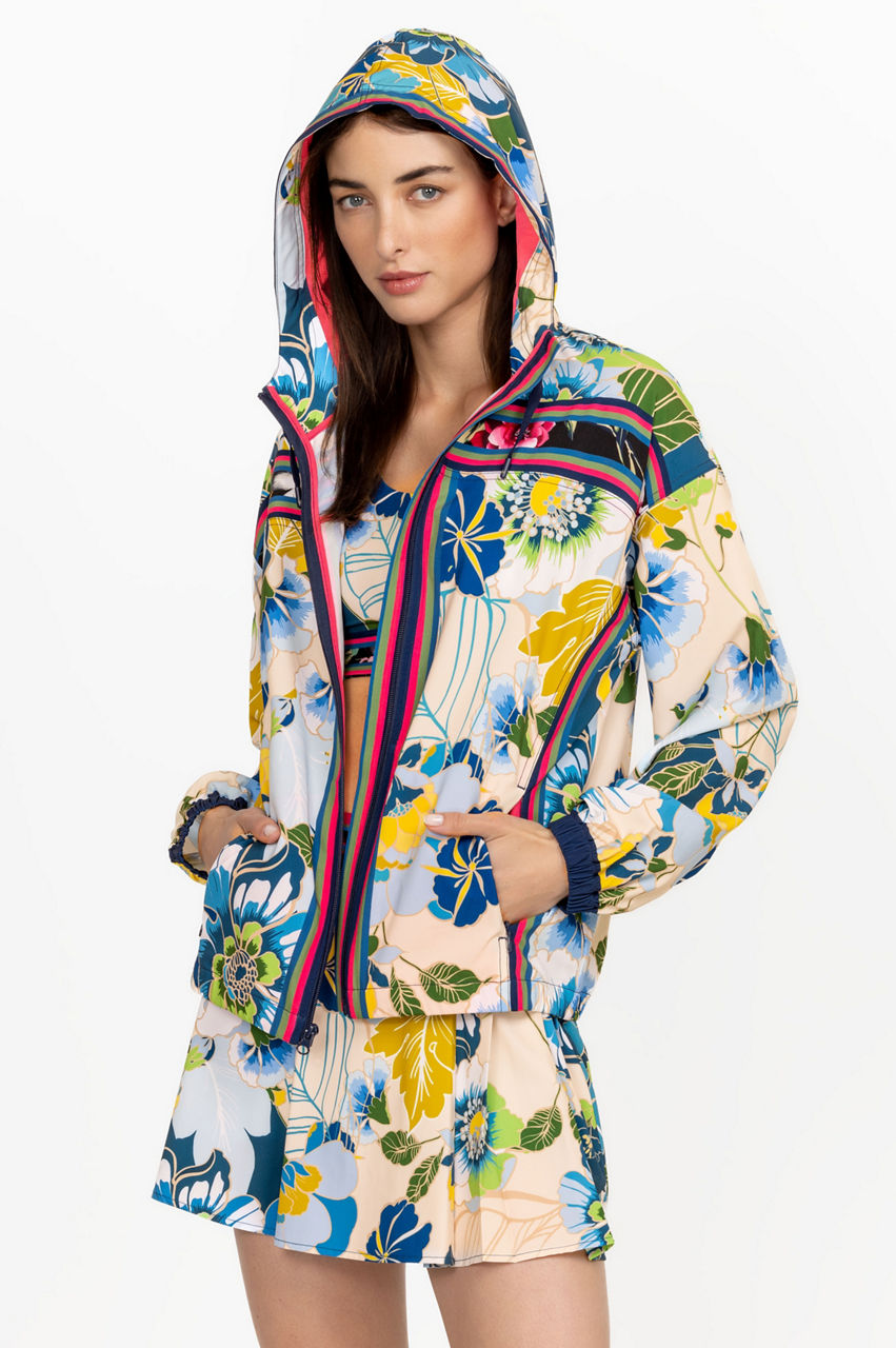 Cut in a regular fit, the Jen Full Zip Jacket effortlessly combines a tropical mood with traditional sports-inspired finishes. This jacket is made from a lightweight yet insulating material and features a hood, long sleeves, a striped design, and exotic blooms in a bright color scheme. Wear with a printed skirt or opt for leggings during the cooler months.