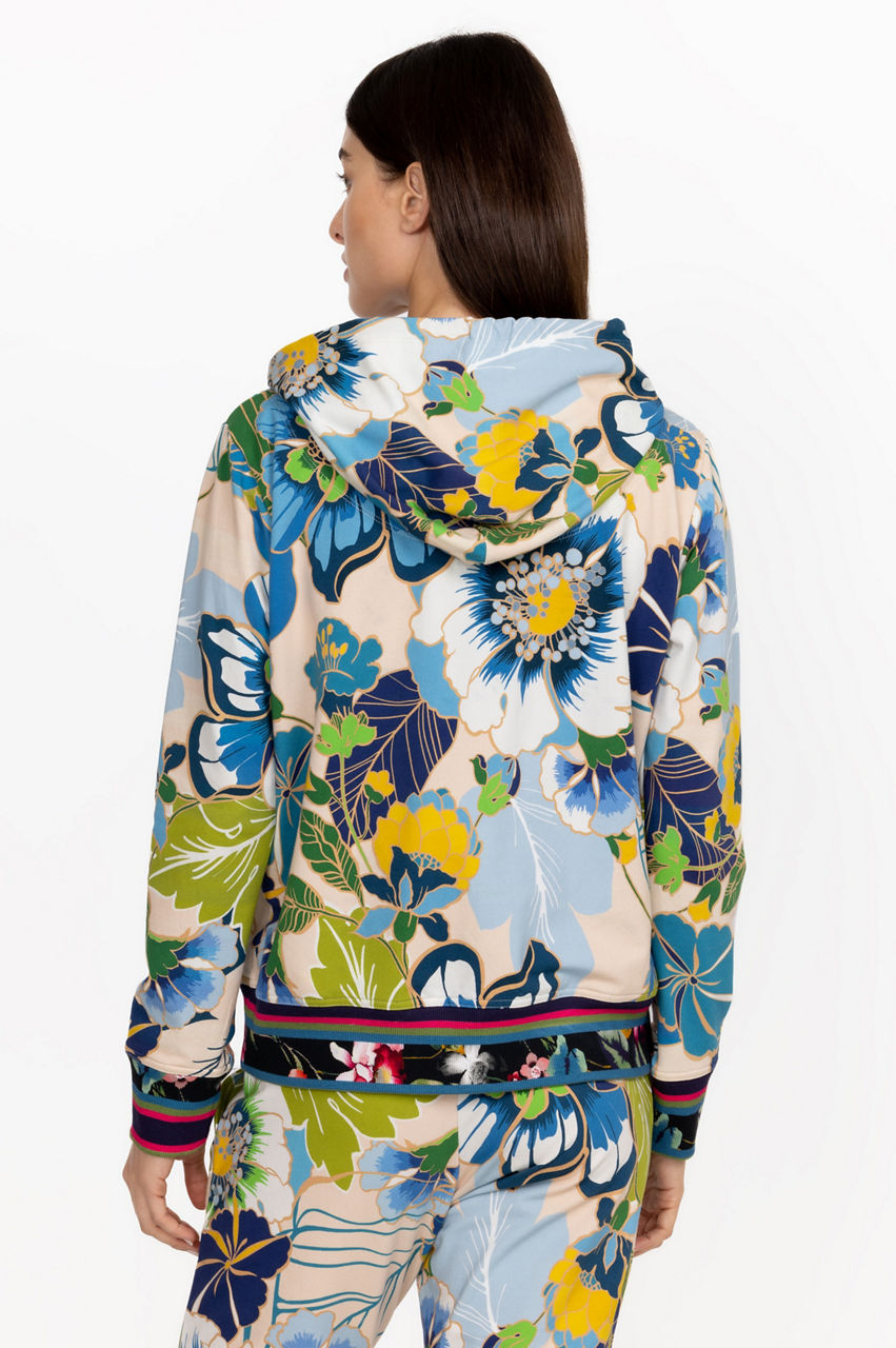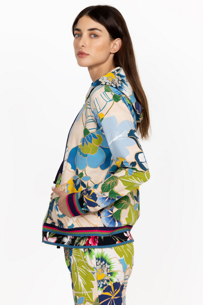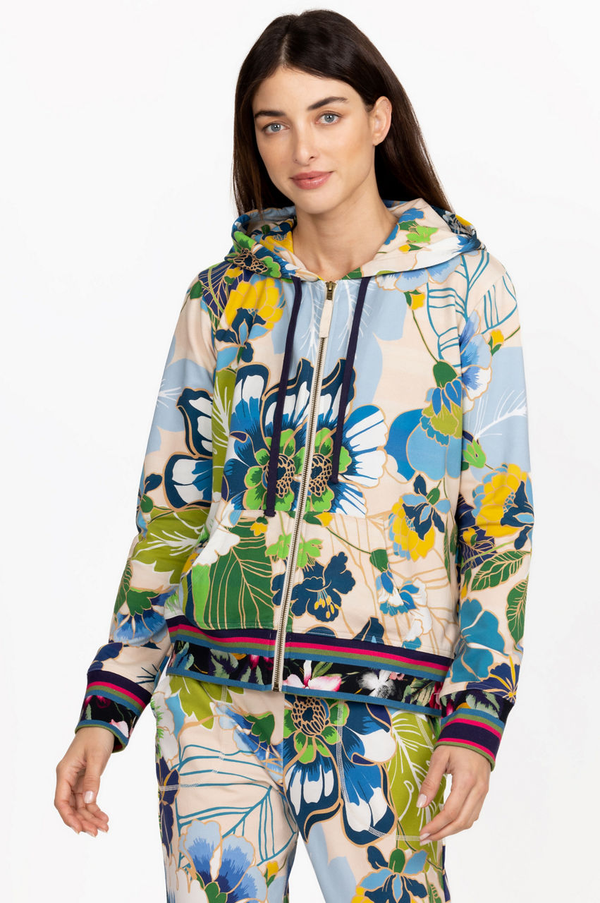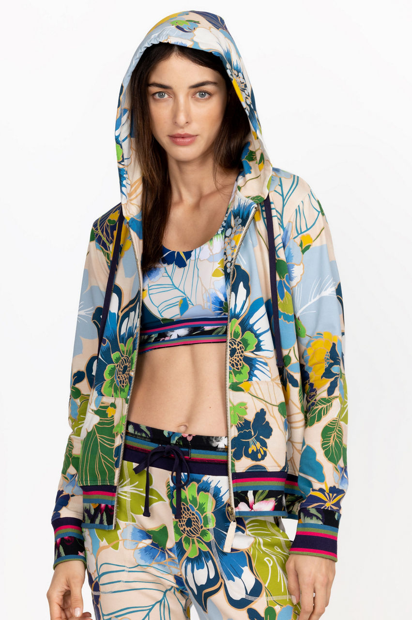 The Jenn Modern Zip Up Hoodie is a striking synergy of sports-inspired details and feminine motifs. Crafted from bamboo with a hint of stretch, this hoodie features a drawstring hood, long sleeves, a front zip closure, a tropical floral print, and contrast floral printed edges. Wear with joggers for a stylish take on leisurewear.