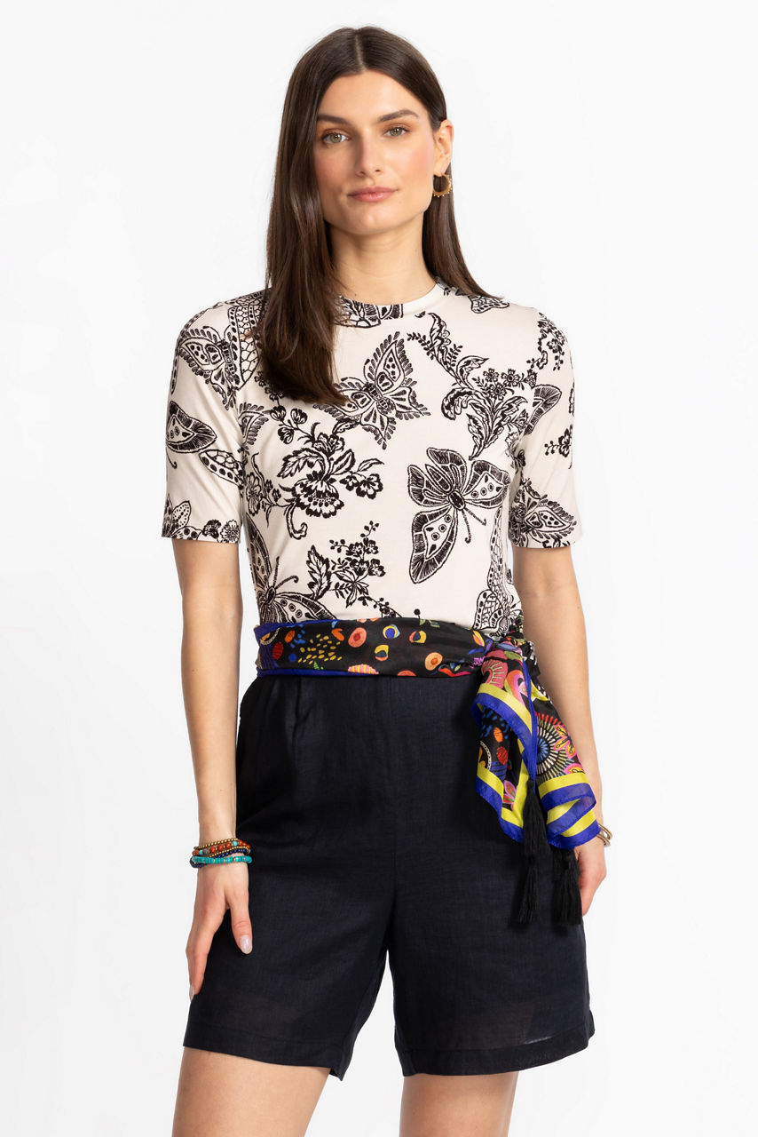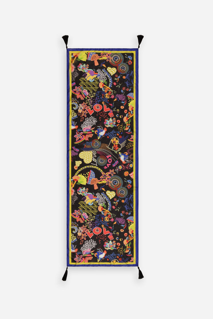 Beautifully decorated with a vibrant abstract pattern on a field of black, the Jenny Oblong Scarf is accented with brilliant color. Crafted from 100% sumptuous silk, this scarf is finished with decorative tassels at each corner. Drape at the shoulders or tie to the handles of an elegant bag to add a splash of color to any look.