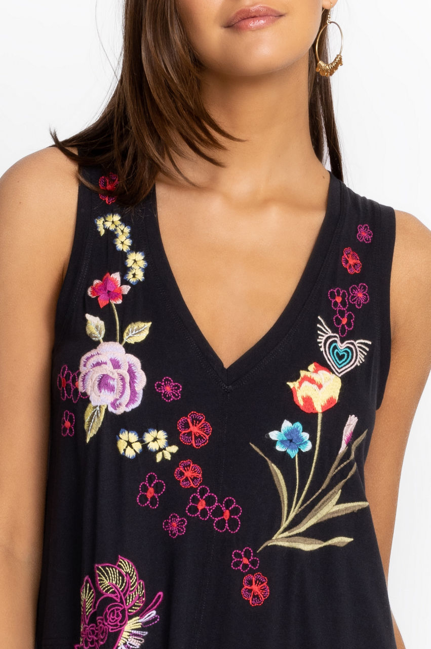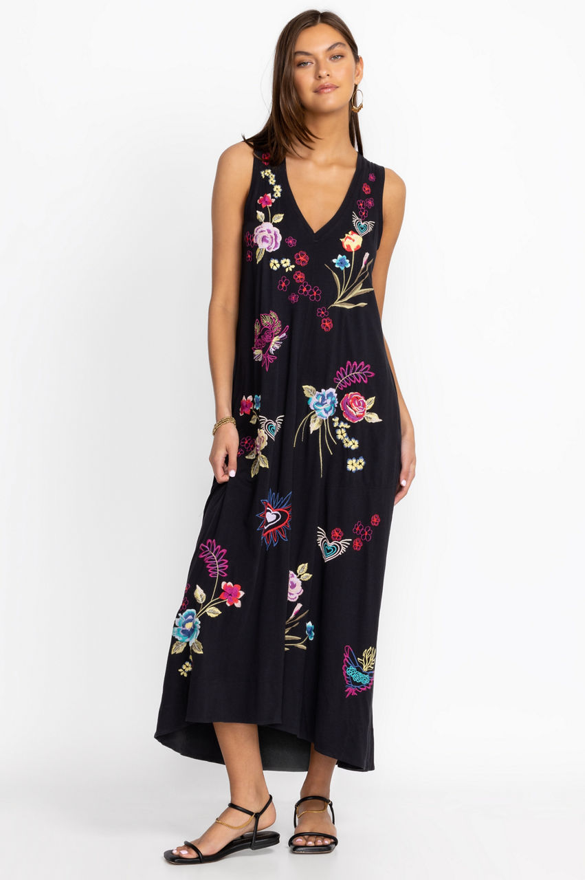 Embellished with joyful botanica motifs and romantic hearts, the Jessi Knit V-Neck Maxi Dress turns an easy silhouette into a new seasonal favorite. The perfect pick for al fresco lunches and day-to-day pursuits, this dress is cut from pure cotton and boasts a V-neck, soft pleats, and a detailed placement embroidery in an upbeat color scheme. Style this dress with flats or sandals and plain accessories.