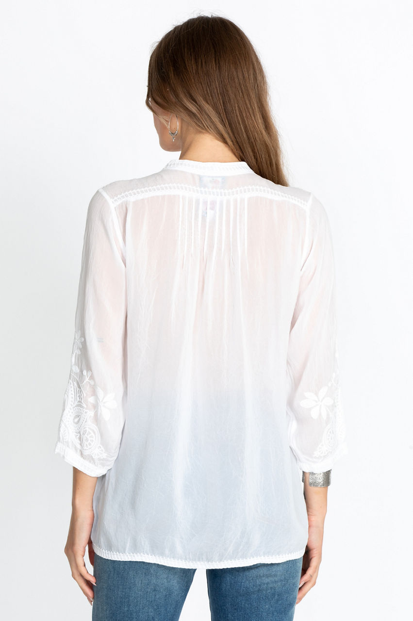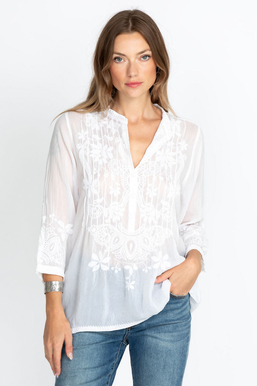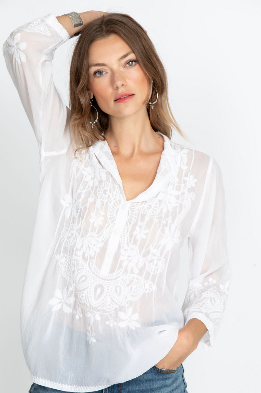With an exquisite display of unique embroidery, our stunning Jeta Blouse is made with both style and comfort in mind. This long-sleeved blouse is light and soft, making it a perfect piece all summer long. Pair with your favorite jeans and sandals for an easy, elegant look for hitting the mall.