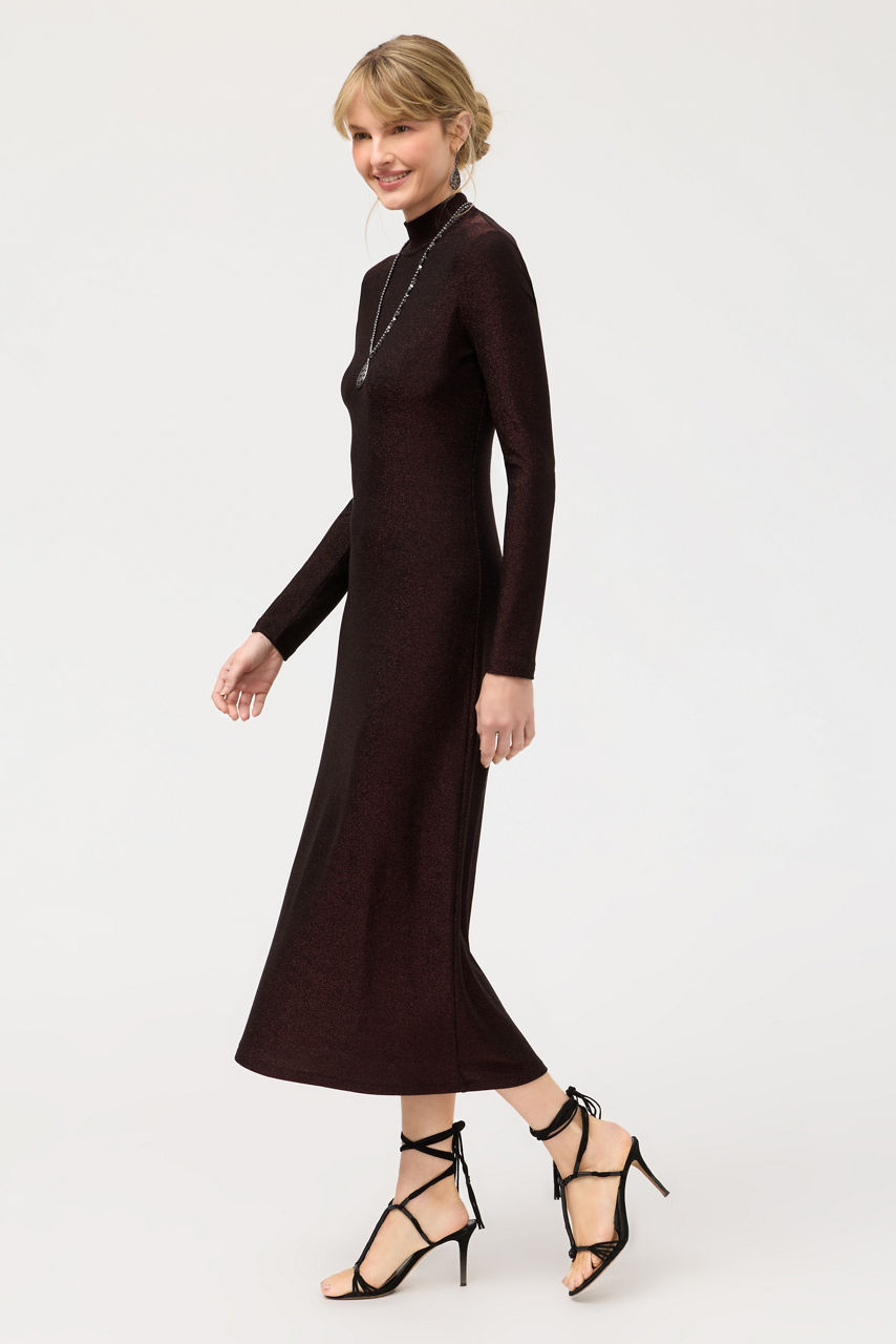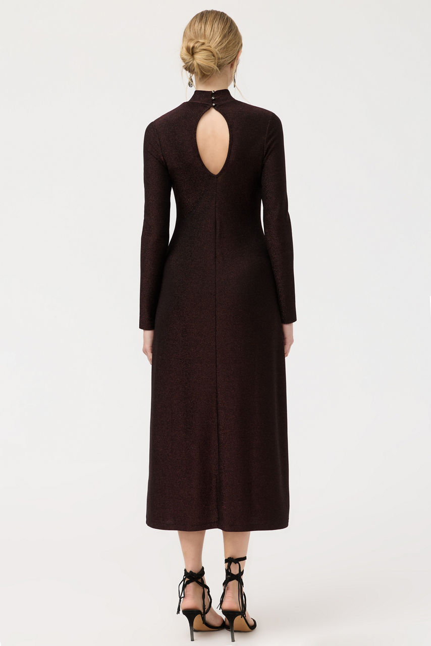 Crafted from a lightweight fabric with a hint of sparkle, the Jewell Midi Dress is washed in a rich espresso hue. Featuring a mock neck and long sleeves, this dress is finished with a keyhole at the back and a midi-length skirt. Pair with bold jewelry and strappy heels for an evening out with friends.