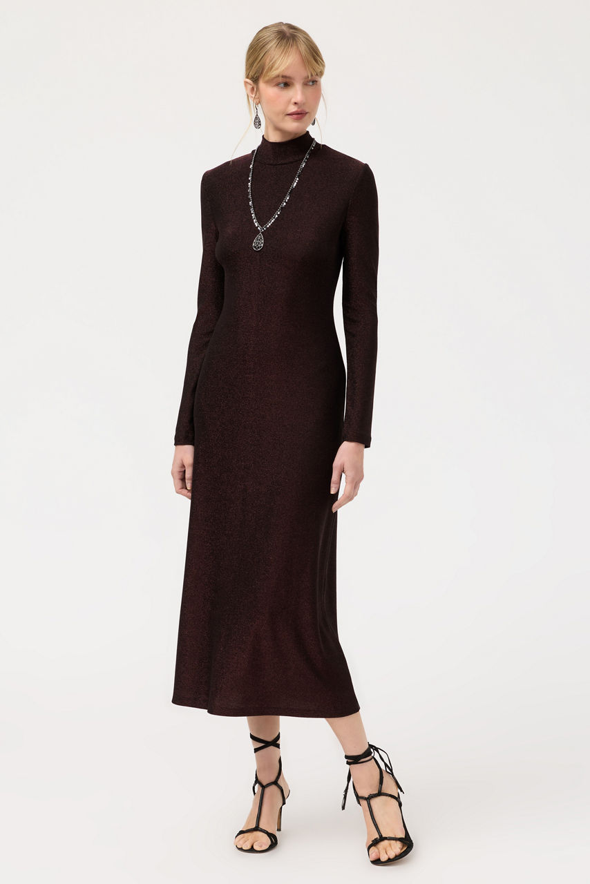 Crafted from a lightweight fabric with a hint of sparkle, the Jewell Midi Dress is washed in a rich espresso hue. Featuring a mock neck and long sleeves, this dress is finished with a keyhole at the back and a midi-length skirt. Pair with bold jewelry and strappy heels for an evening out with friends.