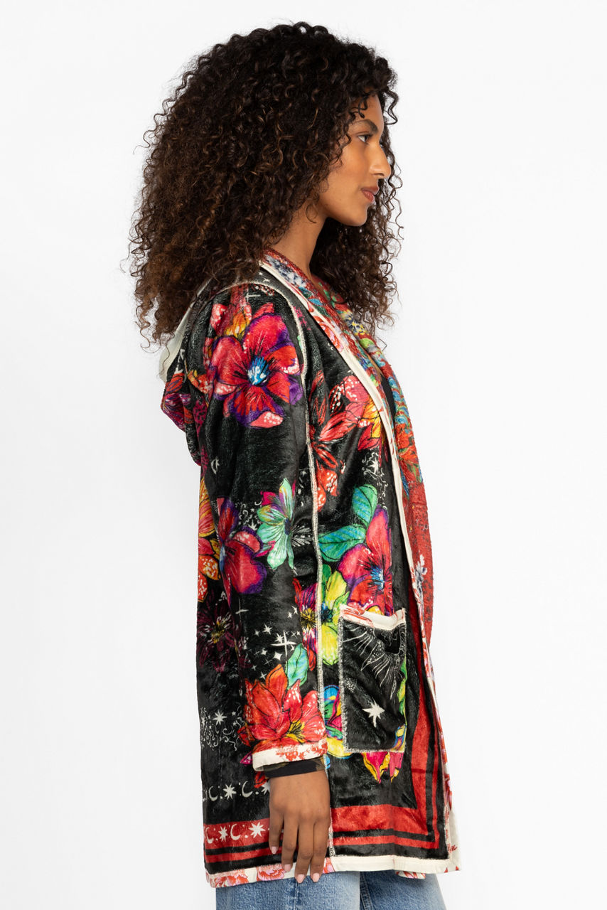Washed in brilliant floral bouquets, the Joan Midi Sherpa Jacket is equal parts cozy and versatile. Featuring two unique designs, this fully reversible jacket offers an open front with an attached hood and functional patch pockets. Layer over a coordinating pullover and pair with wide-leg jeans for an elevated casual look.