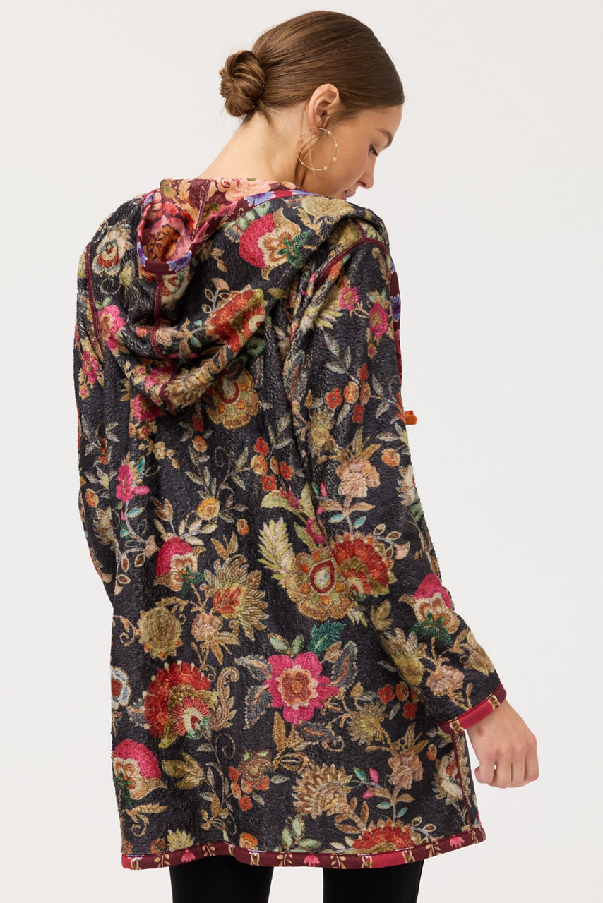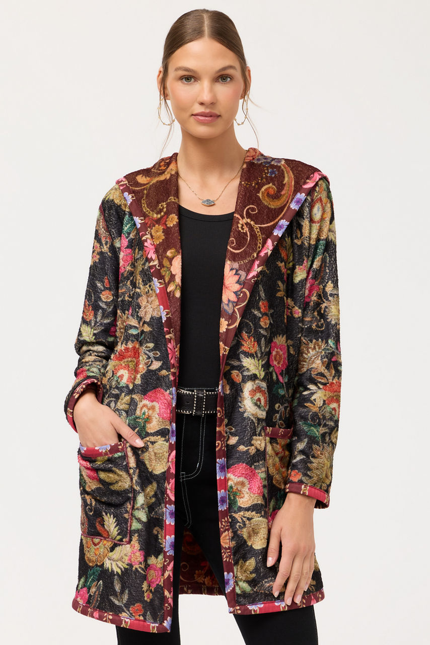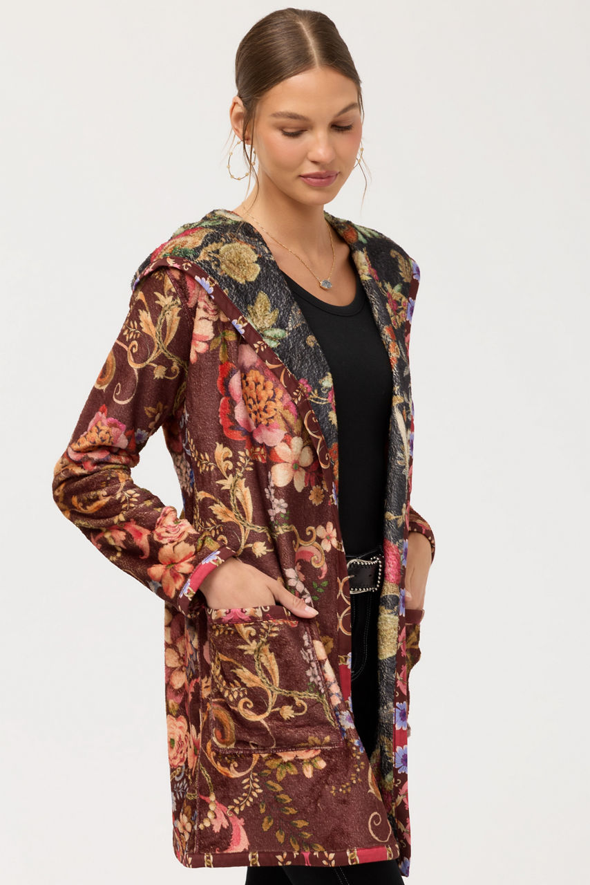 The fully reversible Joan Midi Sherpa Jacket offers two bold floral patterns to choose from, making it a versatile wardrobe addition. Designed with an open front with an attached hood, this cozy jacket is finished with patch pockets at the hips. Layer over a sleek turtleneck and pair with cigarette pants for an elevated casual ensemble.