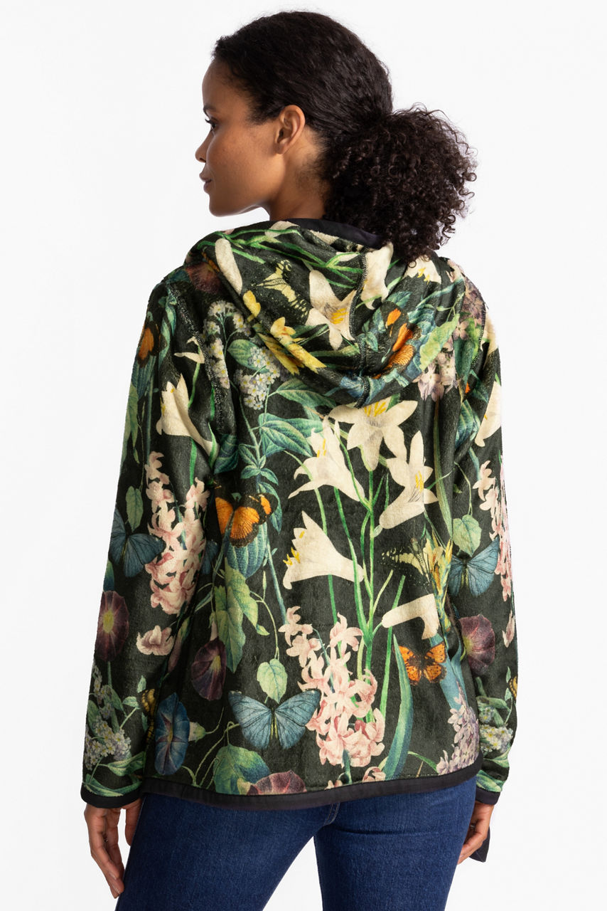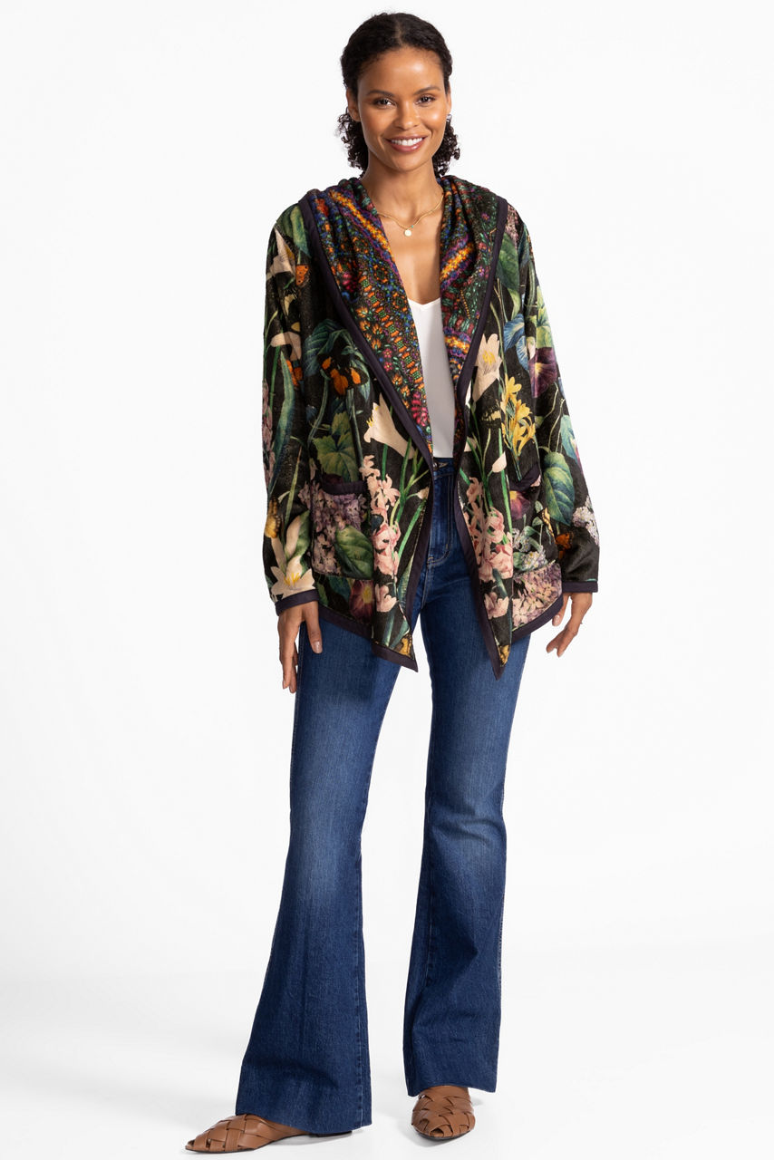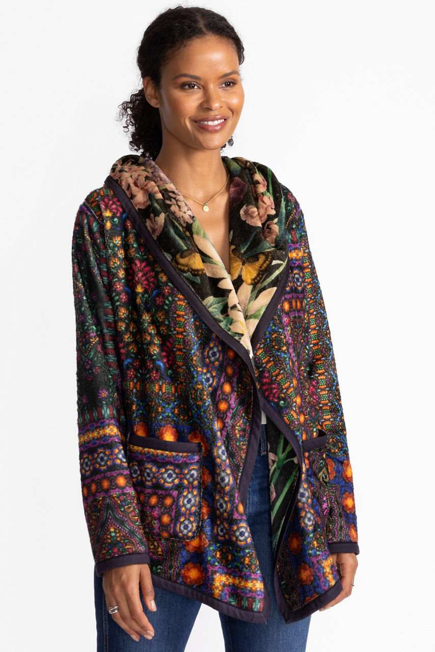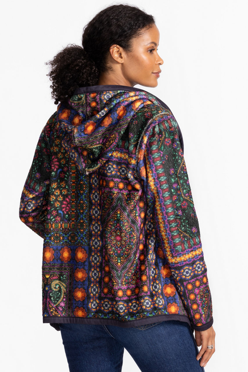 Crafted with two unique designs, the fully reversible Joan Sherpa Jacket offers a rich floral pattern and a vibrant patchwork pattern to add variety to any wardrobe. Designed with an open front and attached hood, this cozy jacket is finished with long sleeves and pockets. Layer over a casual tee and relaxed-fit denim for a stylish weekend ensemble.