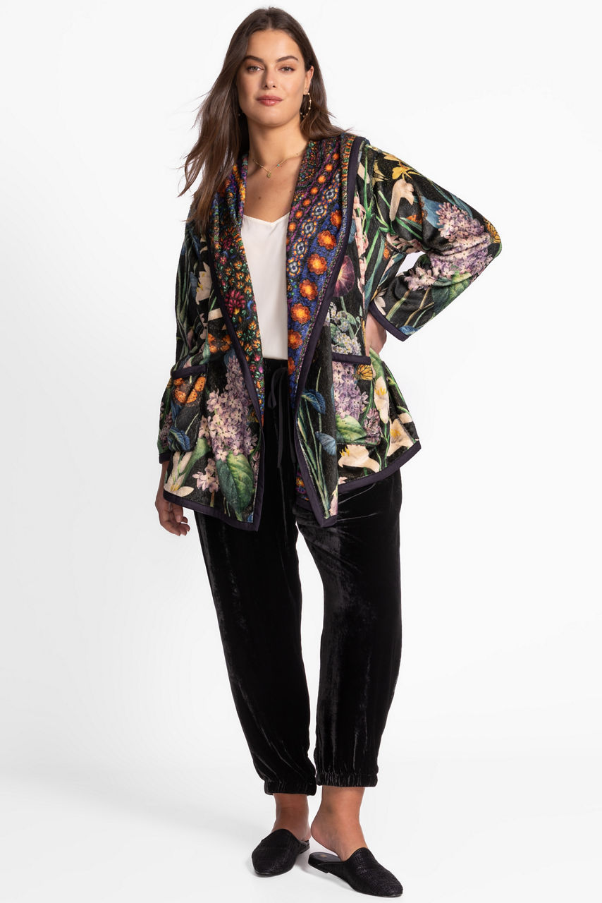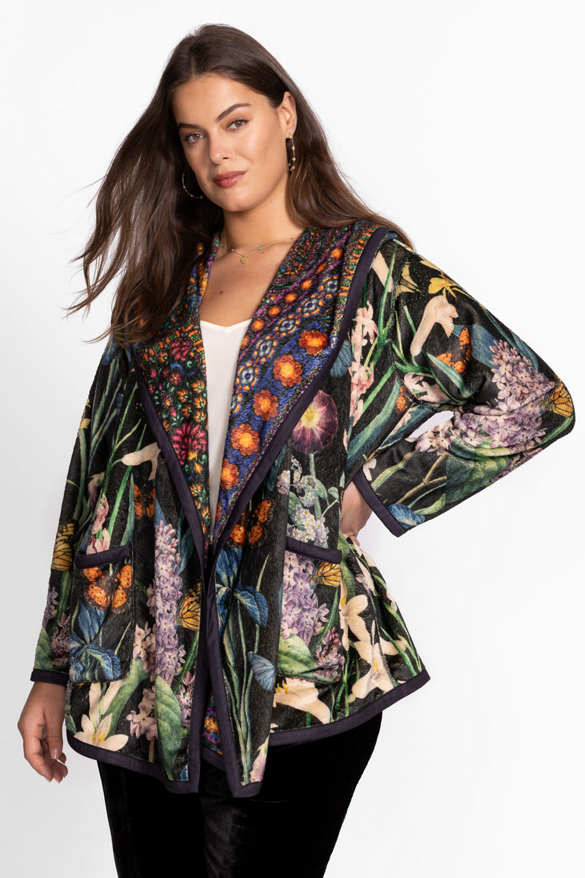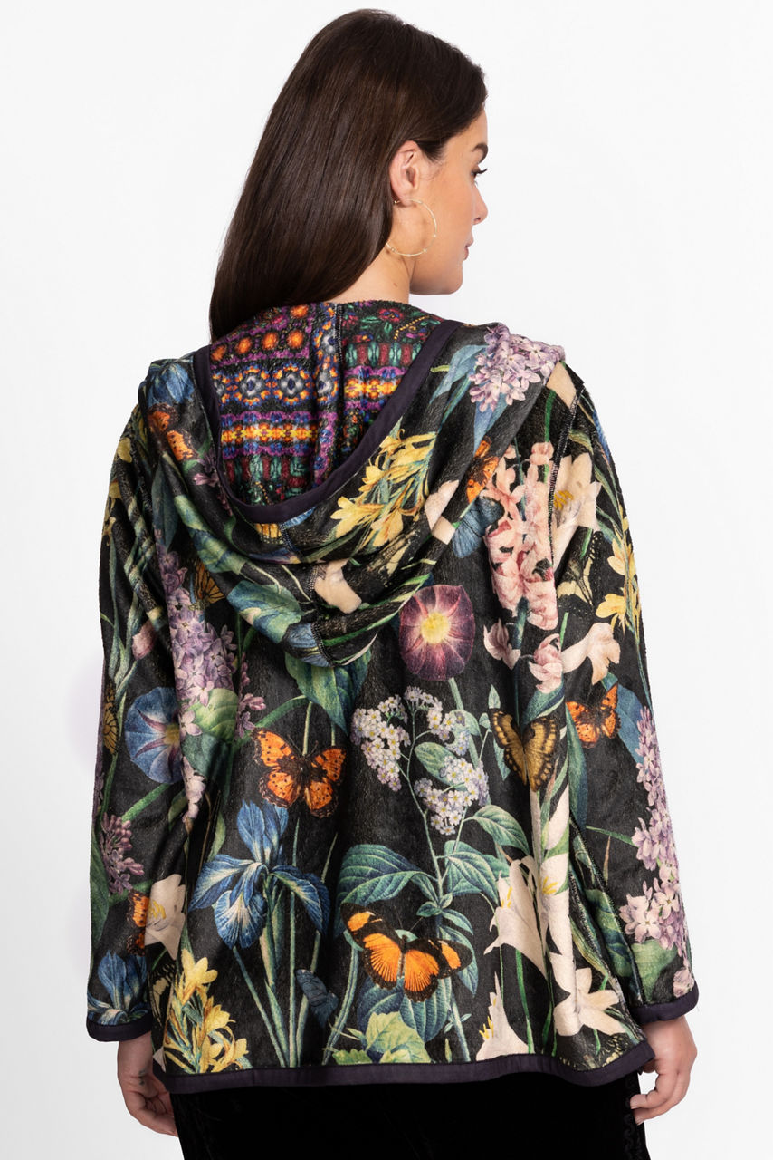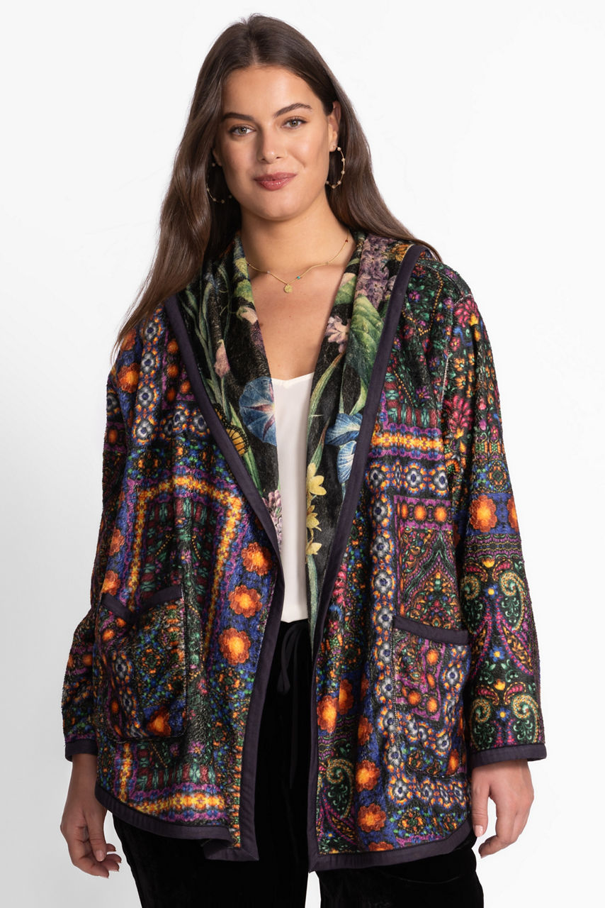 Crafted with two unique designs, the fully reversible Joan Sherpa Jacket offers a rich floral pattern and a vibrant patchwork pattern to add variety to any wardrobe. Designed with an open front and attached hood, this cozy jacket is finished with long sleeves and pockets. Layer over a casual tee and relaxed-fit denim for a stylish weekend ensemble.