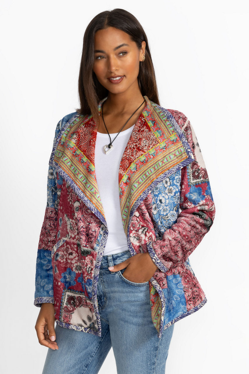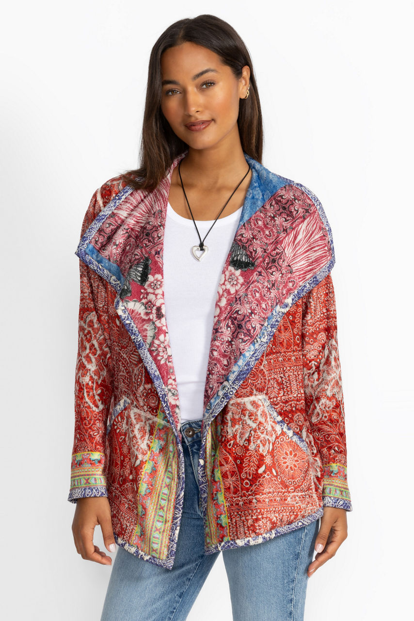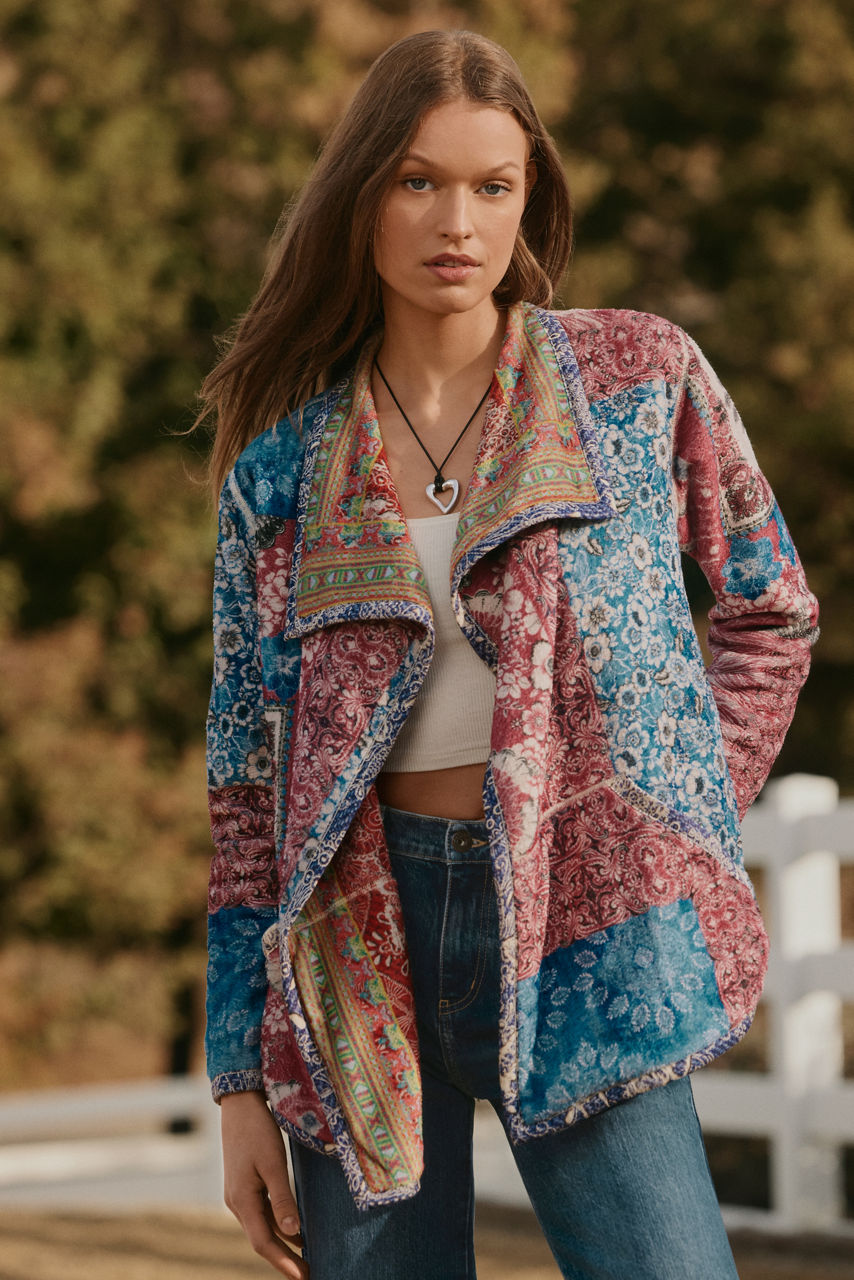 Featuring two unique designs, the fully reversible Joan Wrap Binded Sherpa Jacket adds a colorful layer of warmth to any look. Designed with a flowing shawl collar and an open front, this jacket is washed in bold color and is finished with slip pockets at the sides. Layer over a cozy pullover and pair with relaxed-fit denim for a comfortable weekend look.