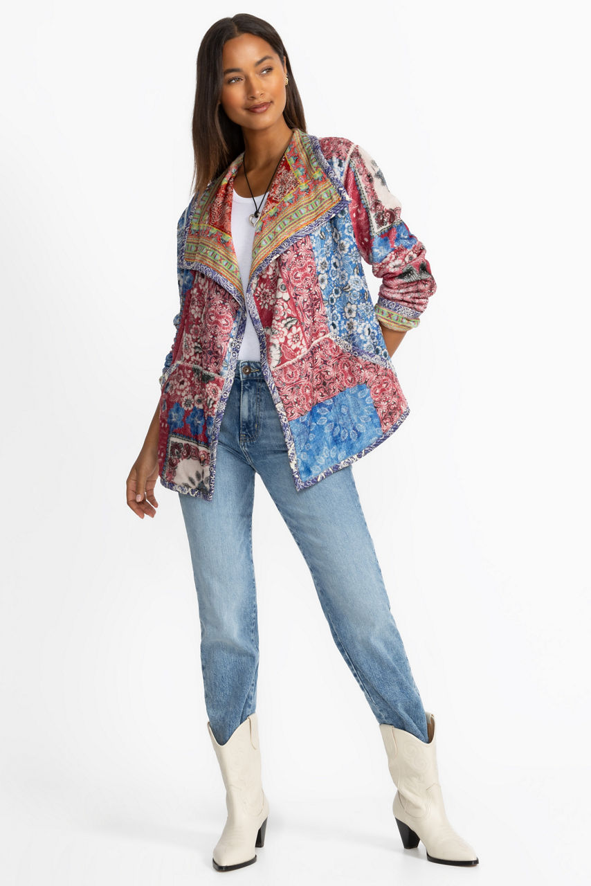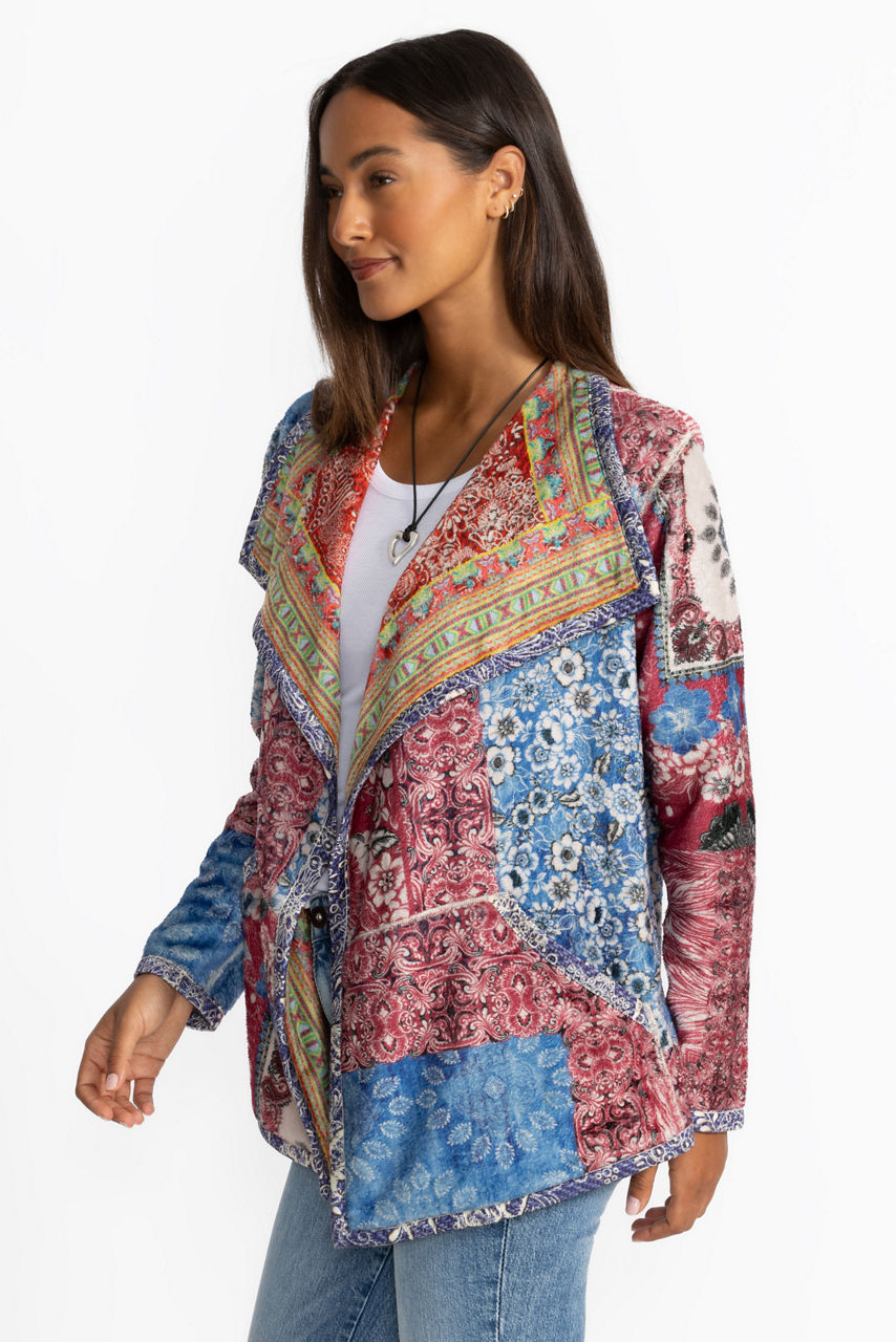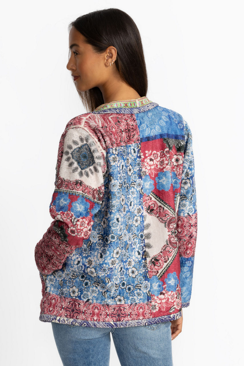 Featuring two unique designs, the fully reversible Joan Wrap Binded Sherpa Jacket adds a colorful layer of warmth to any look. Designed with a flowing shawl collar and an open front, this jacket is washed in bold color and is finished with slip pockets at the sides. Layer over a cozy pullover and pair with relaxed-fit denim for a comfortable weekend look.