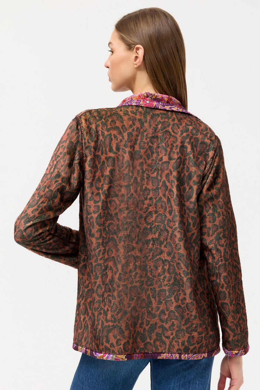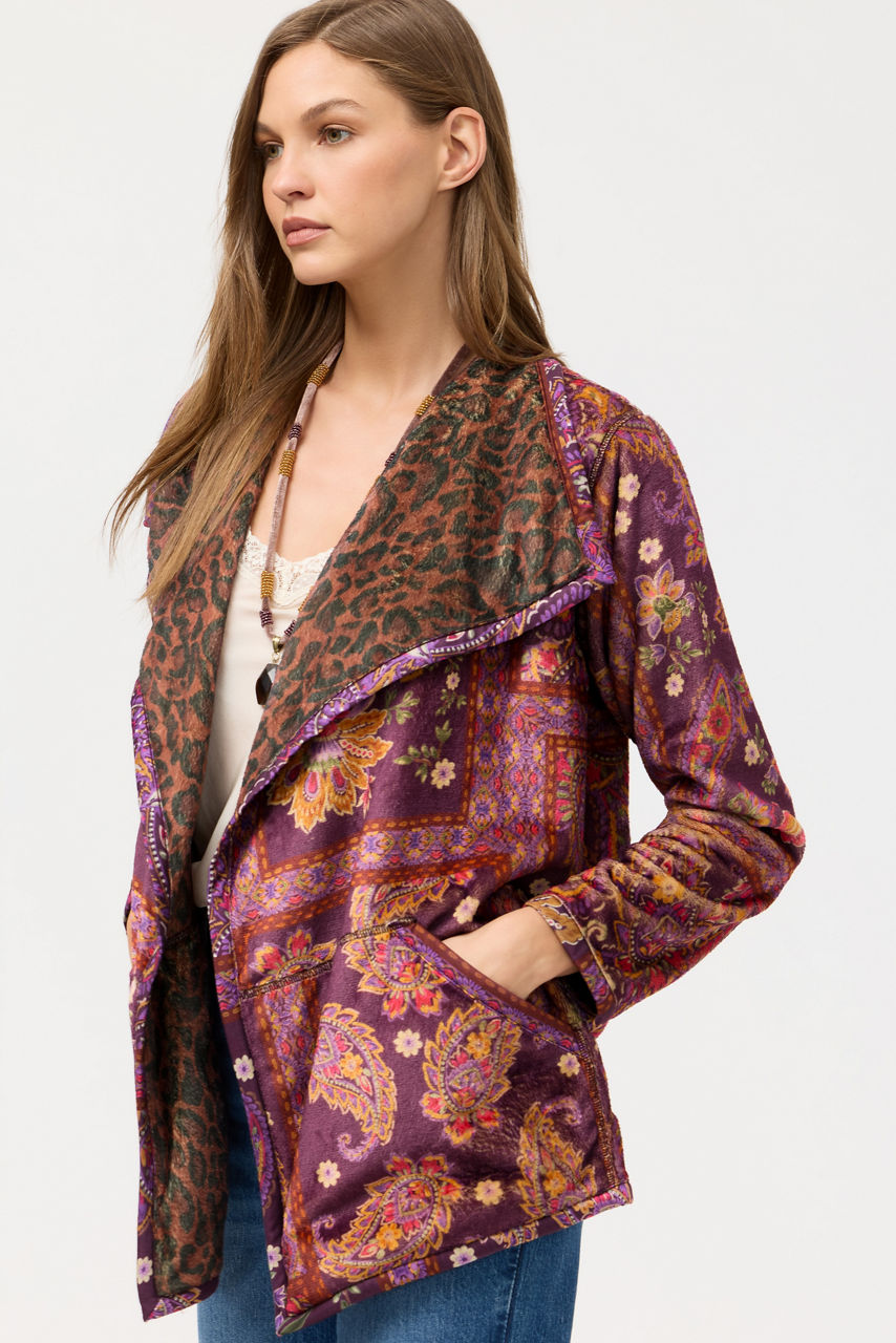 Intricately detailed with a stunning paisley and floral patchwork pattern, the Joan Sherpa Jacket is a cozy layering piece. Designed with two distinctive looks, this full reversible jacket adds versatility to any wardrobe. Layer over a black jumpsuit and pair with casual loafers for a fun girls' night out.