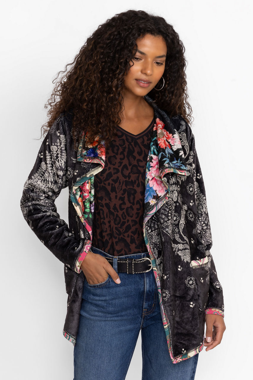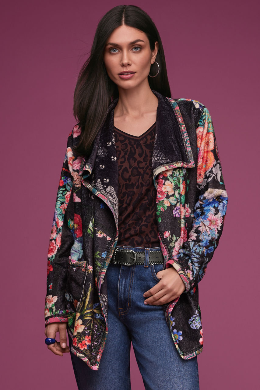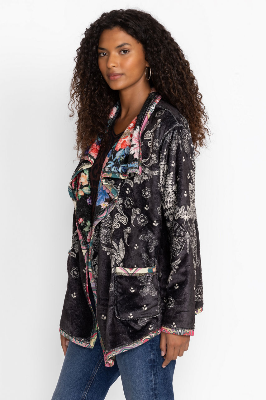 Detailed with stunning color and pattern, the Joan Wrap Sherpa Jacket is equal parts versatile and functional. Featuring a shawl collar and open front, this fully reversible jacket offers two unique designs to choose from and is finished with pockets at the sides. Layer over a silk tank and linen pants for an upscale evening out.