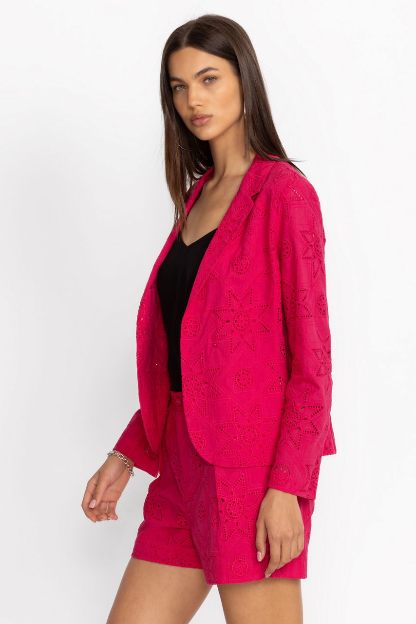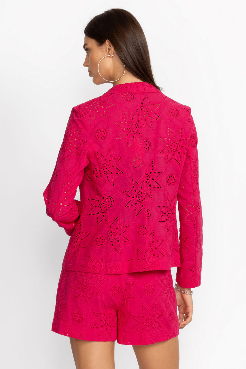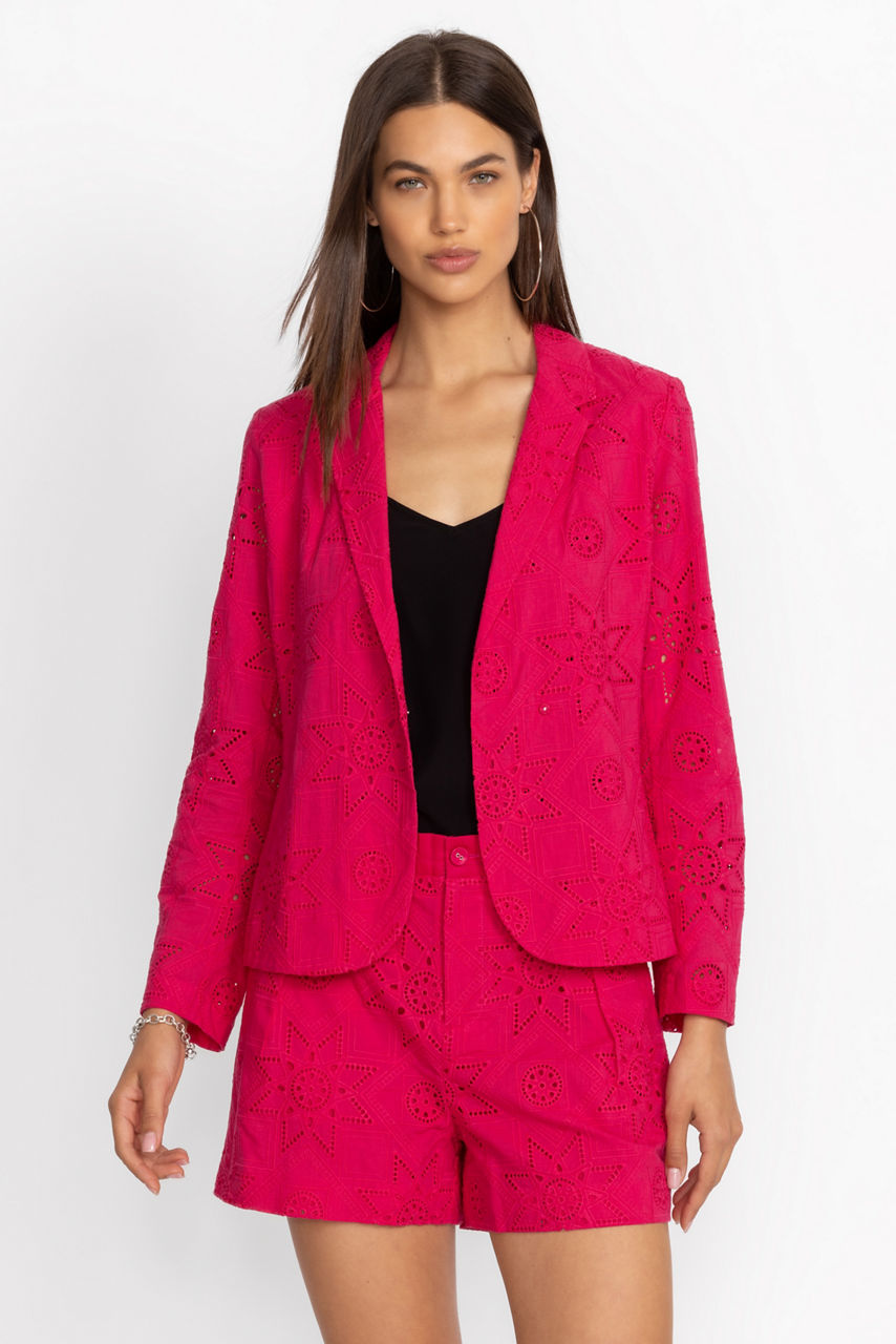 Crafted from 100% breathable cotton eyelet, the Joanna Blazer adds a spark of joy to your work wardrobe. Featuring an open lapel neckline and structured princess seams, this vibrant blazer is finished with a snap closure front. Pair with white linen pants and a silk shell for a polished work look that is elegant and fun.