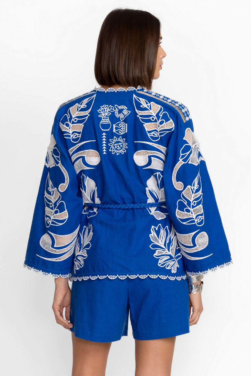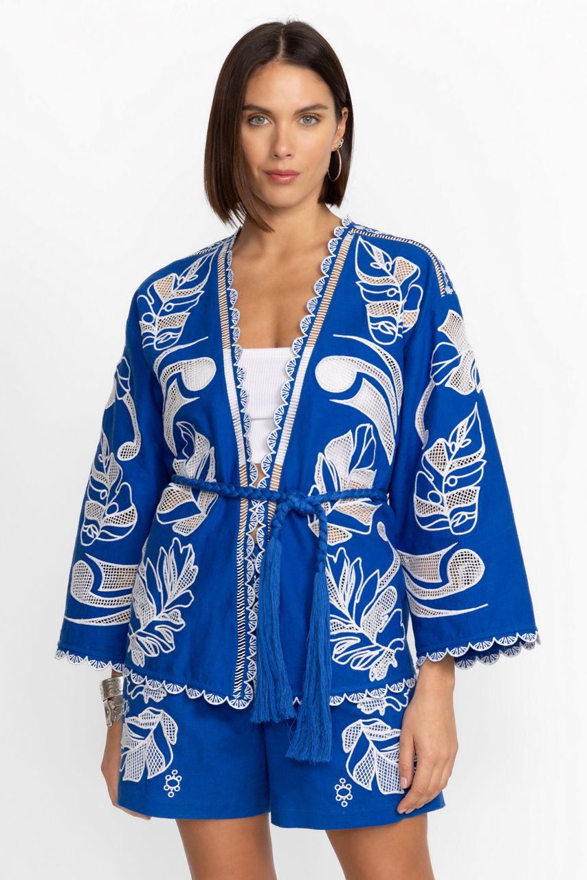 The Jodie Easy Jacket is the perfect way to elevate your casual look. Crafted from a linen and cotton blend with a hint of stretch, this beautifully embellished jacket features placement embroidery and scalloped edges and is finished with a carefully designed crochet belt. Layer over a white linen top and palazzo pants to allow this eye-catching jacket to take center stage.