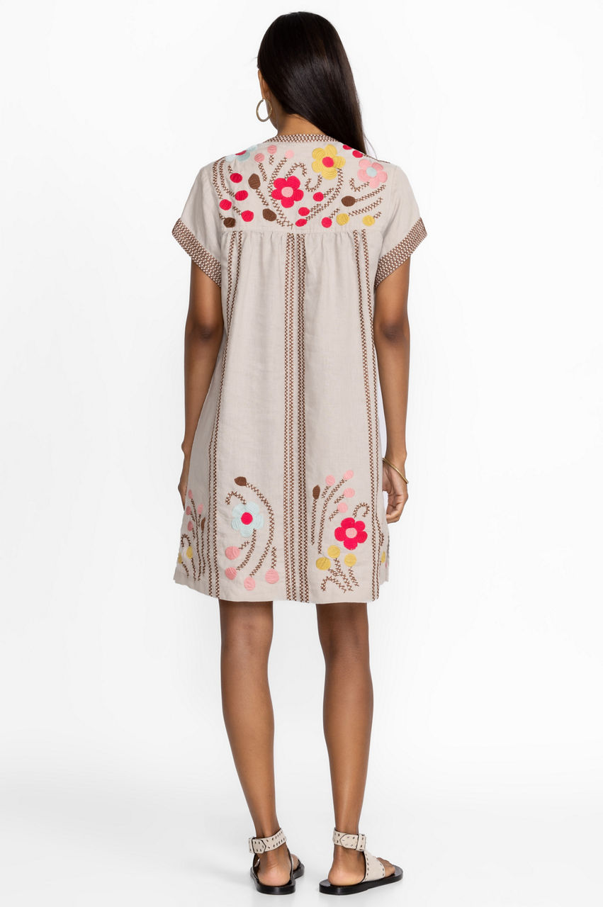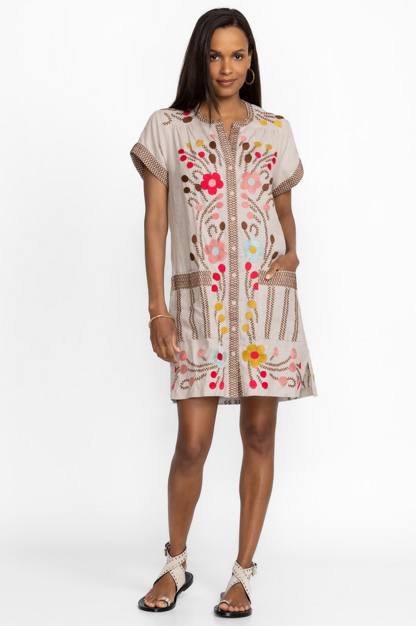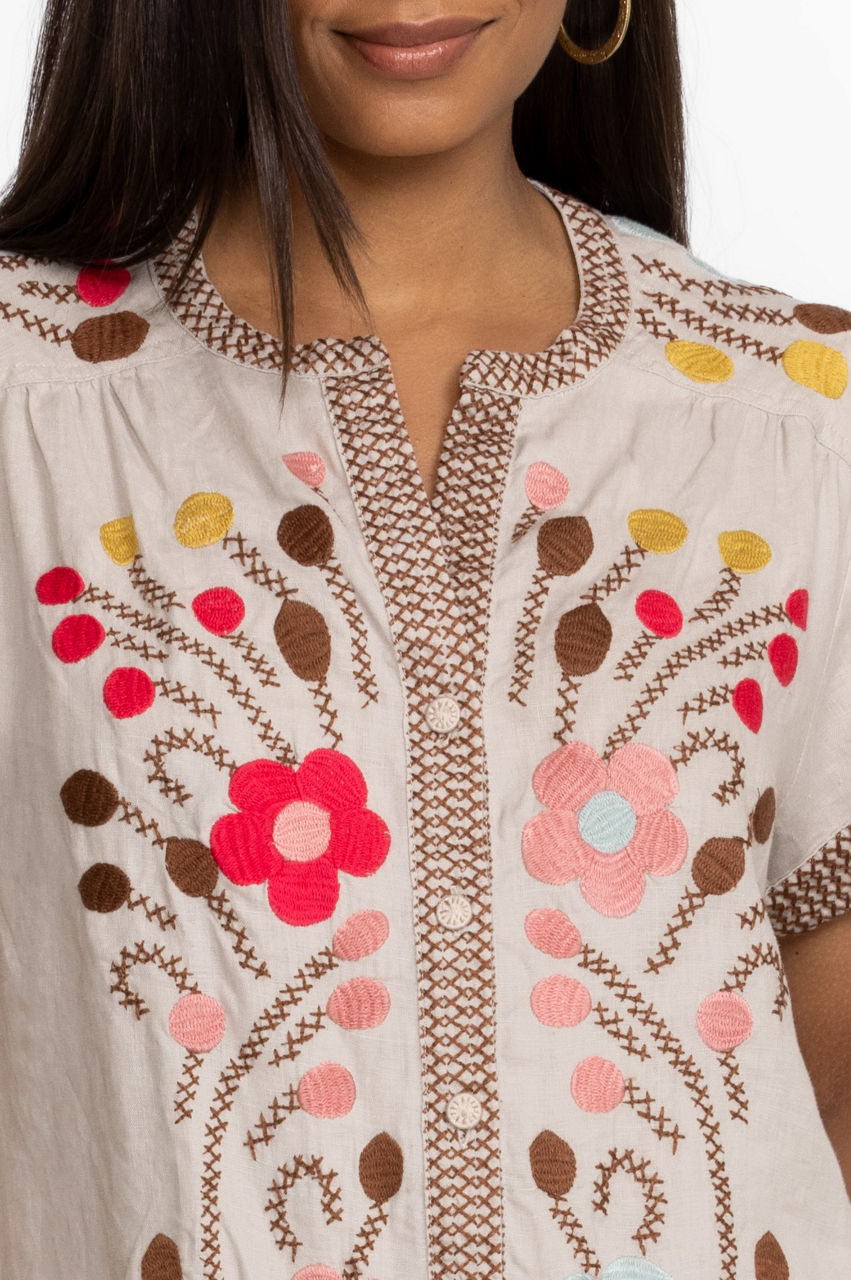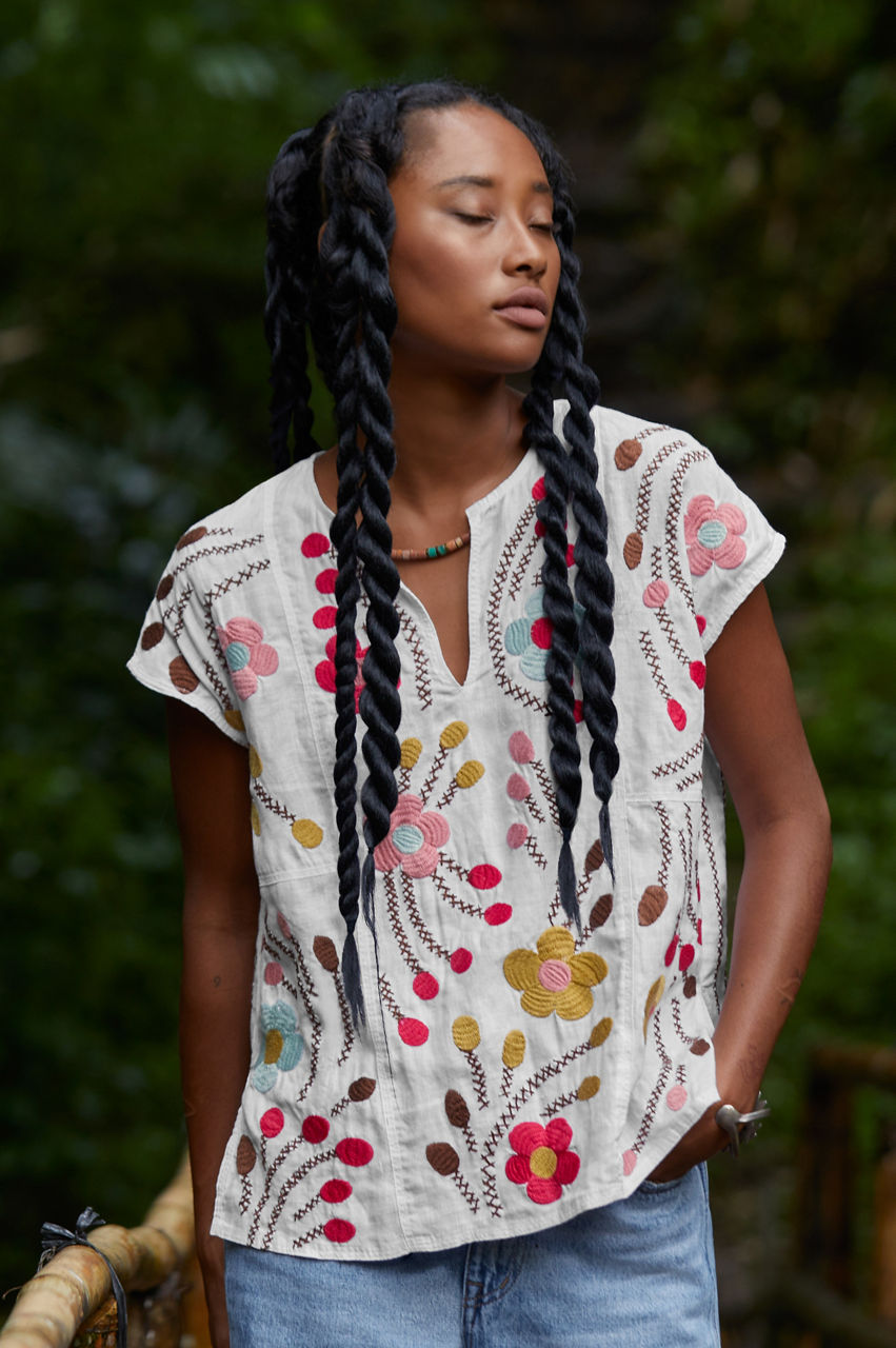 Effortlessly elevated with vivacious florets, the Joni Relaxed Pocket Weekend Tunic is an optimistic addition to your off-duty repertoire. The height of pared-back style, this tunic is crafted from breathable linen, a comfortable choice for warmer climates, and boasts a round neck, short sleeves, a button front, and a bright placement embroidery complete with floral motifs. Layer over jeans or pair with shorts on your next exotic vacation.