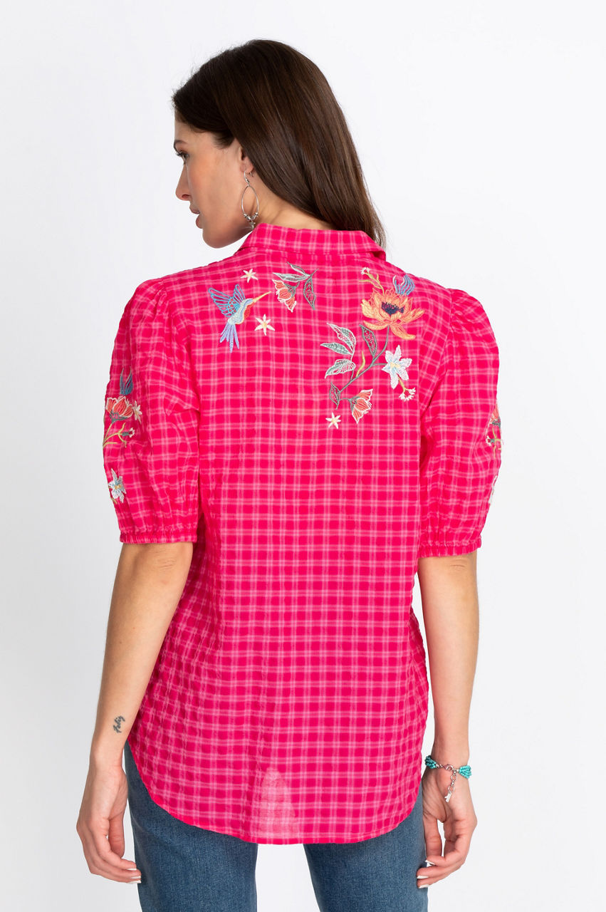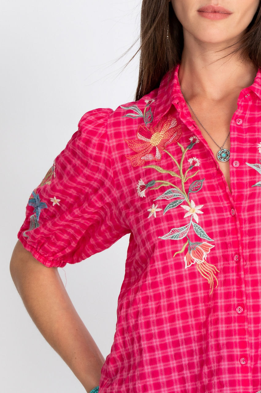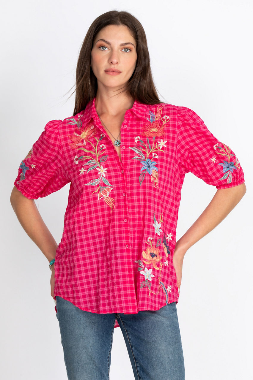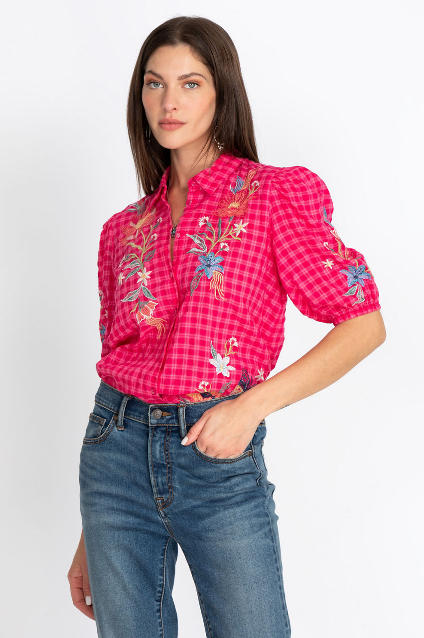 Create a stunning look with the classic open collar Jordan Lisbon Shirt. Our artisan-style embroidered shirt has detailed puff sleeves and a gorgeous silhouette. Pair with your favorite denim and colorful flats for a relaxed, laid-back look. Create the boho look with dark trousers, a leather clutch, and statement jewelry.