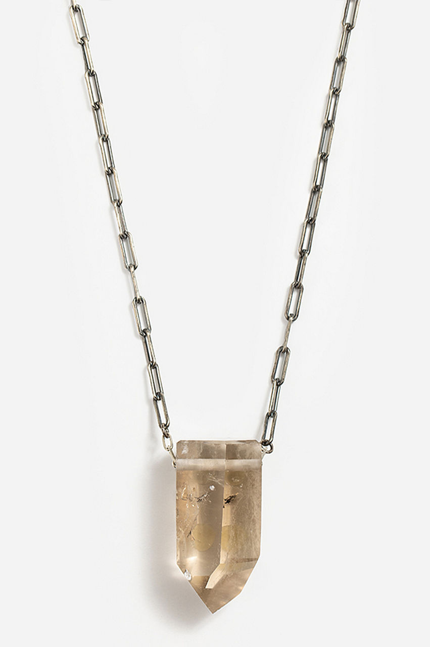 A true natural statement piece. Each stone is hand selected by Joseph Brooks and sits on a handmade 30 sterling silver chain. The focus is the singular quartz crystal, a stone that inspires a powerful clarity, whether it be physical, emotional or spiritual. The vibrational property of quartz crystal is pure white light, and can infuse the wearer with a tranquil state of harmony.