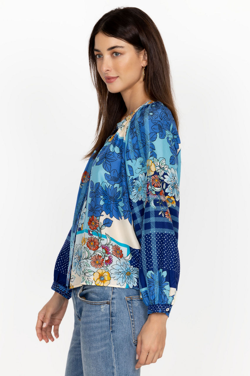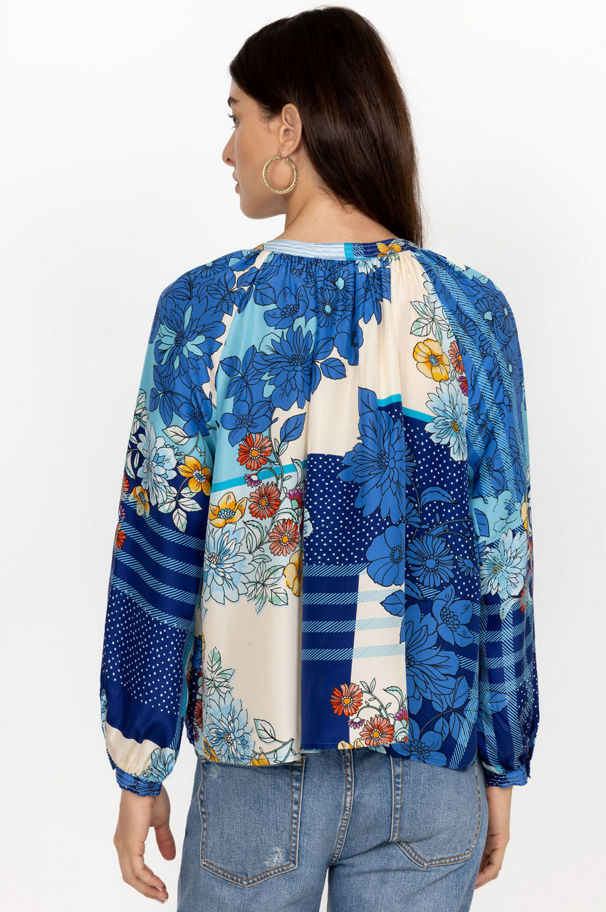 A medley of color and patterns, the Josy Lynn Raglan Poet Blouse puts a statement-making spin on a timeless silhouette. Cut in a slightly relaxed fit, this blouse is spun from lustrous silk and features a round neck, long sleeves, and clashing floral and striped motifs for an eye-catching look. Pair with jeans or wide-leg pants for an effortless daytime ensemble.