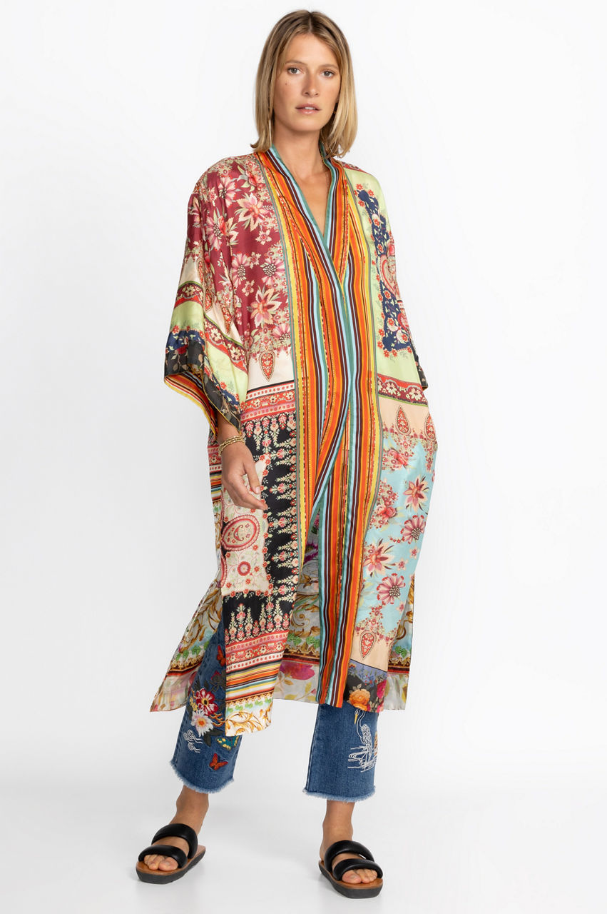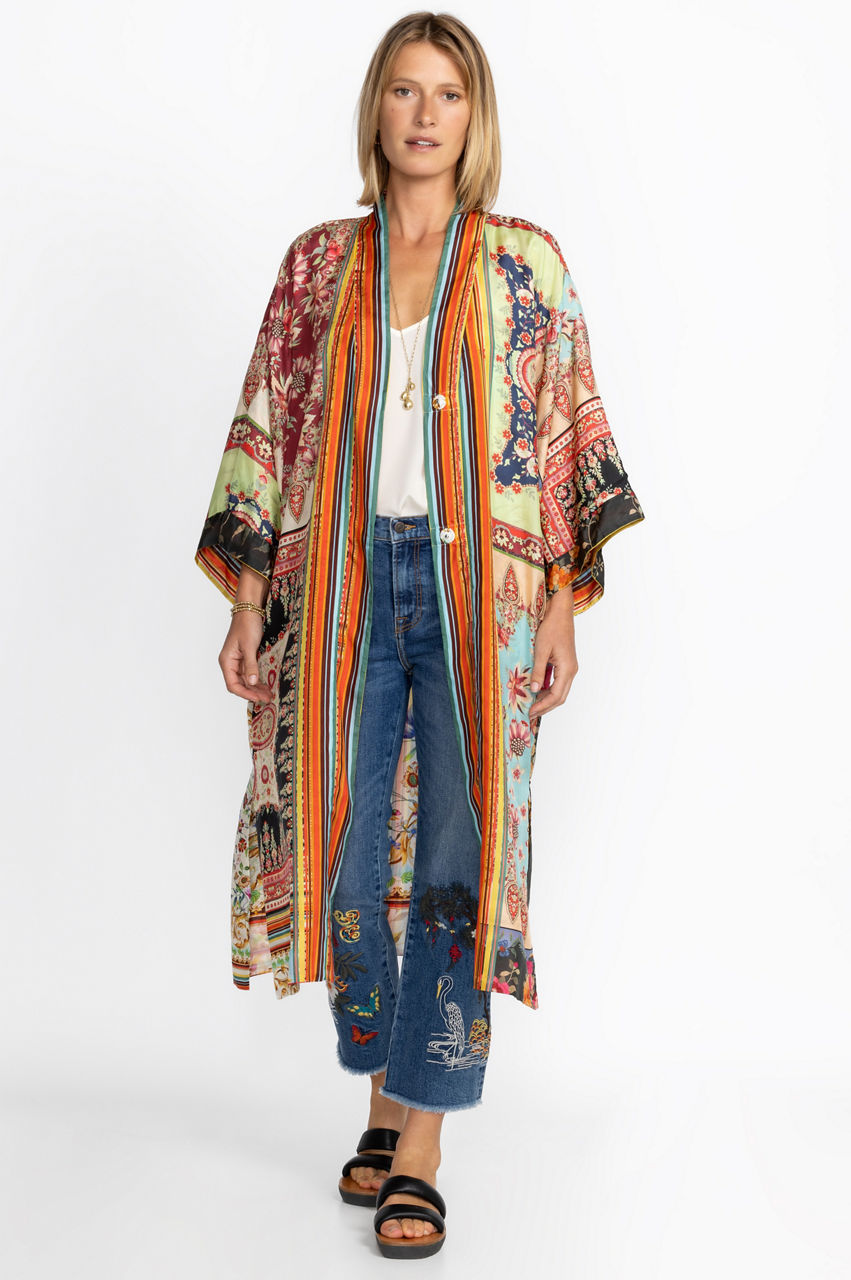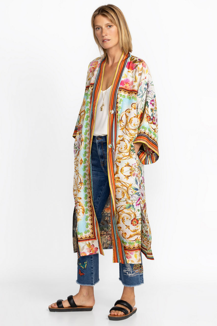 Artful tailoring and statement prints dominate the Journey Kimono. A striking outerwear style, this kimono is crafted from sumptuous silk and features an open front, long sleeves, a striped placket, multiple pockets, and a patterned reversible side. Layer this kimono over simple pieces or opt for a laid-back look by wearing with a tee and jeans.