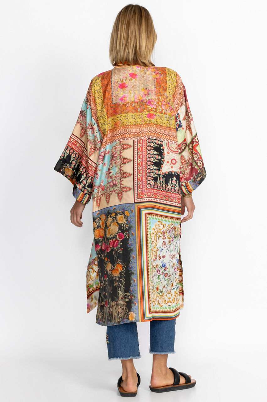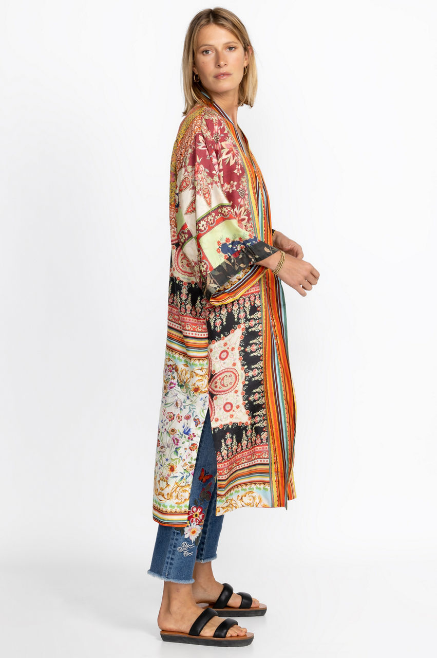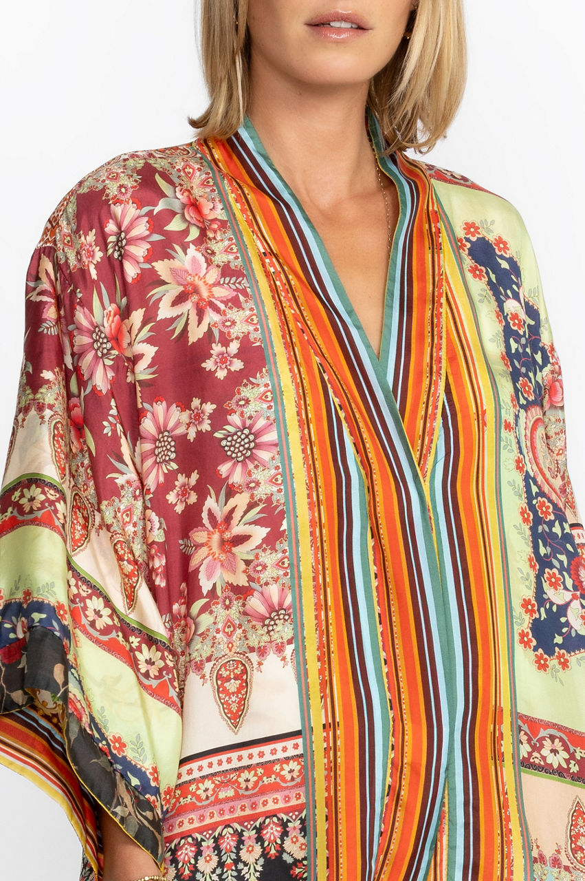 Artful tailoring and statement prints dominate the Journey Kimono. A striking outerwear style, this kimono is crafted from sumptuous silk and features an open front, long sleeves, a striped placket, multiple pockets, and a patterned reversible side. Layer this kimono over simple pieces or opt for a laid-back look by wearing with a tee and jeans.
