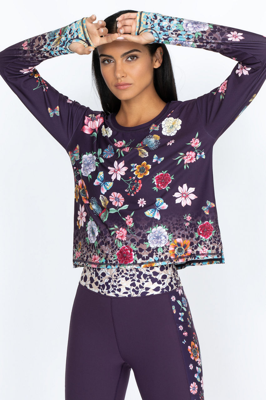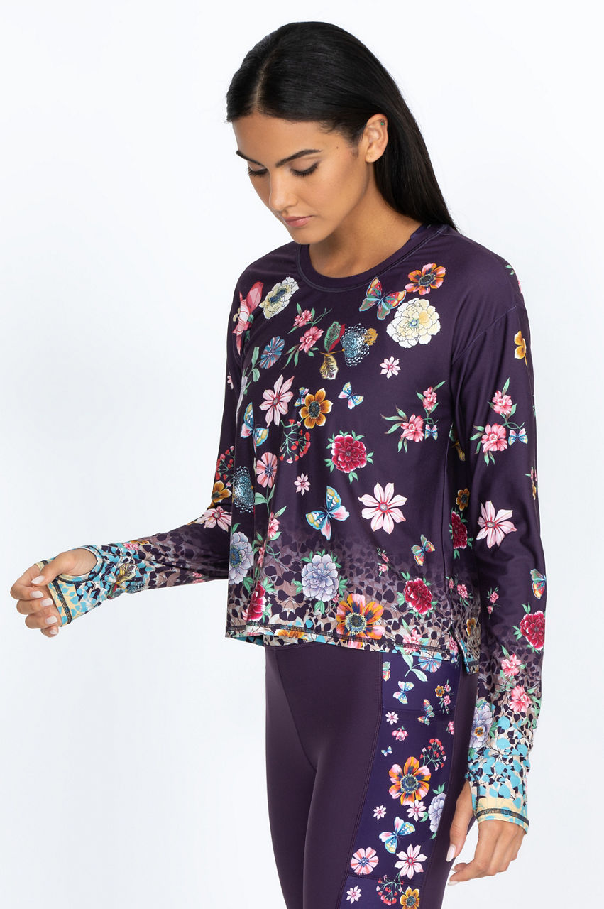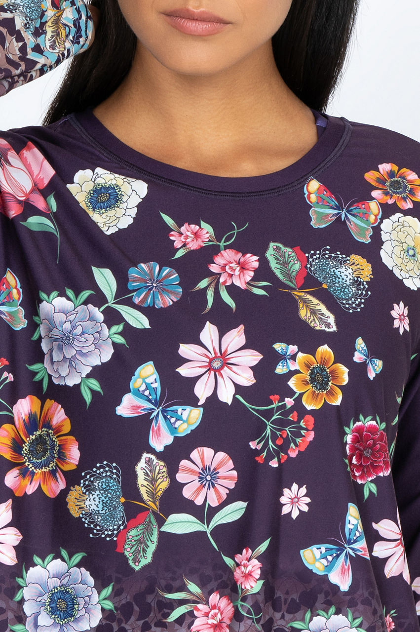 Wear our Joy Vanda step hem tee for a warm tribute to summer fun. Our shirt features butterflies and flowers in cheerful hues on a dark background. Our long-sleeved, crew neck tee brings back the beauty of warmer weather. Wear it with joggers at home, or dress it up with dark-washed jeans and a colorful jacket for an evening out.