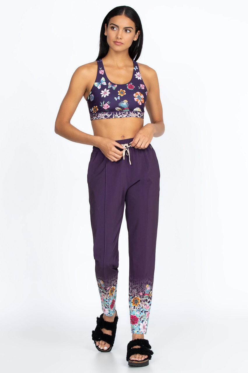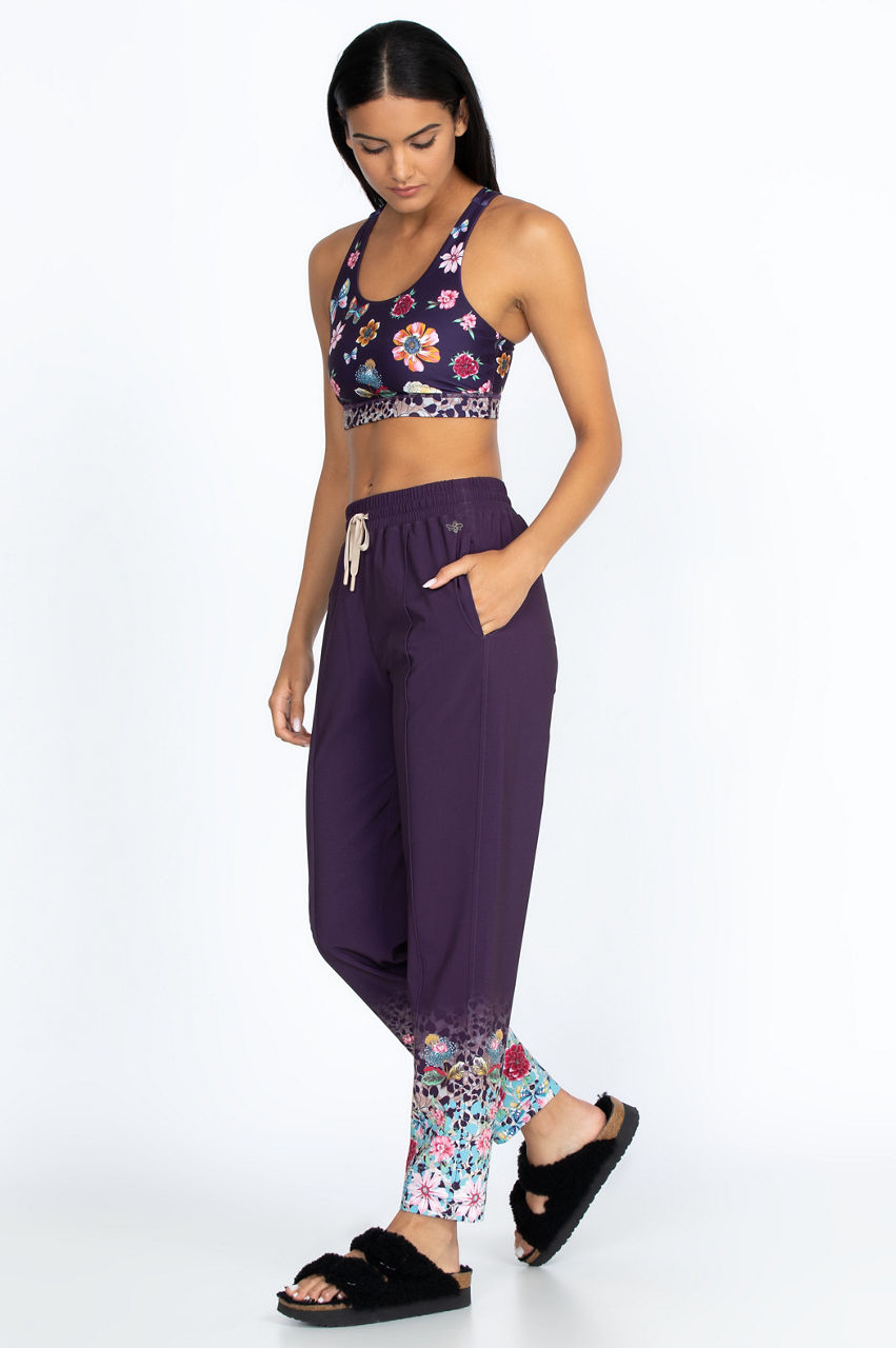 Wear our Joy Vanda track pants for running, doing errands or simply relaxing at home. Solid dark purple at the elastic, drawstring waist becomes a burst of colorful flowers from mid-shin to ankle. Practical and eye-popping, these pants also feature side pockets for carrying your wallet and cell phone. Pair with a solid top in any bright hue to draw out the garden at your feet!