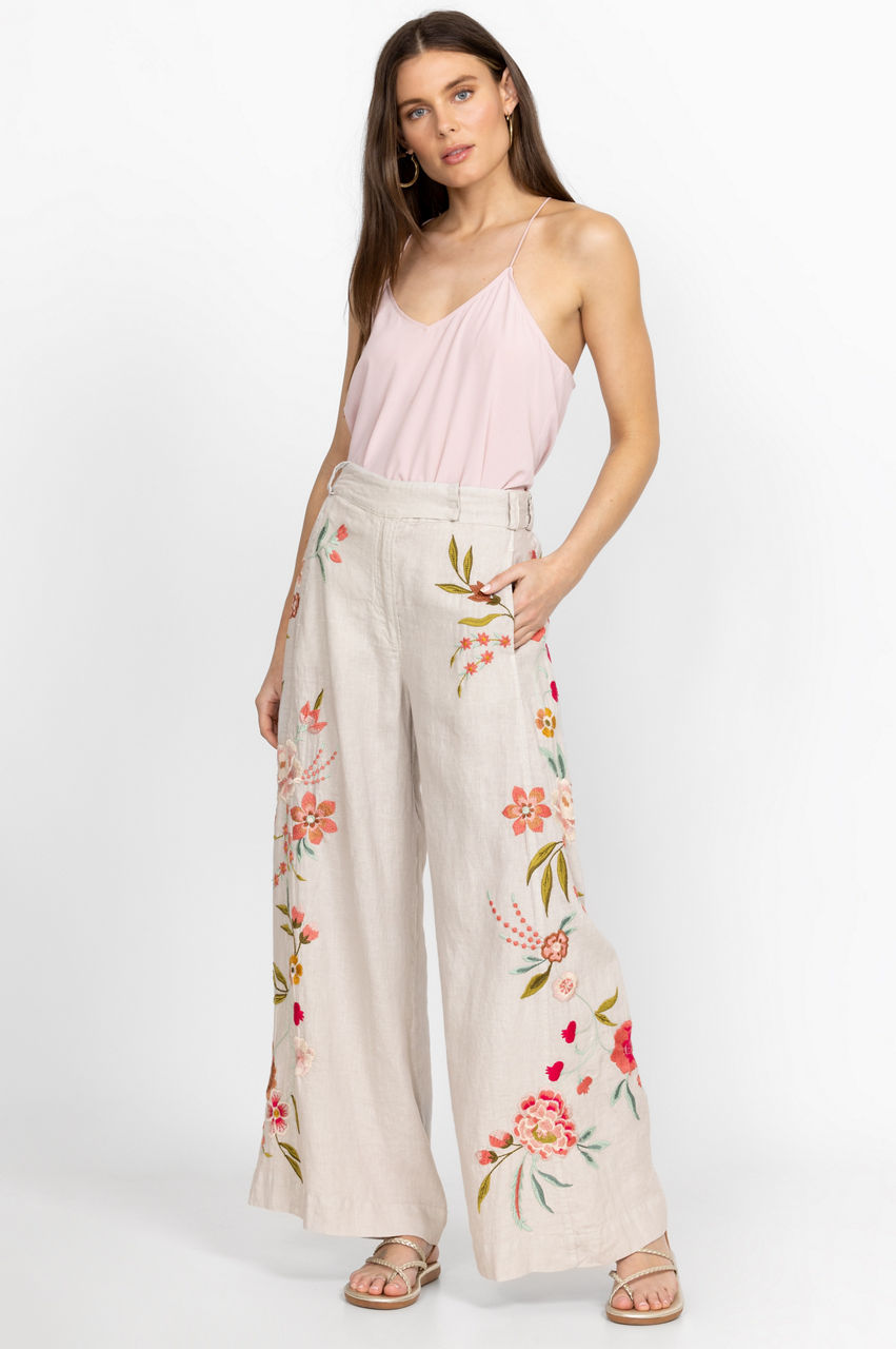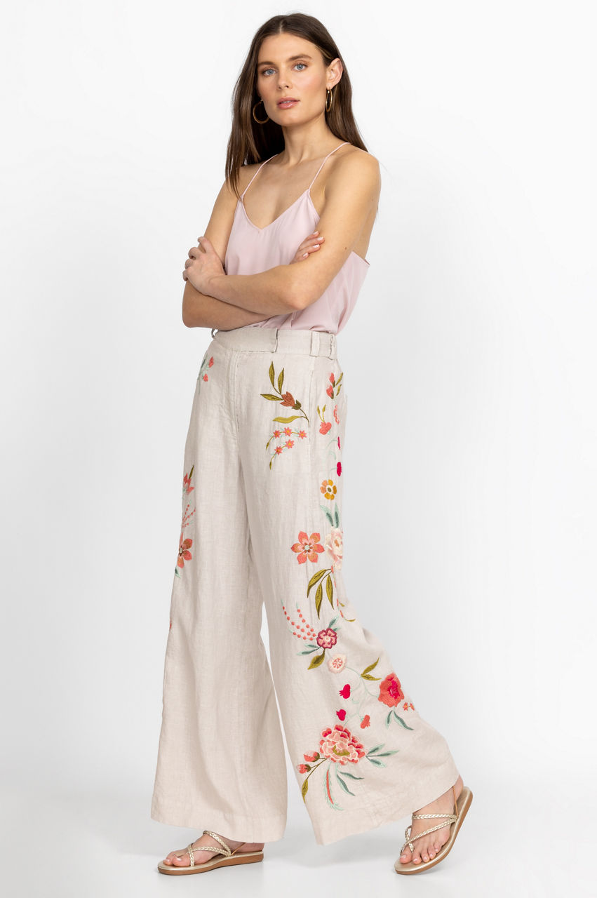 Shaped to a wide leg silhouette, the Joya Wide Leg Linen Pants are the height of effortless daytime fashion. These pants are made from pure linen and boast a zipper fly, an elastic back waistband for a comfortable fit, and a vibrant placement embroidering consisting of opened blooms, which are concentrated at the sides. Keep your look on the sophisticated side by pairing with leather accessories and a silk blouse.