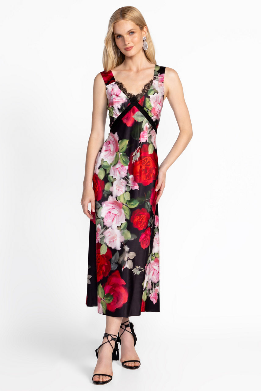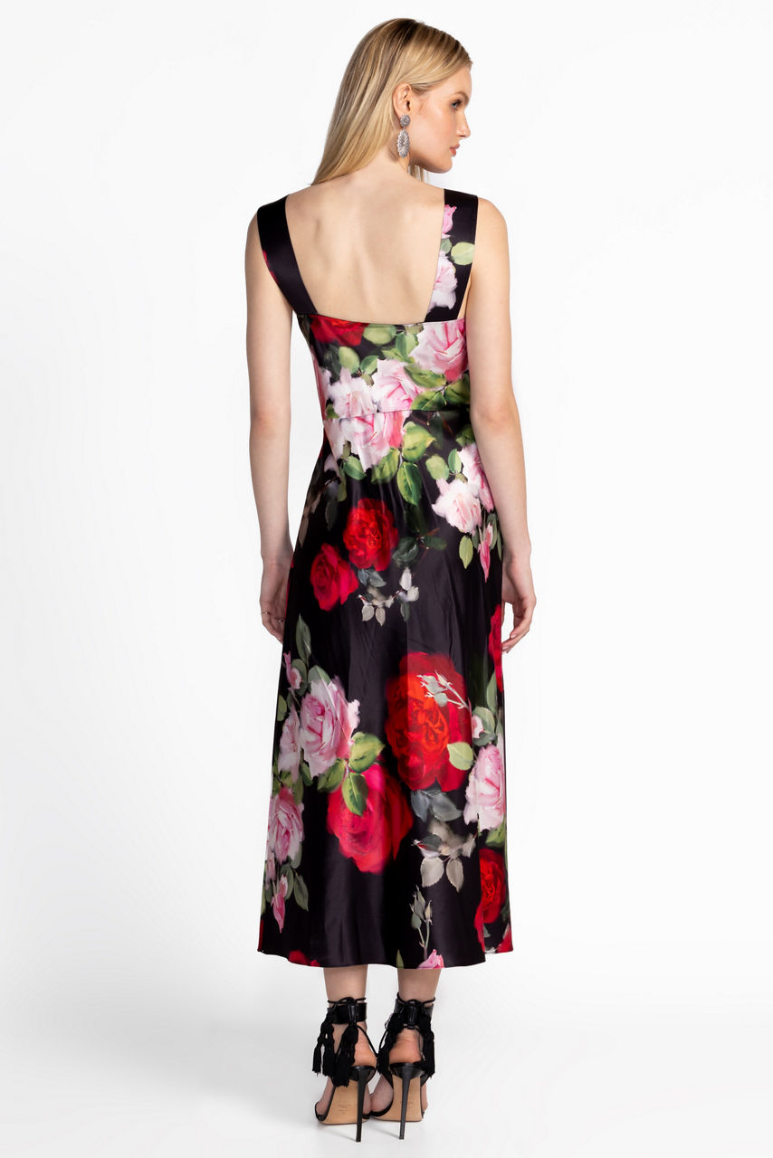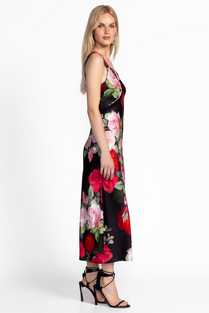 Crafted from a unique silk blend, the Joyelle Slip Midi Dress is adorned with a bold color-rich floral print. Featuring a V-neckline with delicate gathers at the bust, this sleeveless dress is finished with a square back and flowing midi skirt. Pair with black strappy heels and a sparkling clutch for a night out.