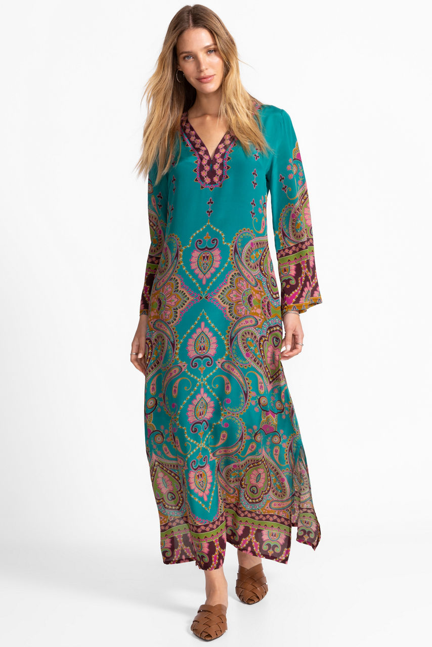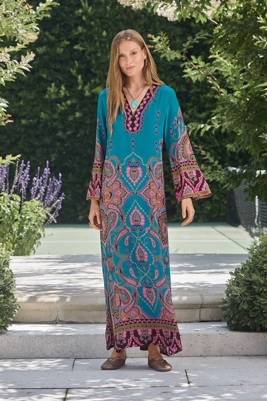 Crafted from 100% flowing silk, the Judith Dress is adorned with an ornate pattern washed in rich color. Designed with a split V-neckline and bell sleeves, this slip-lined dress is finished with side slits and contrasting accents at the hemline. Pair with strappy heels and statement jewelry for a bold, eclectic look.