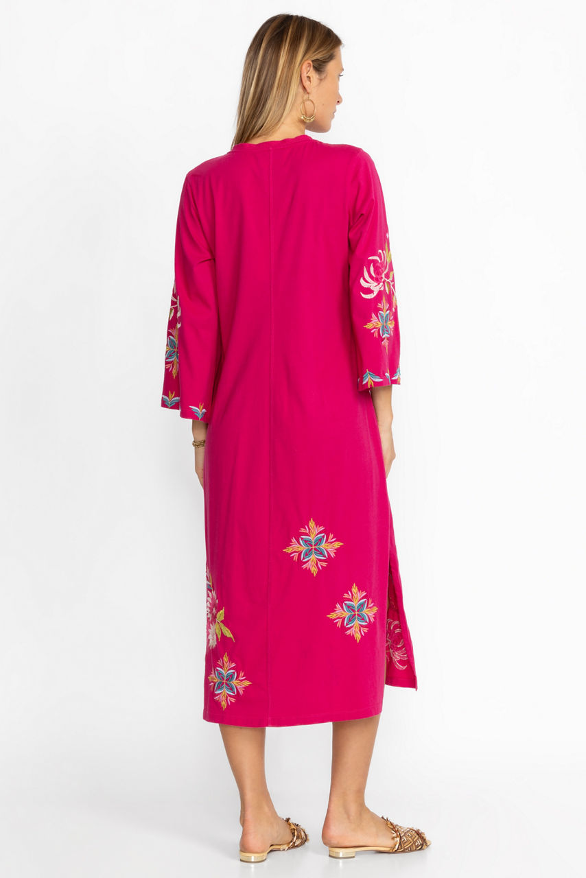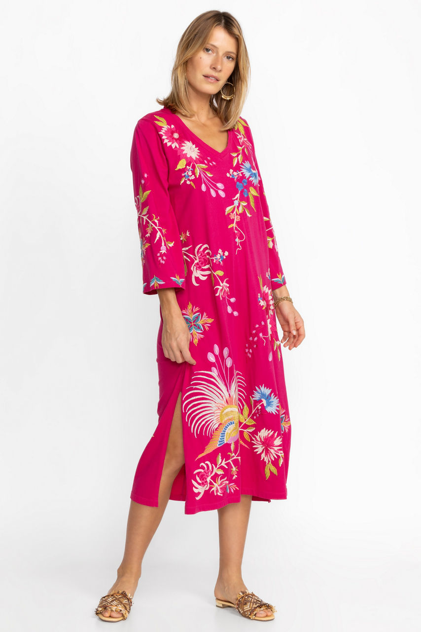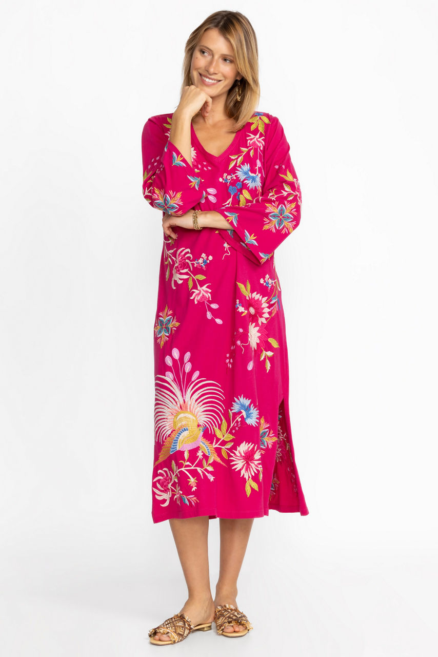 Delivering classic elegance in distinctive casual wear, the Julie Kimono Sleeve Dress offers both comfort and style. Crafted from 100% cotton and beautifully detailed with intricate placement embroidery, this maxi dress features an open V-neckline and flowing kimono style sleeves. Pair with strappy sandals and festive jewelry for a complete look.