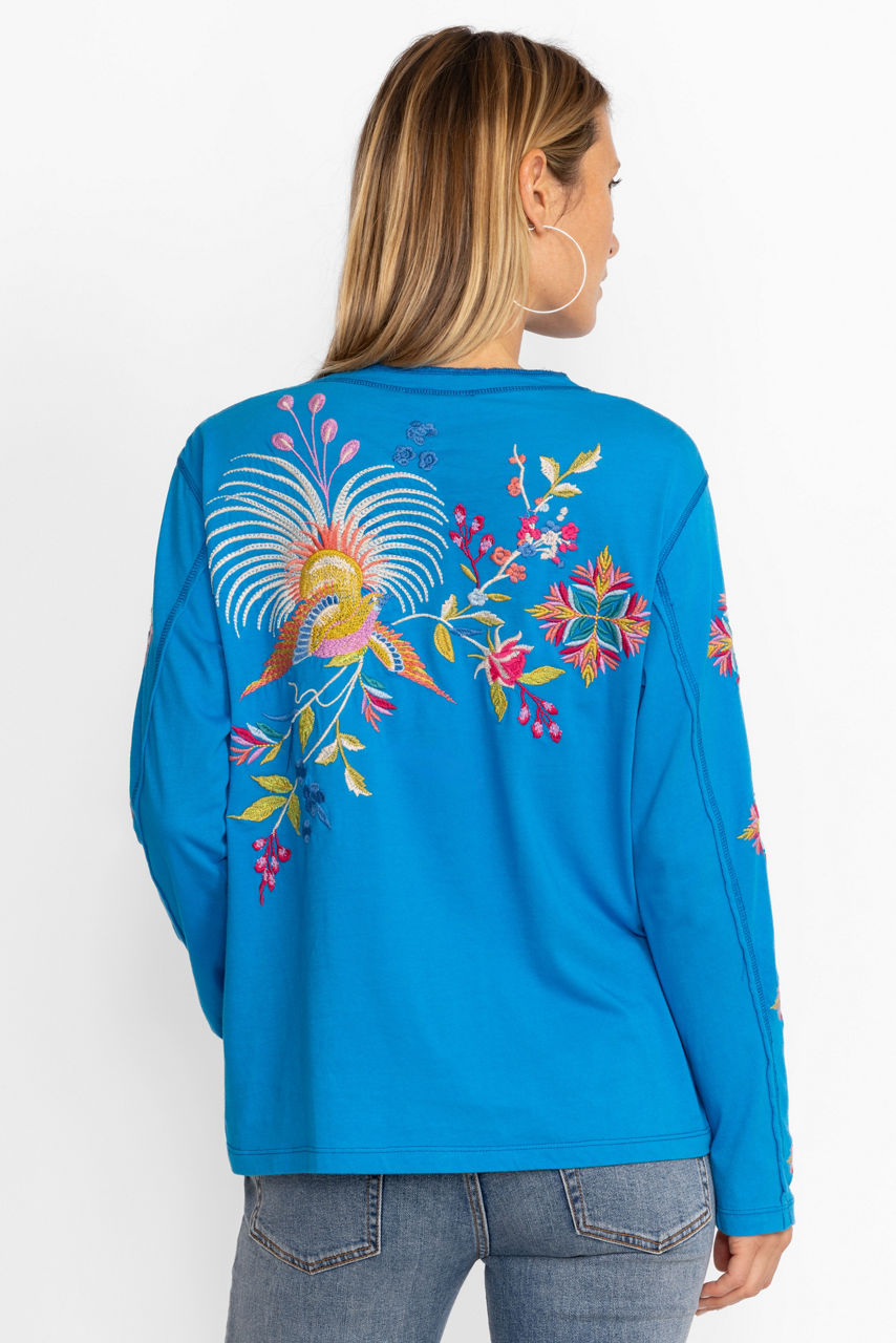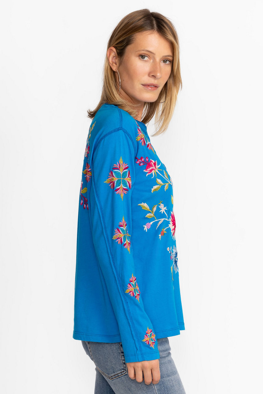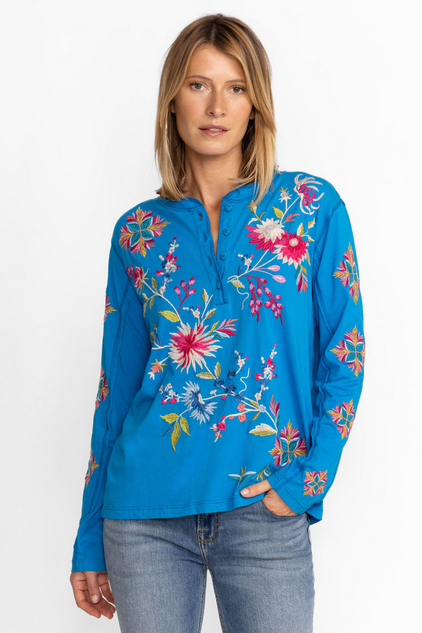 Pairing casual comfort with a touch of whimsy, Julie Raw Seam Henley offers vibrant color to your everyday wardrobe. Crafted from 100% cotton and adorned with thread covered buttons, this casual top is embellished with eye-catching placement embroidery. Pair with a denim skirt and fashion sneakers for a polished weekend look.