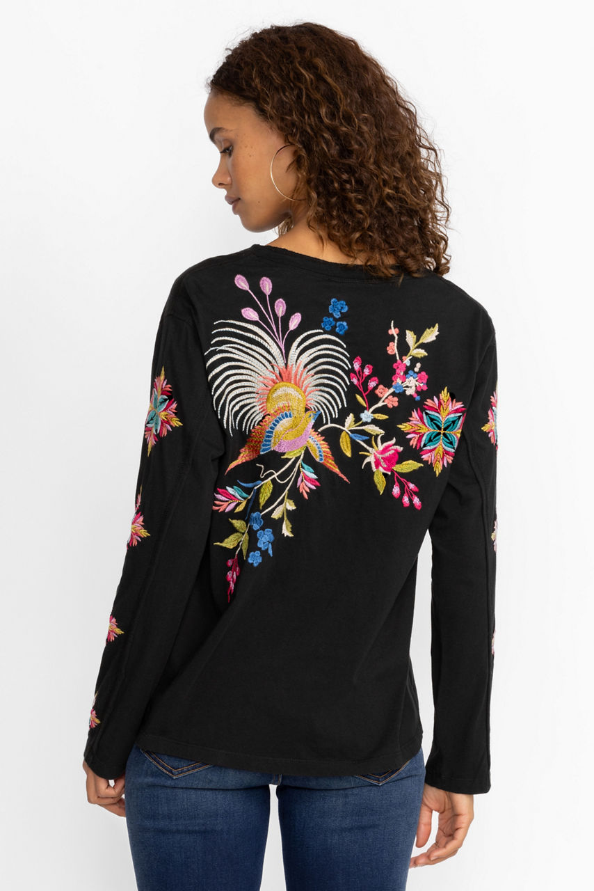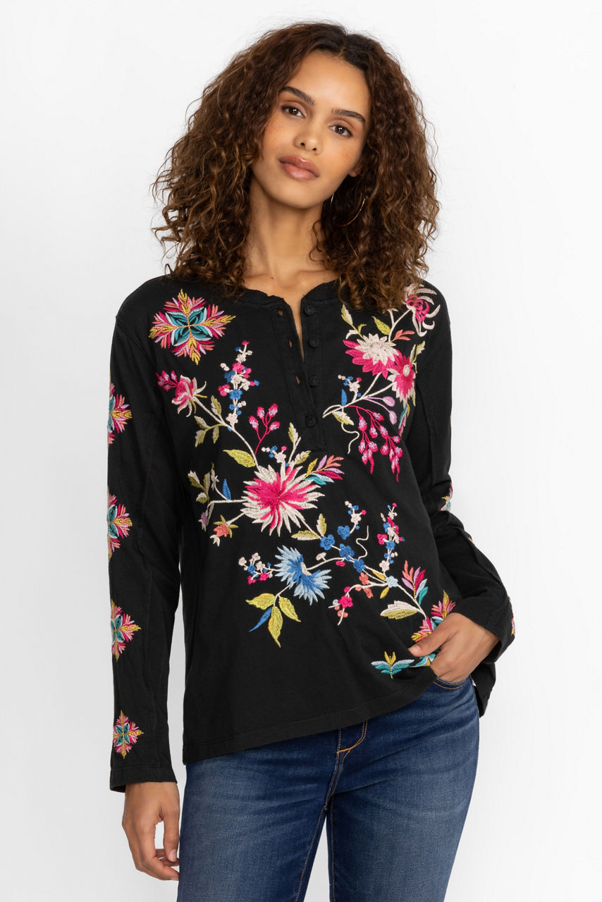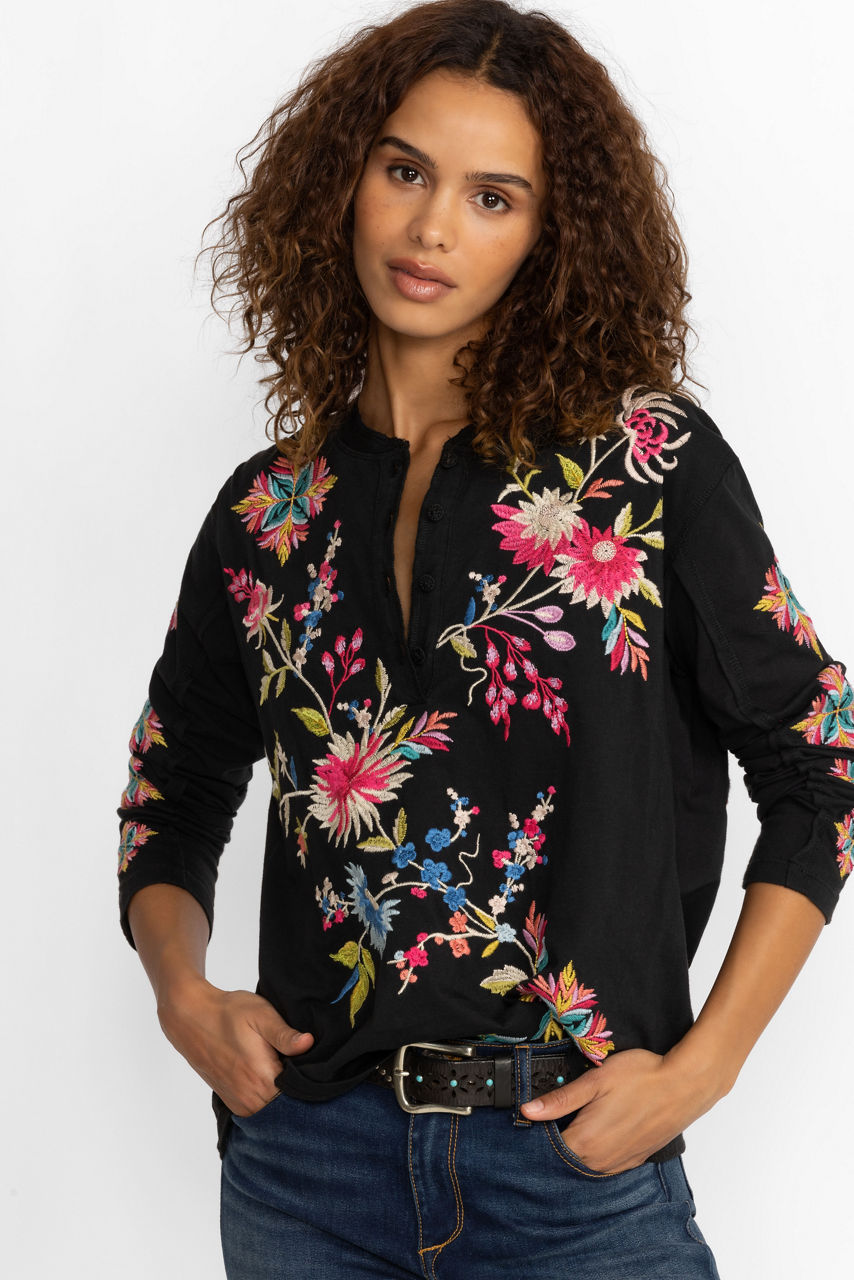 Pairing casual comfort with a touch of whimsy, Julie Raw Seam Henley offers vibrant color to your everyday wardrobe. Crafted from 100% cotton and adorned with thread covered buttons, this casual top is embellished with eye-catching placement embroidery. Pair with a denim skirt and fashion sneakers for a polished weekend look.