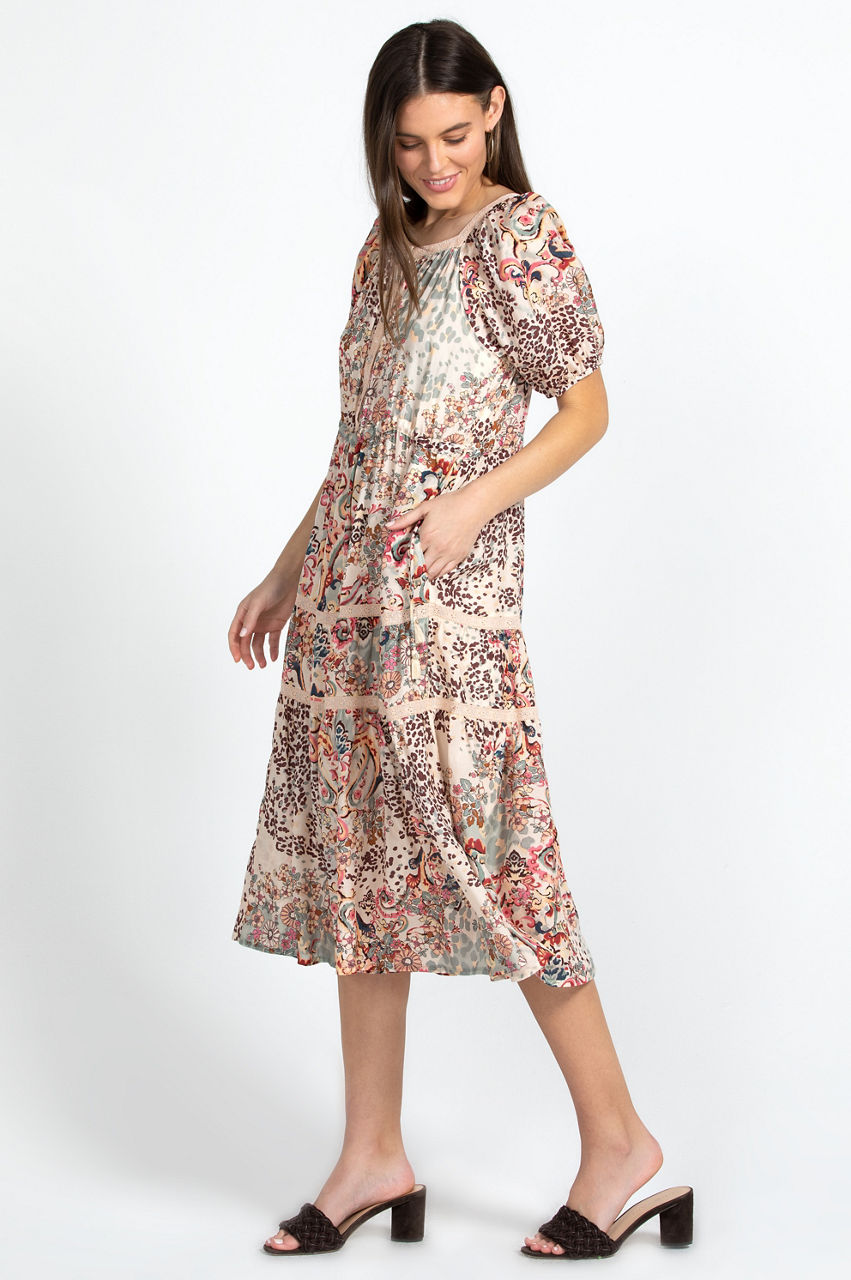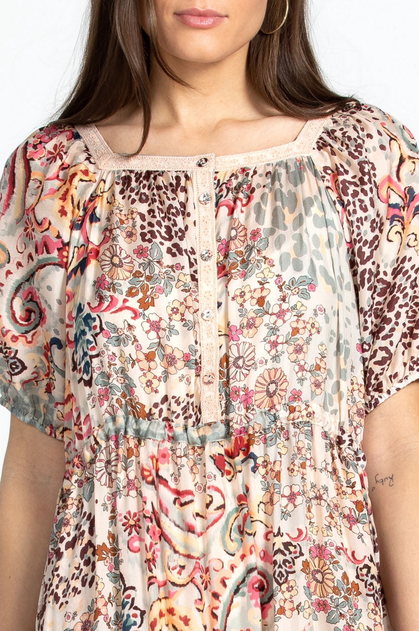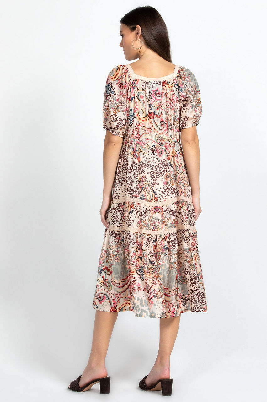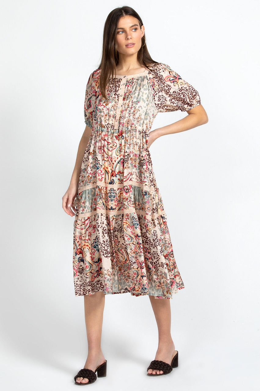 A hypnotic interplay of flora and fauna, the Jungle Paisley Zenovia Dress turns to the natural world for inspiration. Unapologetically feminine, this dress is spun from lustrous silk and characterized by a square neck, short puff sleeves, a tiered skirt, and an eclectic floral and animal print. Finished with a drawstring waist to shape the silhouette, this dress is a fashion-forward piece for sun-filled days.