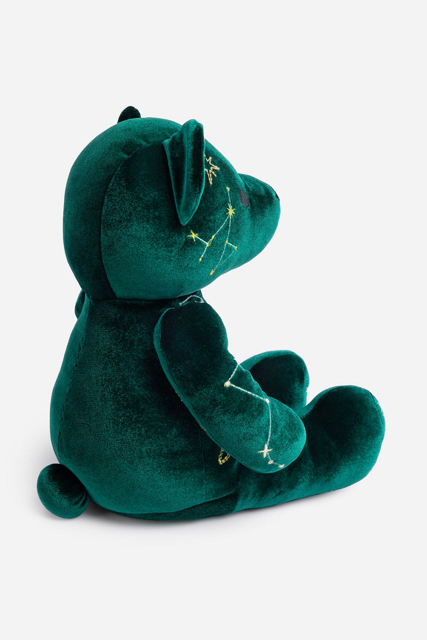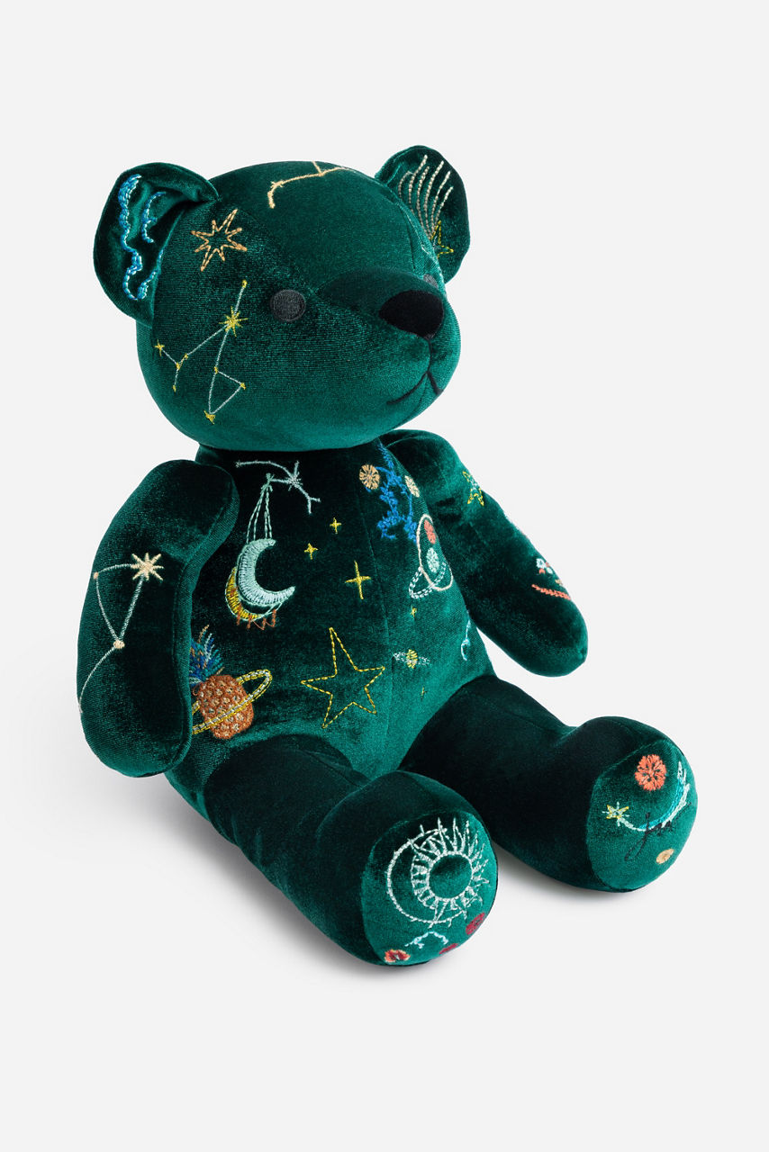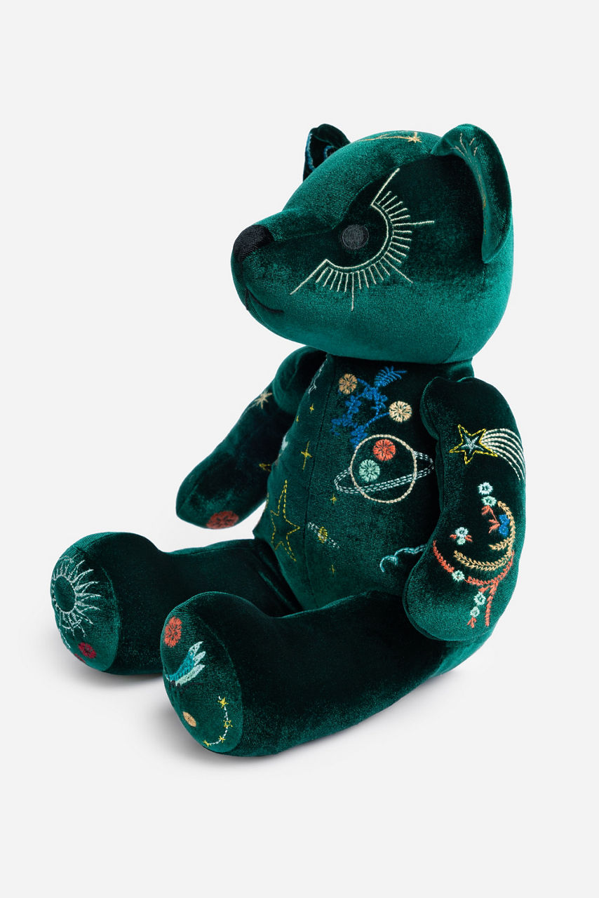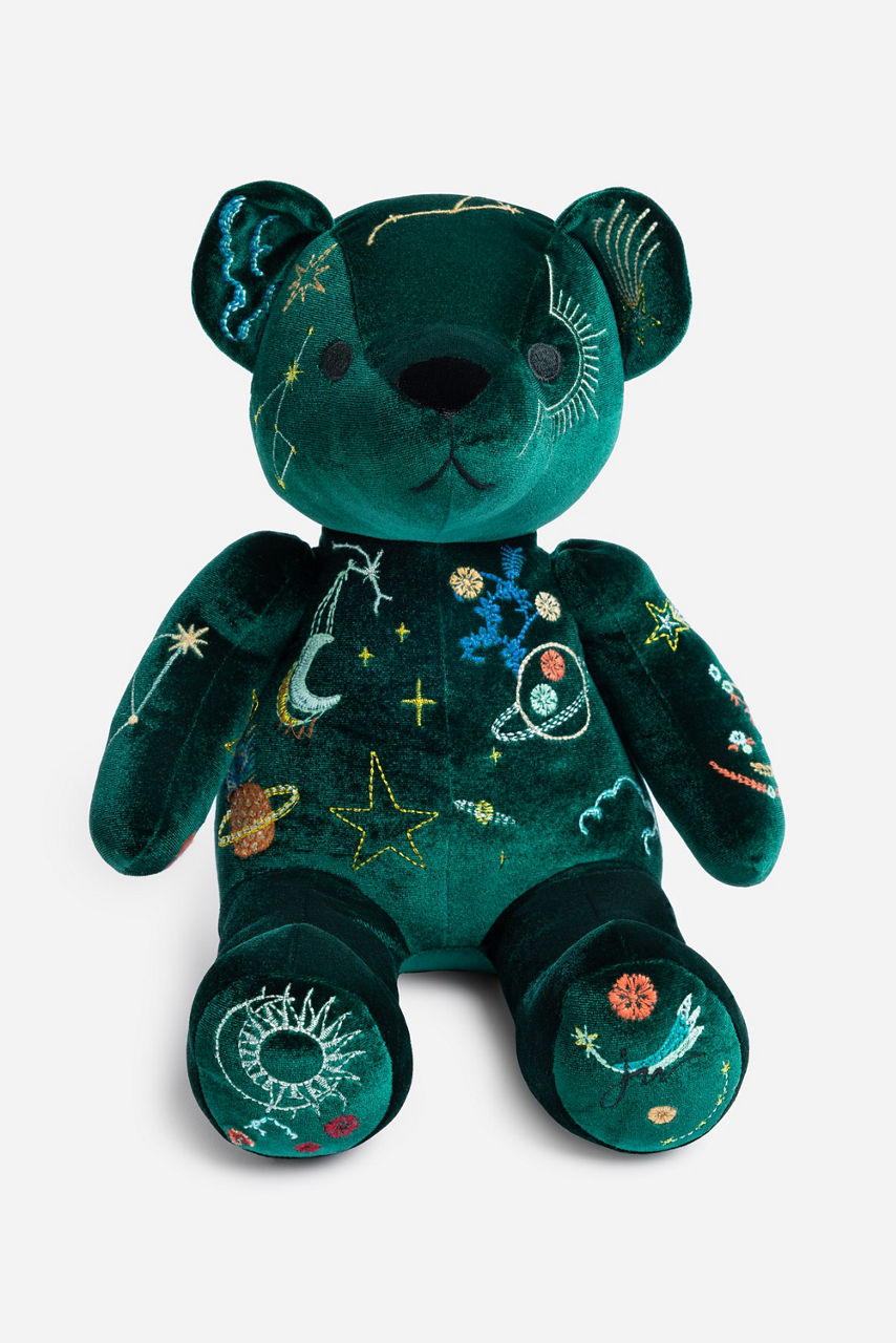Carefully crafted from dreamy emerald velvet, the Celestin Embroidered Velvet Bear adds a touch of whimsy to your home decor. Available in plush navy and embellished with shimmering celestial-themed embroidery, our holiday teddy bears make elegant and impactful gifts.