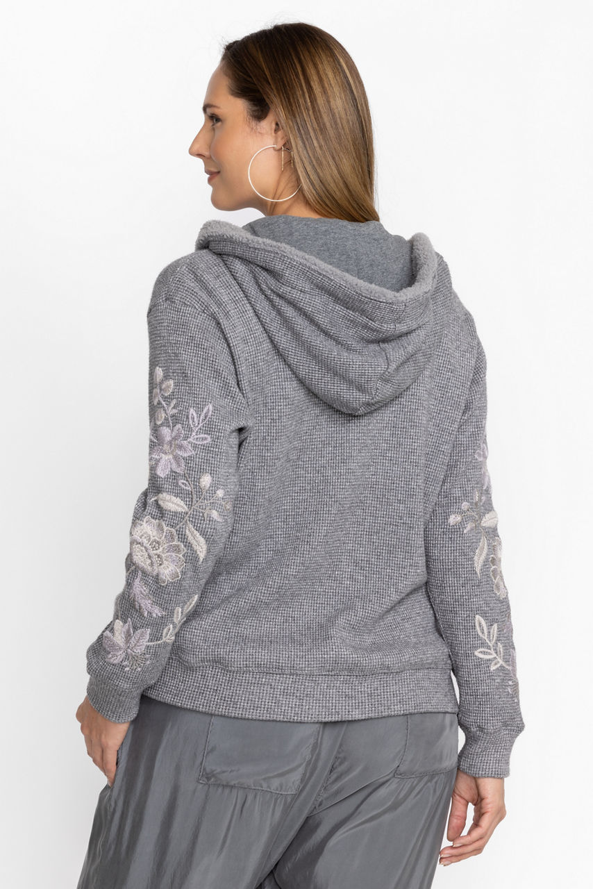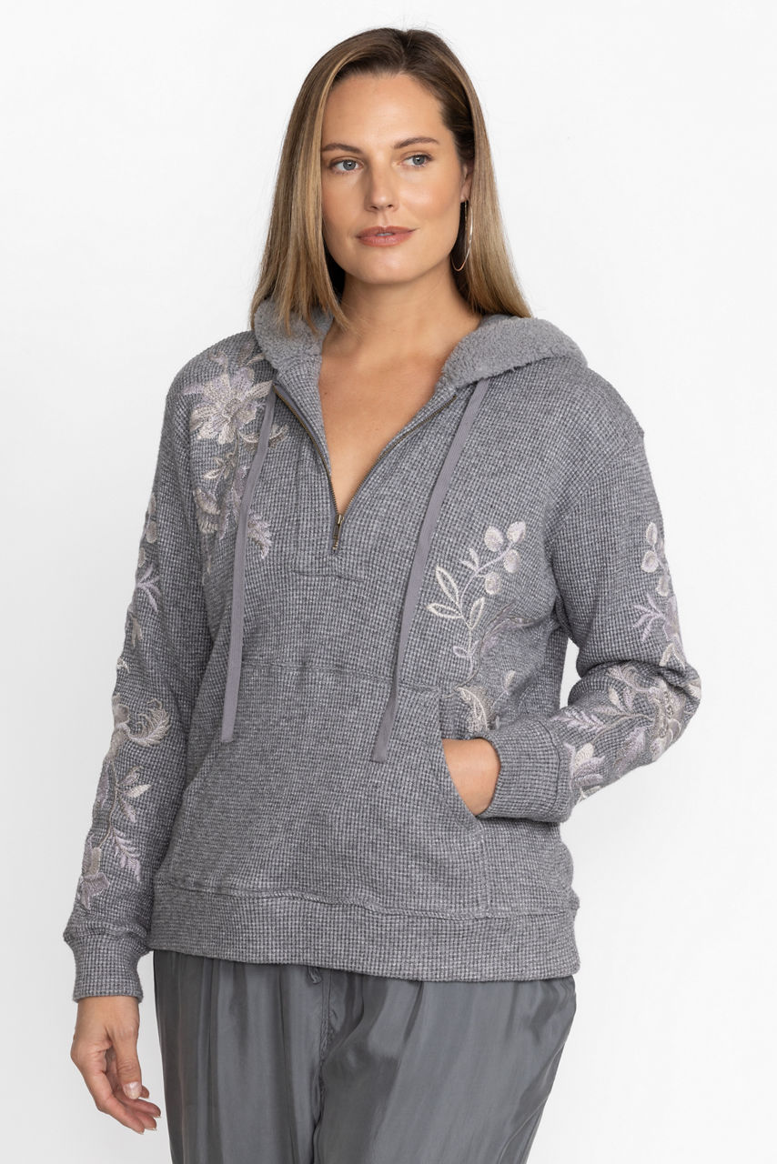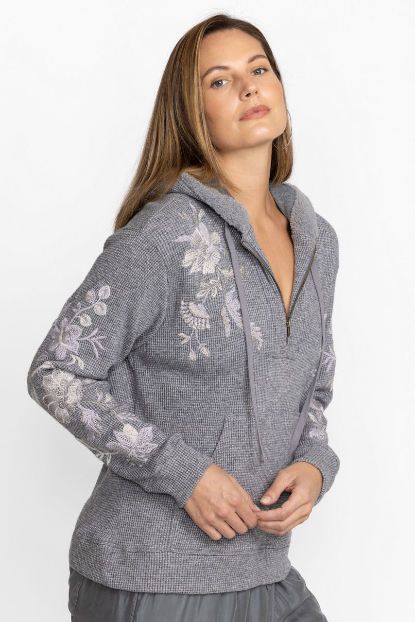 Delivering a cozy option for cooler days, the Junie Metallic Thermal Hoodie offers a glittering take on elevated casual wear. Expertly detailed with delicate floral embroidery, this comfortable half-zip pullover features a front patch pocket and attached hood with drawstring. Pair with relaxed denim and ankle boots for a cozy cold-weather option.