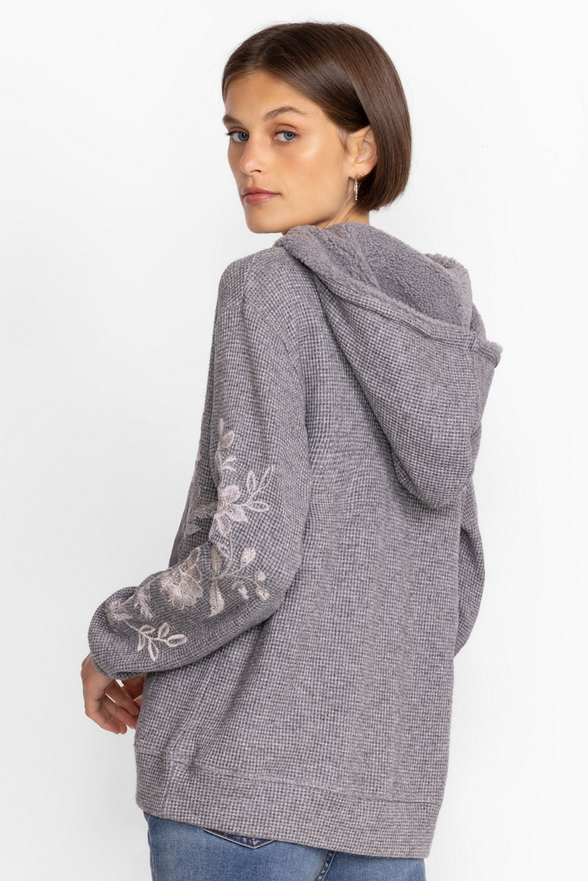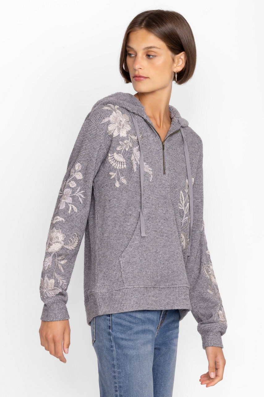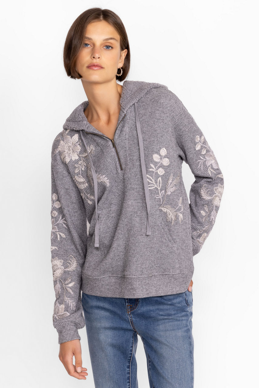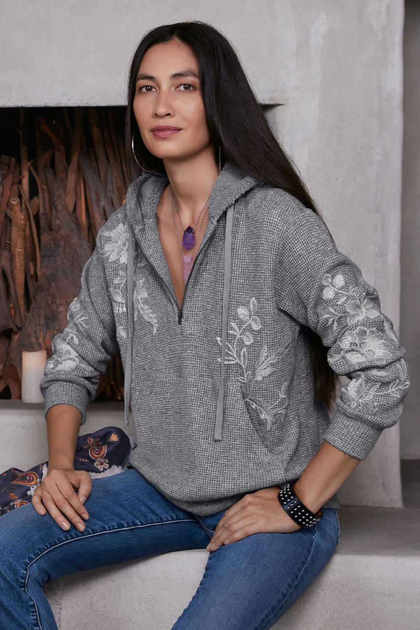 Delivering a cozy option for cooler days, the Junie Metallic Thermal Hoodie offers a glittering take on elevated casual wear. Expertly detailed with delicate floral embroidery, this comfortable half-zip pullover features a front patch pocket and attached hood with drawstring. Pair with relaxed denim and ankle boots for a cozy cold-weather option.