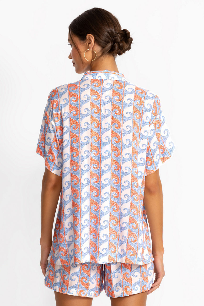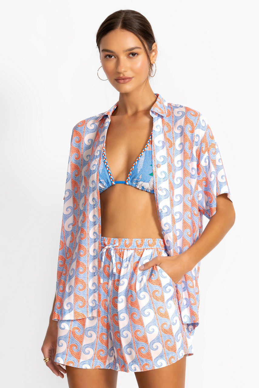 Adorned with the vibrant Circes Wave pattern by Paolita, the JW X Paolita Camp Shirt is enriched with vibrant color. Crafted with a classic collared button front, this camp shirt features a drop shoulder and side slits for a relaxed fit. Combine with the JW X Paolita Easy Shorts for a perfectly paired resort look.