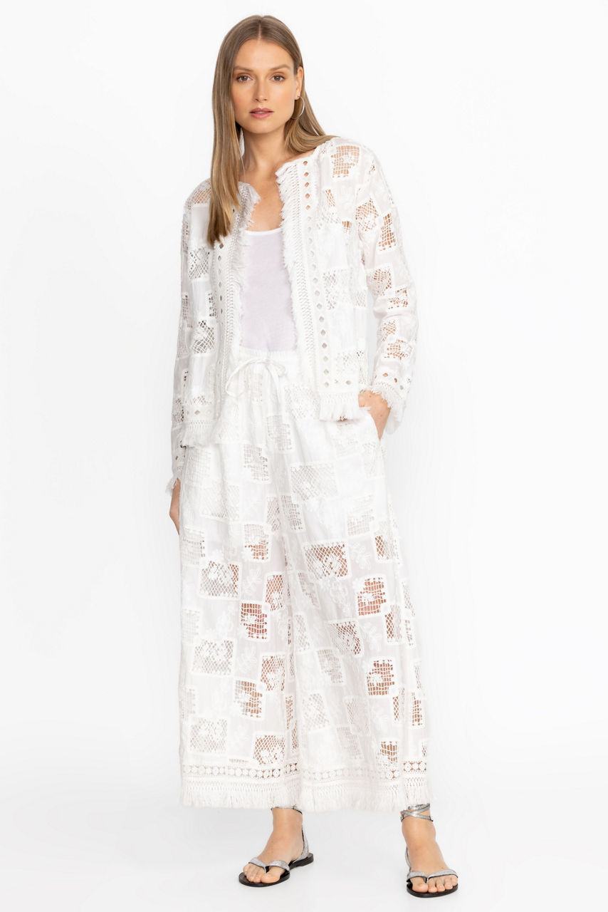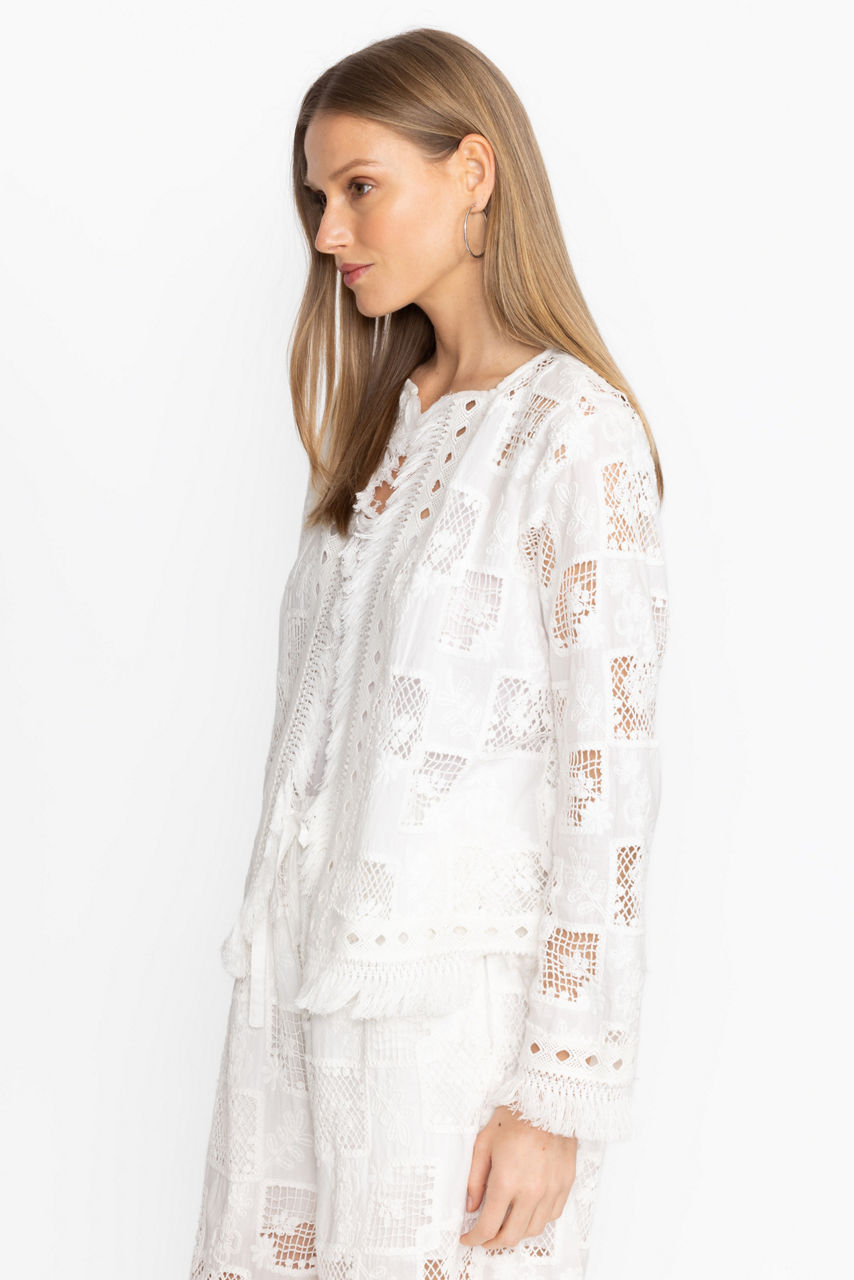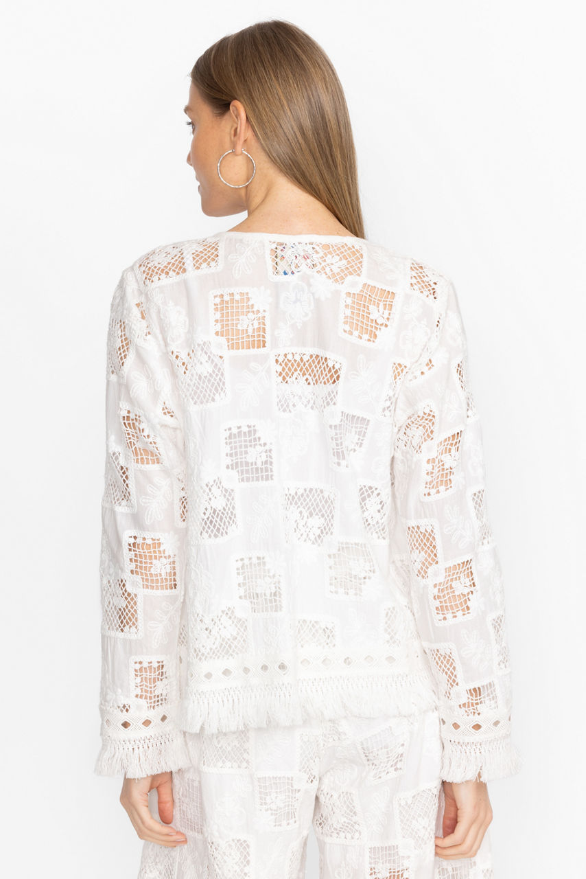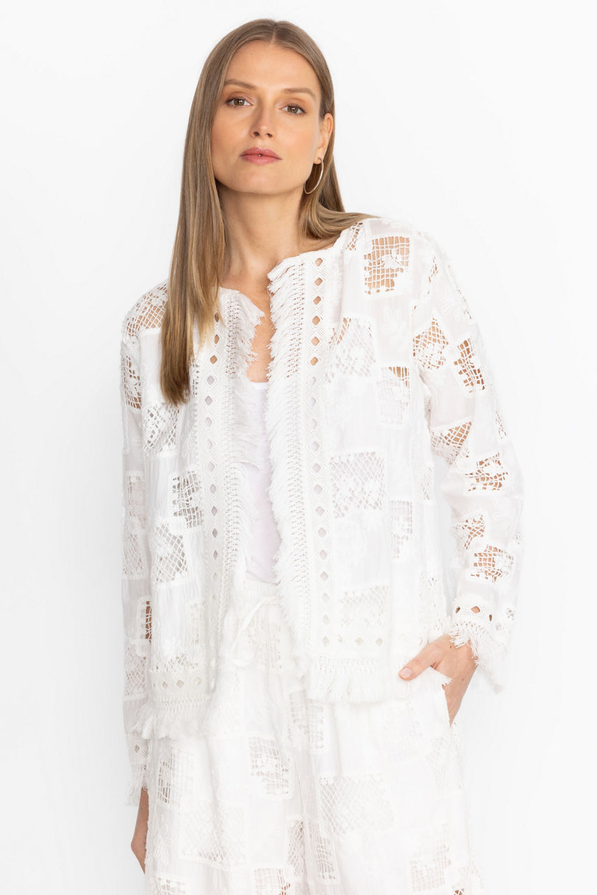 Crafted from 100% breathable cotton, the Fancy Kae Jacket is an elevated layering piece. Featuring an open front trimmed with fringe detailing, this jacket offers a tone-on-tone pattern that creates texture and dimension for a visual interest. Layer over the Etta Silk Cami and pair with your favorite denim for an evening out with friends.