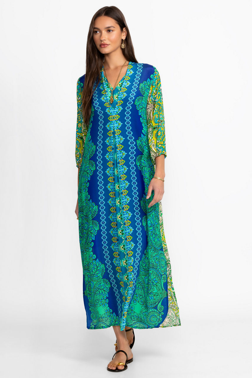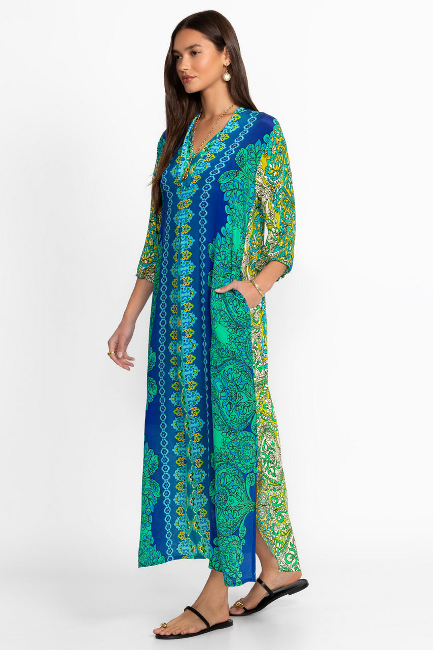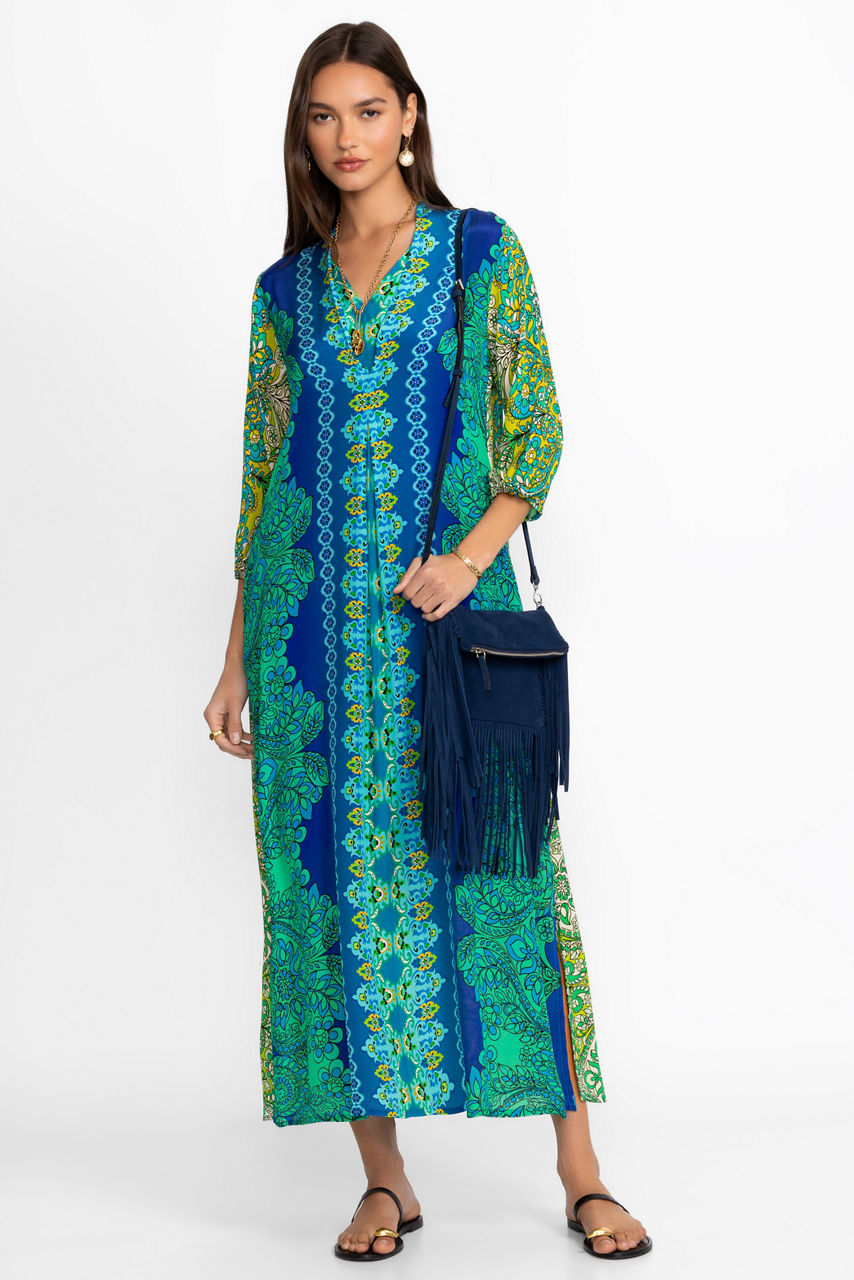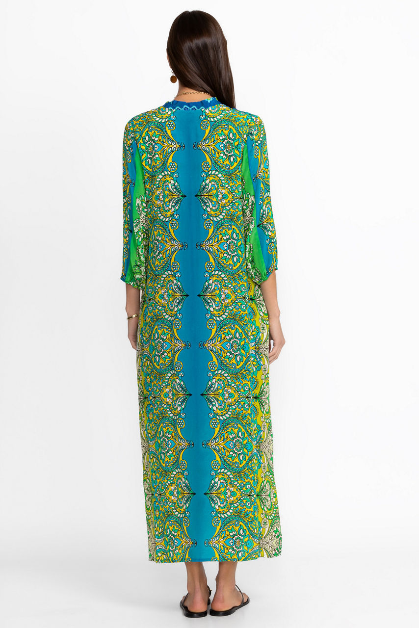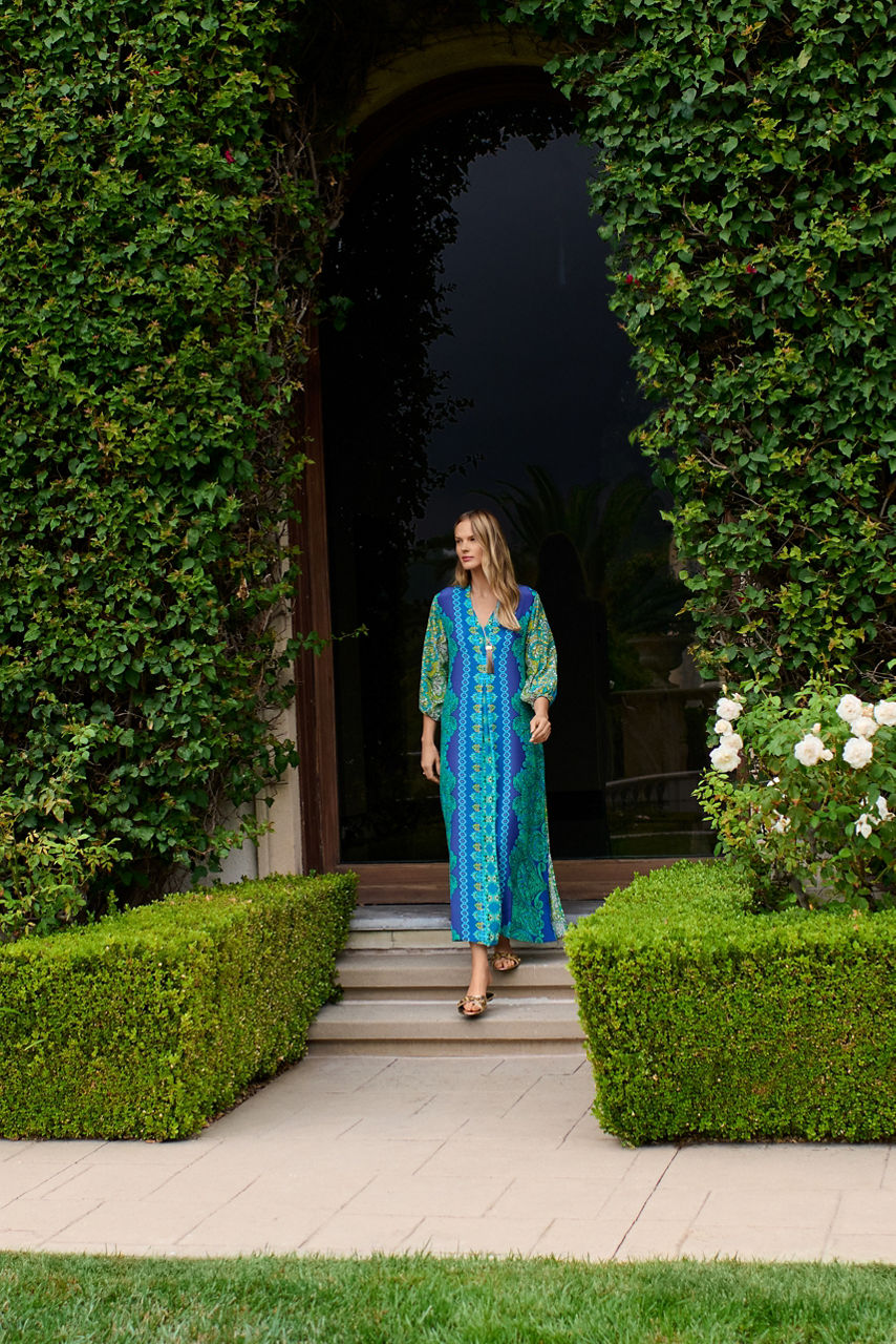 Washed in vibrant hues of blue and green, the Kahinu Dress is embellished with ornate eye-catching patterns. Crafted from sumptuous 100% silk, this bold dress features a V-neckline with an inverted pleat and is finished with gently puffed Bishop sleeves and side slits for a relaxed fit. Pair with sandals and bold jewelry for an unforgettable look.