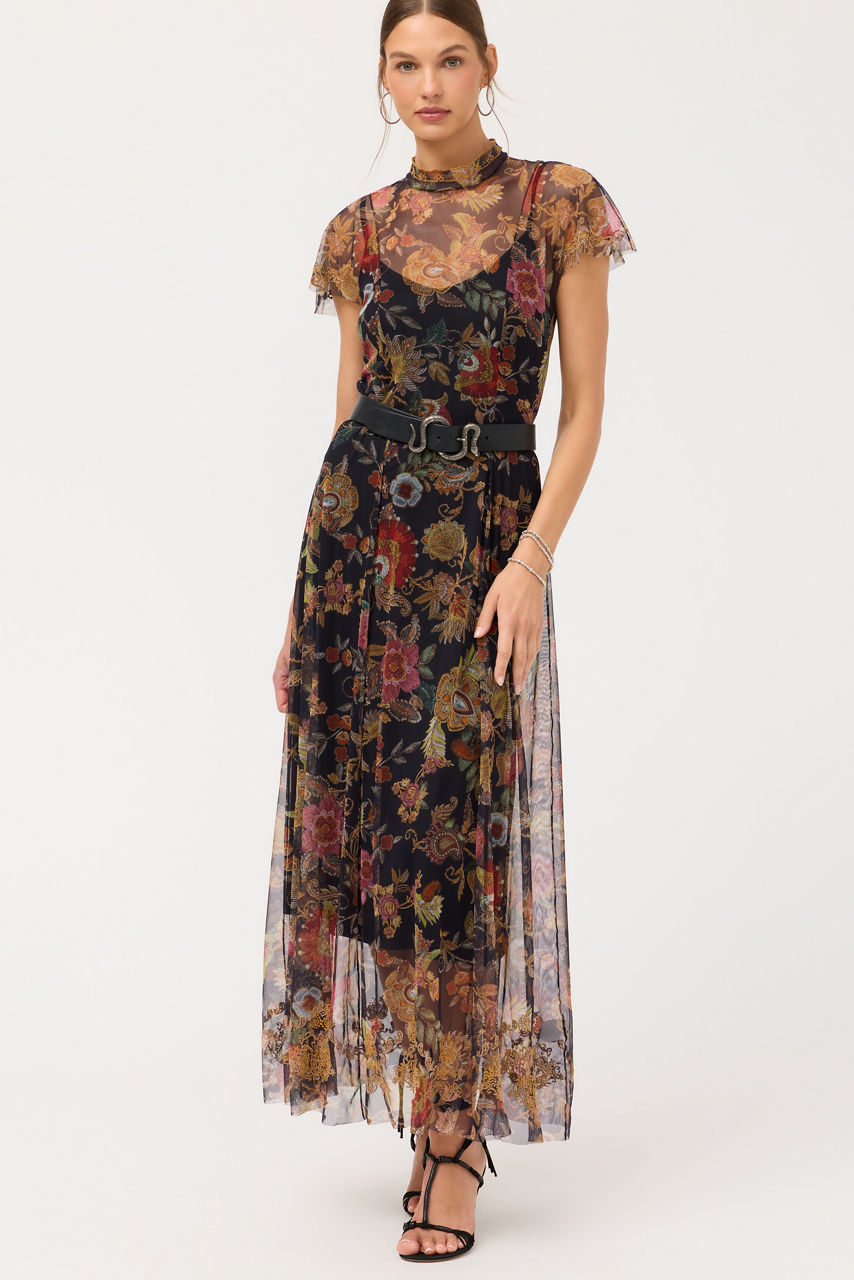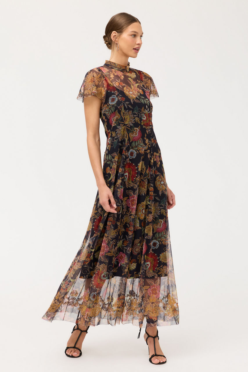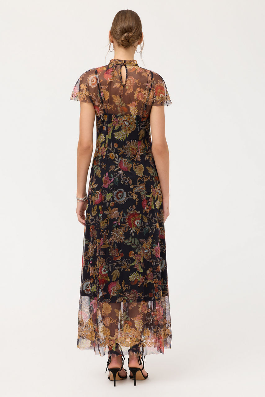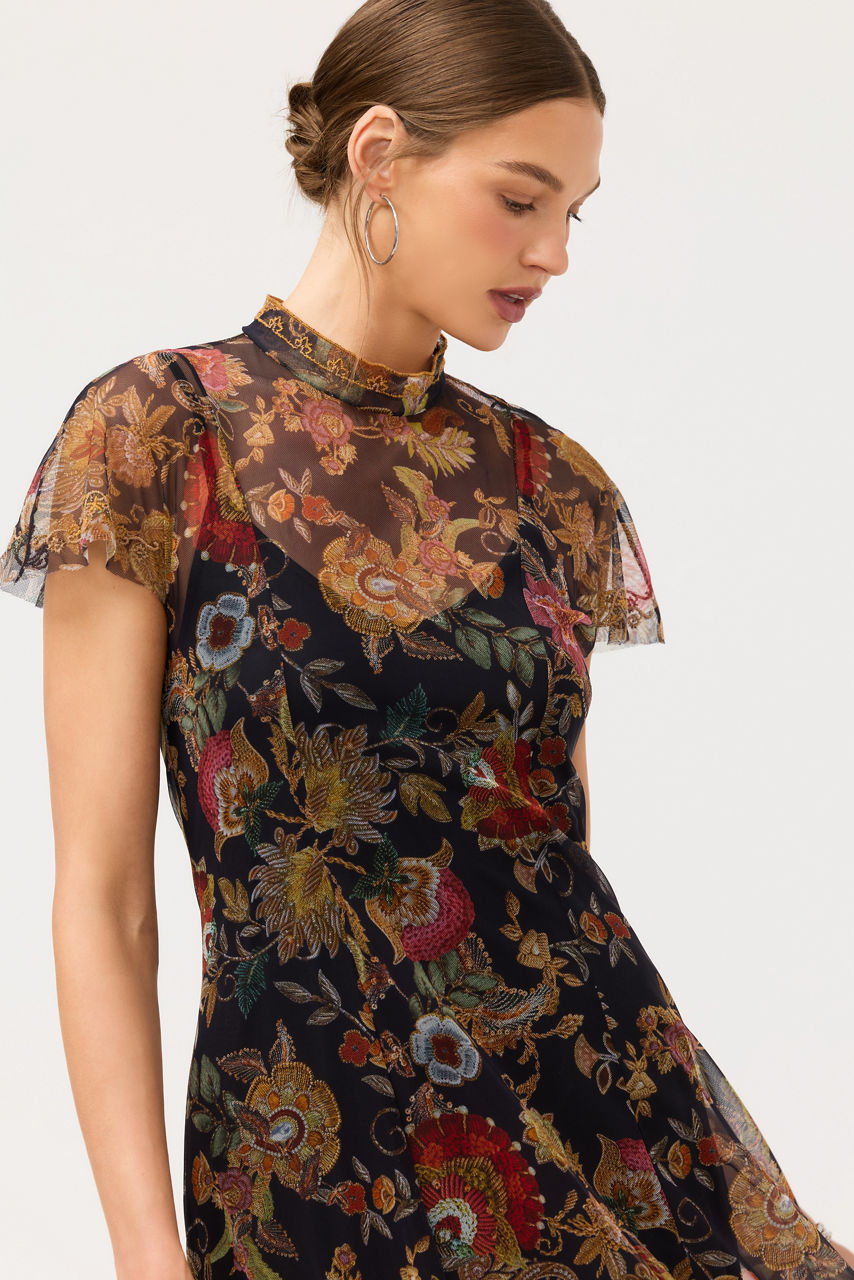 Crafted from a delicate mesh fabric, the Kaimarie Mesh Dress is embellished with rich floral embroidered detailing. Designed with a mock turtleneck and fluttering Dolman sleeves, this elegant slip-lined dress is finished with a back zipper and princess seams. Pair with bold jewelry and a coordinating clutch for a posh evening event.