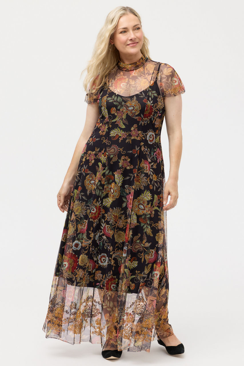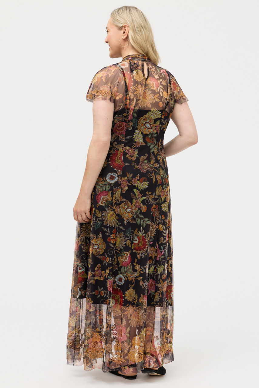 Crafted from a delicate mesh fabric, the Kaimarie Mesh Dress is embellished with rich floral embroidered detailing. Designed with a mock turtleneck and fluttering Dolman sleeves, this elegant slip-lined dress is finished with a back zipper and princess seams. Pair with bold jewelry and a coordinating clutch for a posh evening event.