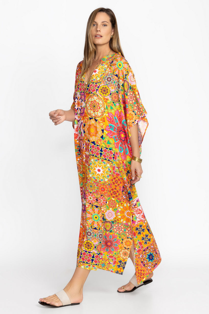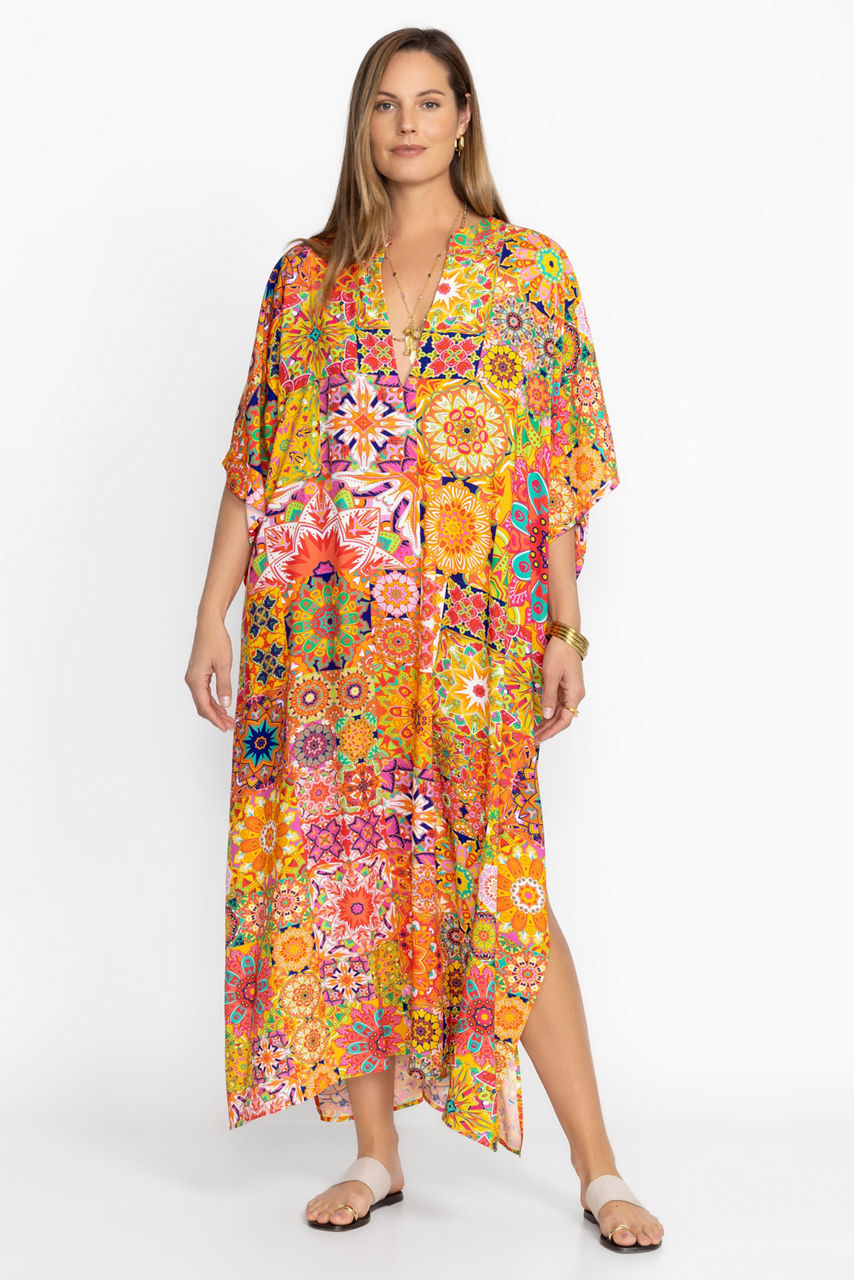 Beautifully detailed with vibrant blooms, the Kaleida Kaftan creates a stunning relaxed silhouette. Thoughtfully designed with a Nehru collar leading to an open V-neckline, this flowing kaftan offers generous sleeves and a maxi length skirt. Layer over Kaleida swimwear and pair with espadrille wedge heels for a polished poolside look.