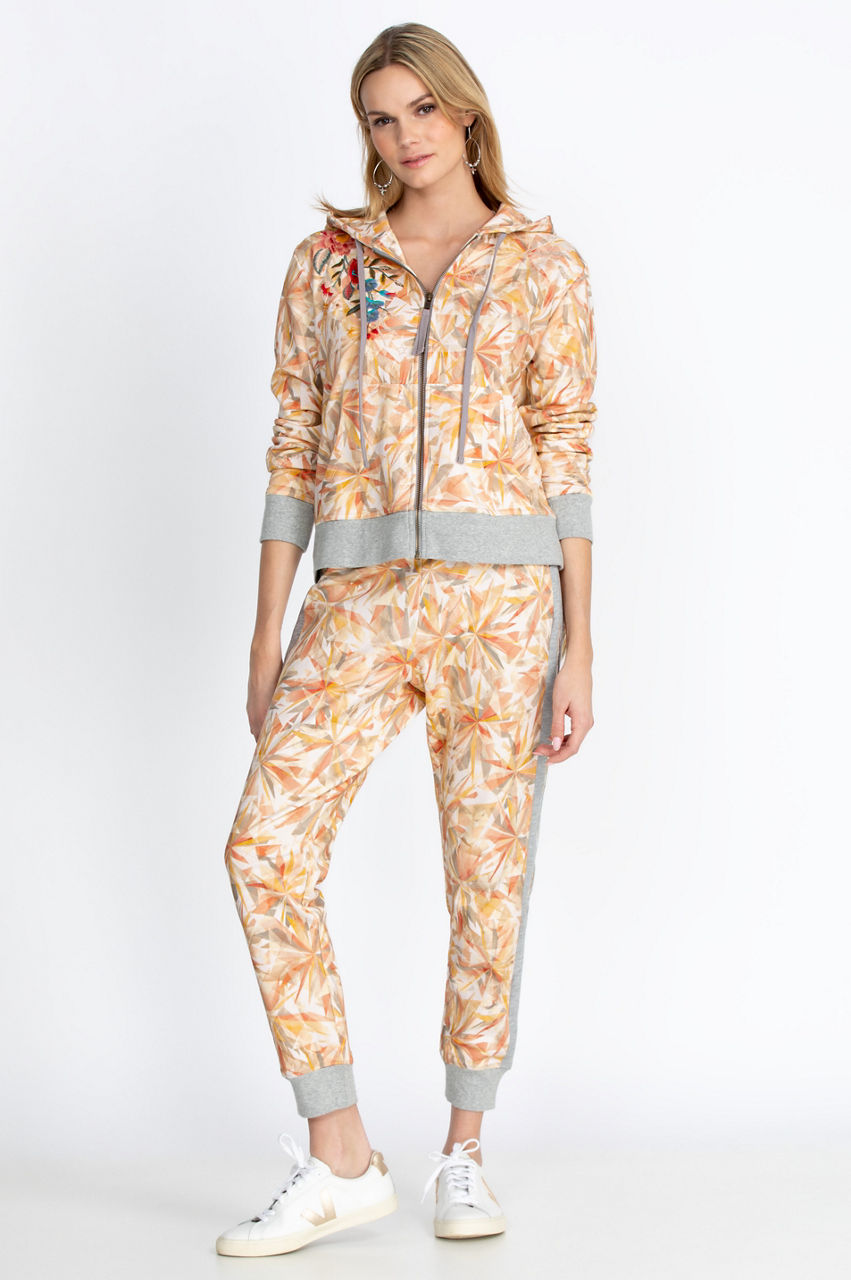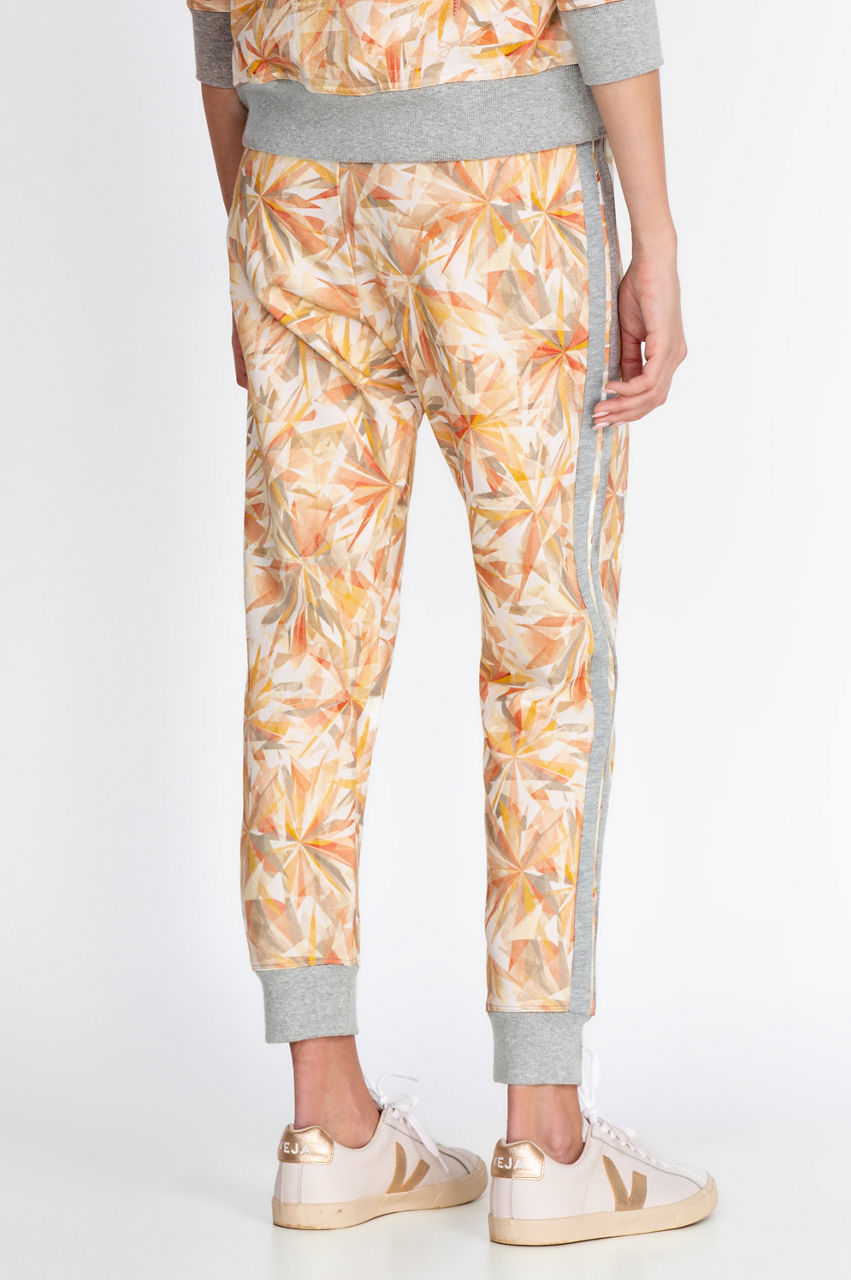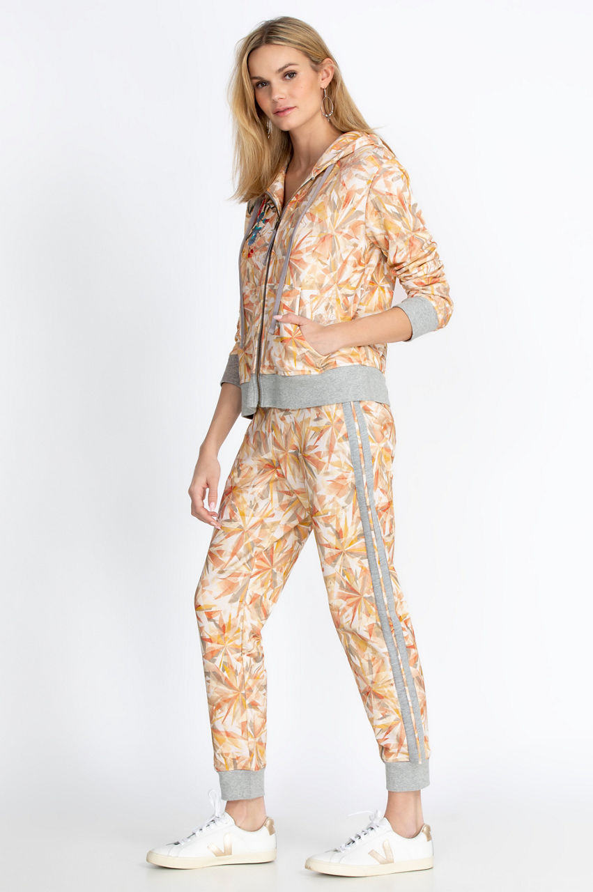 Lounge or work out in style with these comfortable printed sweatpants. The tuxedo-inspired side stripe will add structure to your outfit along with the cuffed ankles. You can pair these soft printed sweatpants with a solid V-neck tee for an active look or create a chic and relaxed outfit by combining these sweatpants with the matching Kaleidoscope Sorbet Modern Zip Up Hoodie.