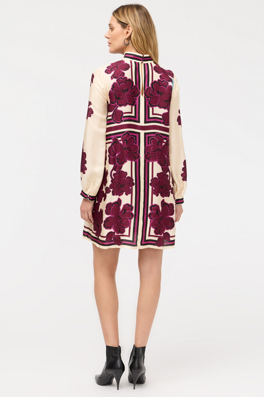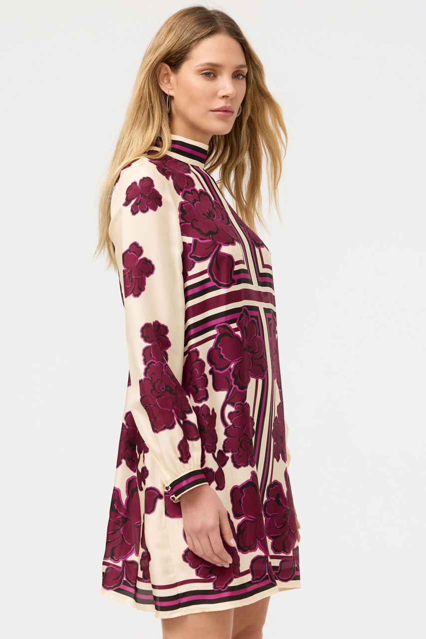 Crafted from a unique silk blend, the Kalova Mini Dress features an elegant scarf print in a blend of aubergine and cream colors. Designed with a standing collar with a keyhole opening at the back, this slip-lined dress is beautifully embellished with a bold floral print. Pair with cream-colored pumps and delicate gold jewelry for a polished daytime event.