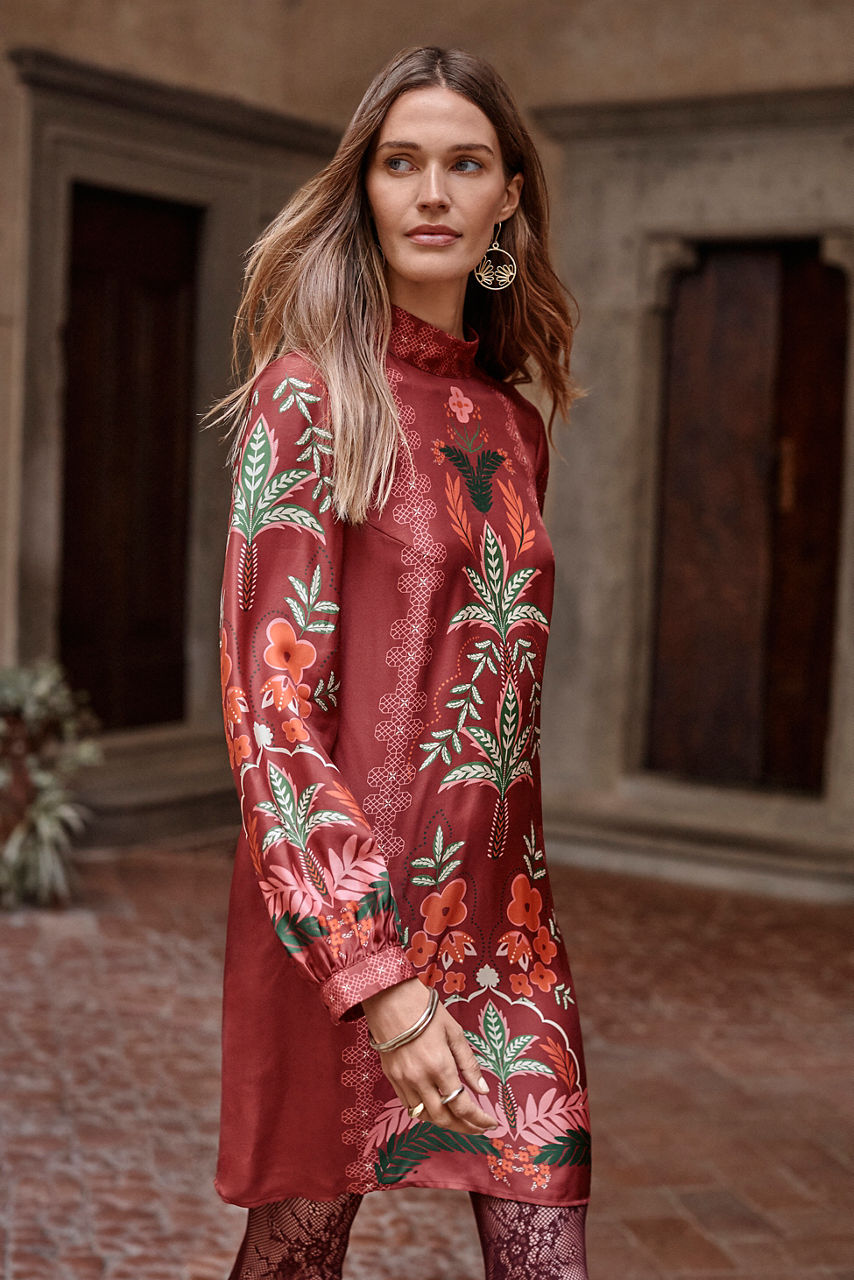 Crafted from a unique silk blend, the Kalova Mini Dress is adorned with bold color and a brilliant floral pattern. Featuring a mandarin collar and long sleeves with gathers at the cuffs, this dress is finished with a relaxed bodice and a keyhole detail at the back. Pair with pumps and ornate gold jewelry for an evening out.