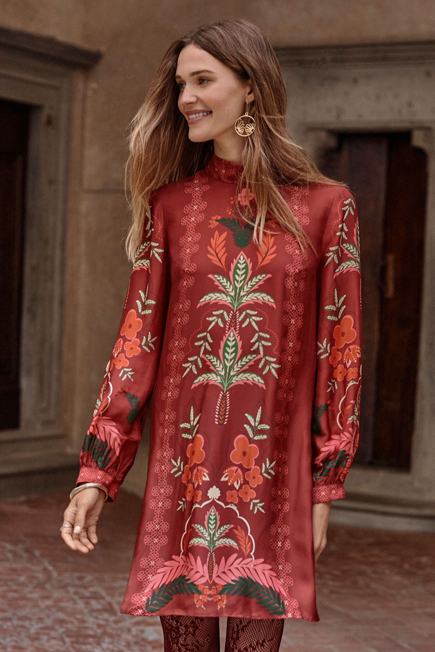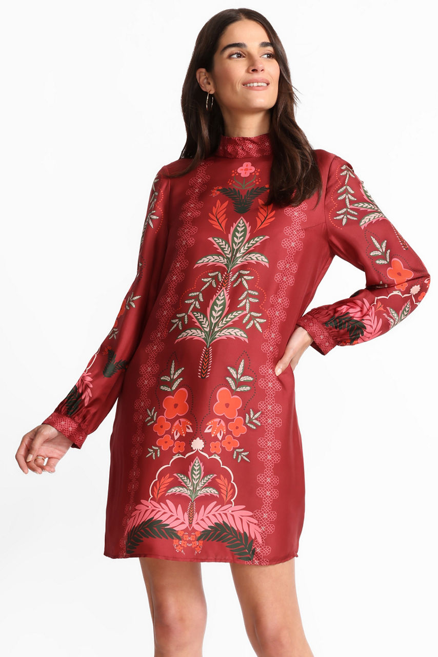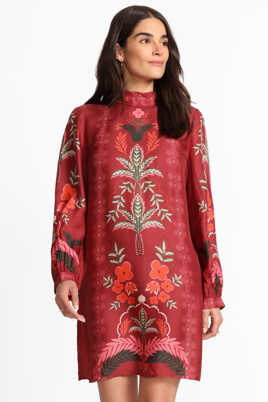 Crafted from a unique silk blend, the Kalova Mini Dress is adorned with bold color and a brilliant floral pattern. Featuring a mandarin collar and long sleeves with gathers at the cuffs, this dress is finished with a relaxed bodice and a keyhole detail at the back. Pair with pumps and ornate gold jewelry for an evening out.